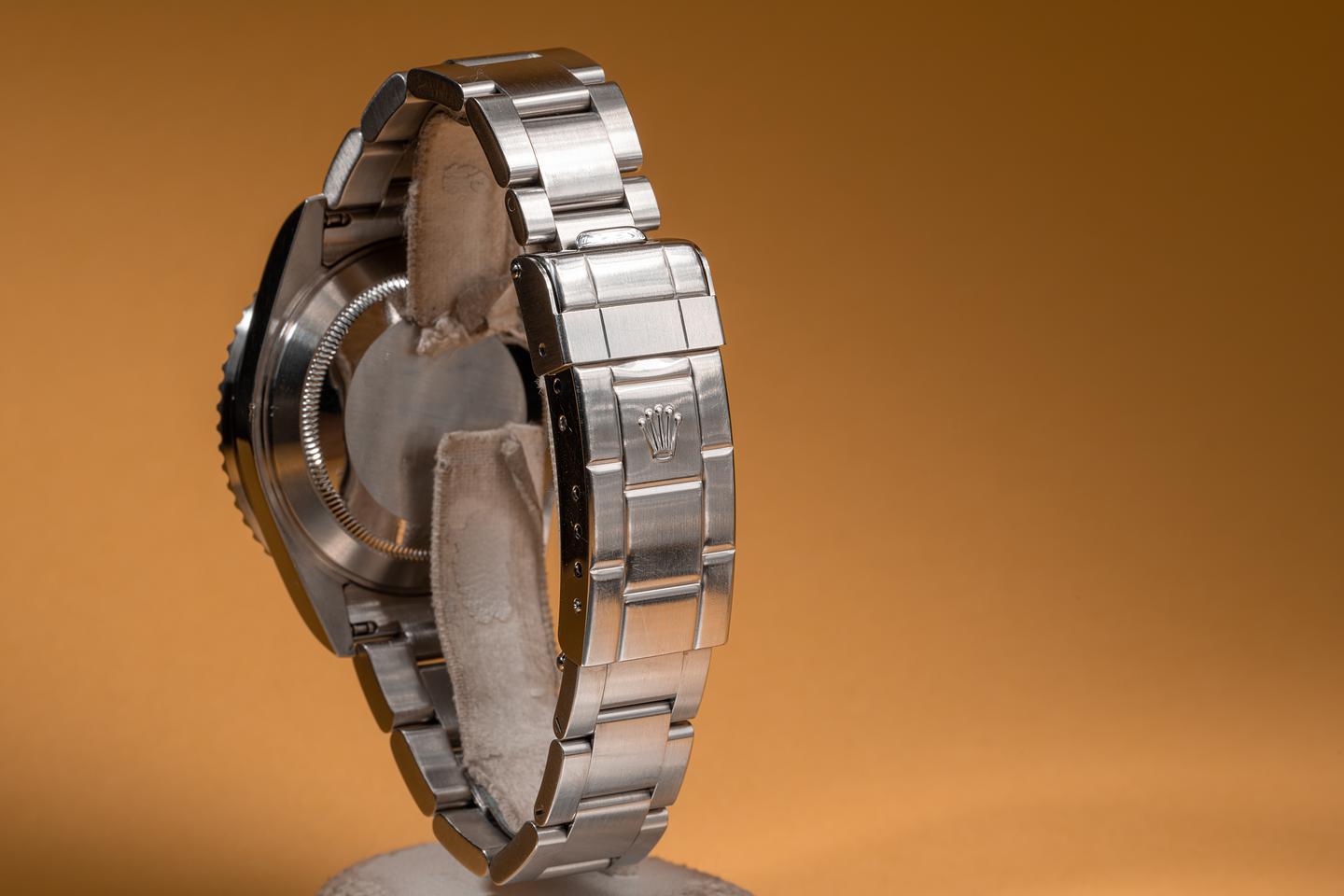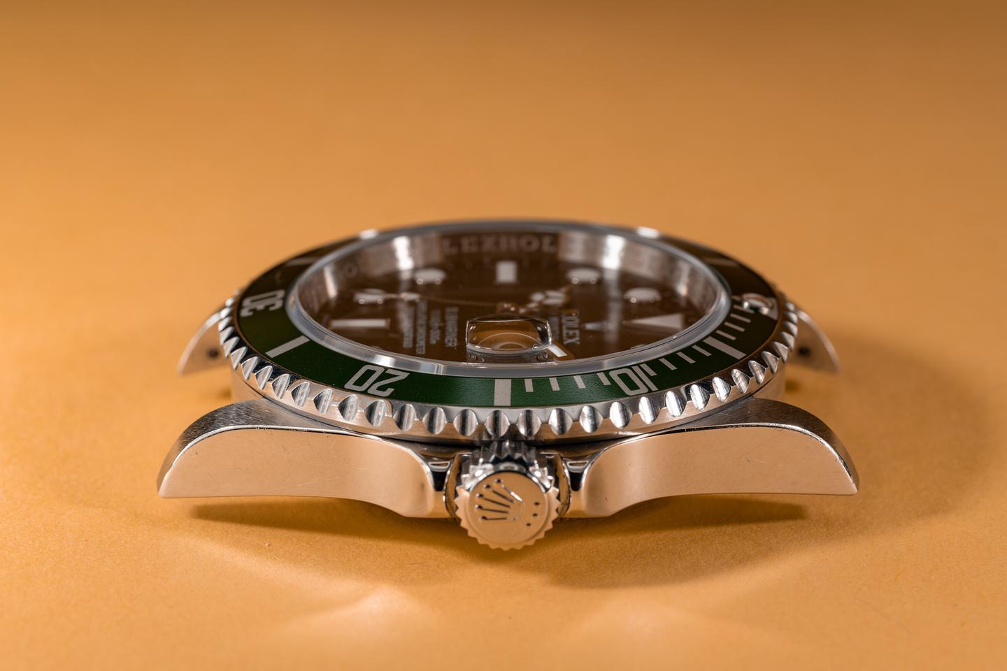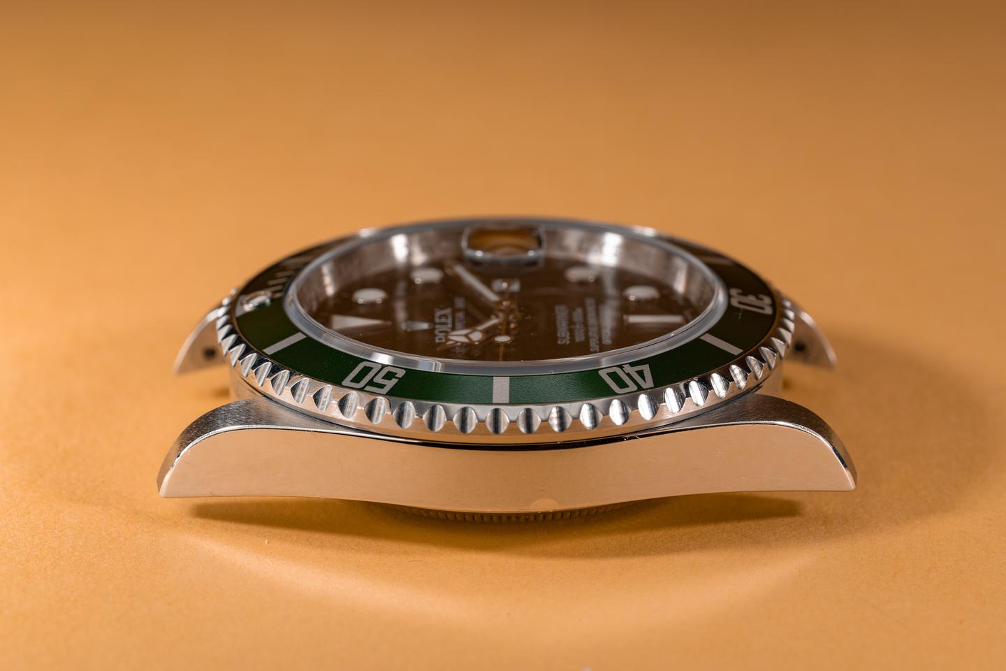 Case: The thick and even case appears to be unpolished showing factory bevels and only light wear from use. The green bezel insert is also in excellent condition showing only very light wear.