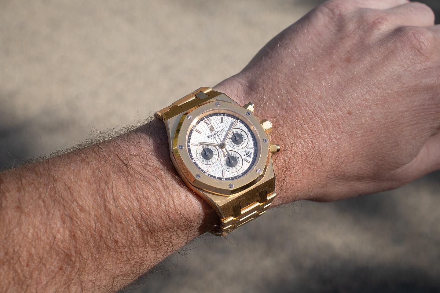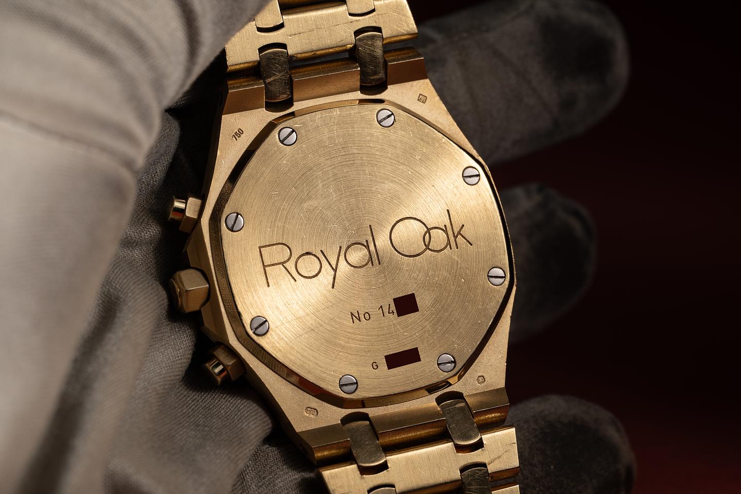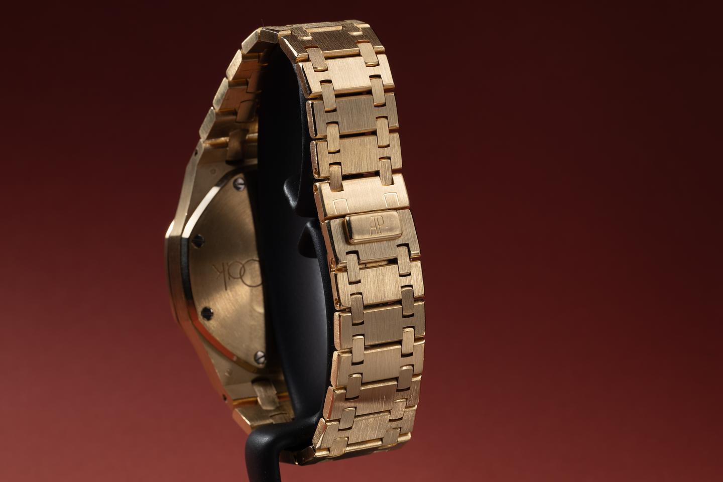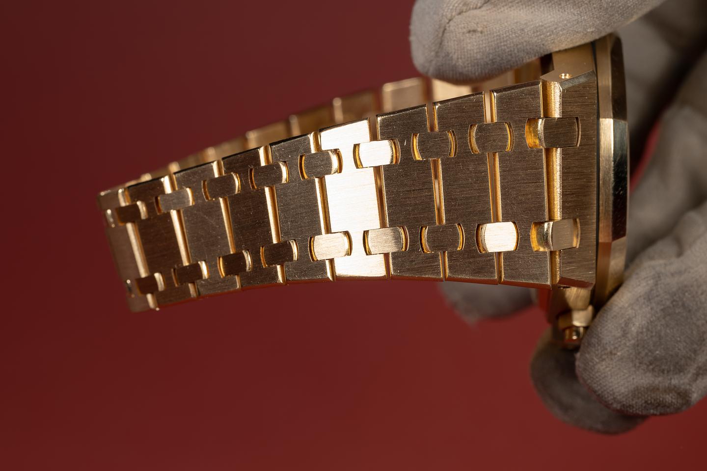 Bracelet: The 20-link 18K yellow gold Royal Oak bracelet is excellent, showing only light stretch for its age. The bracelet will fit up to a 6.5" (16.5cm) wrist.
