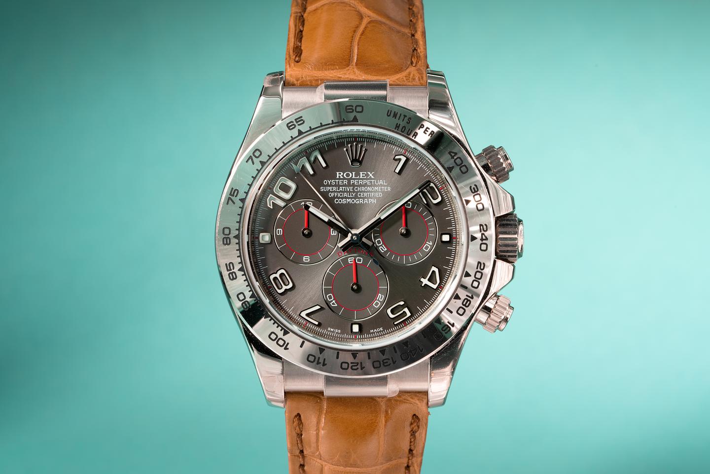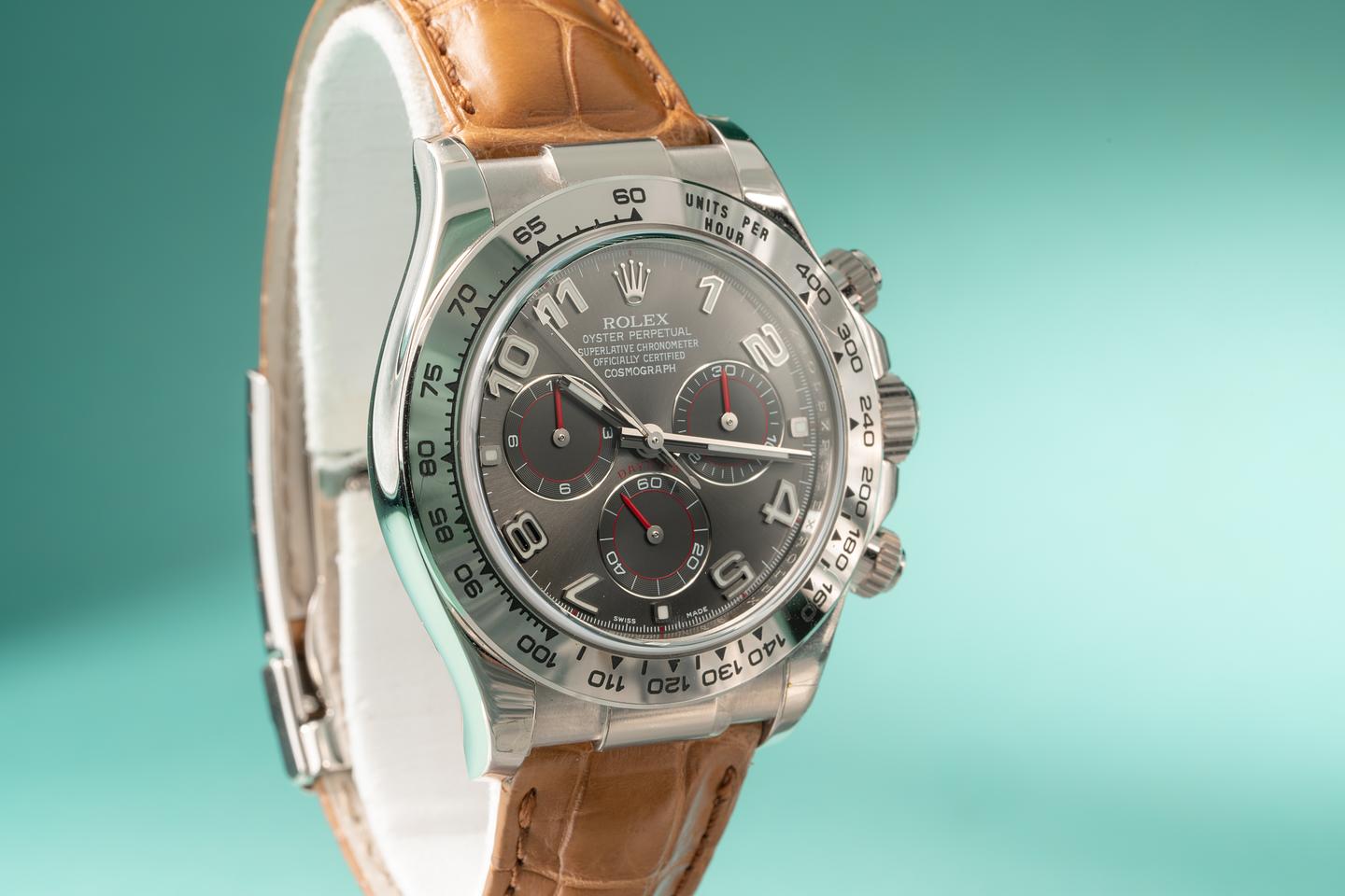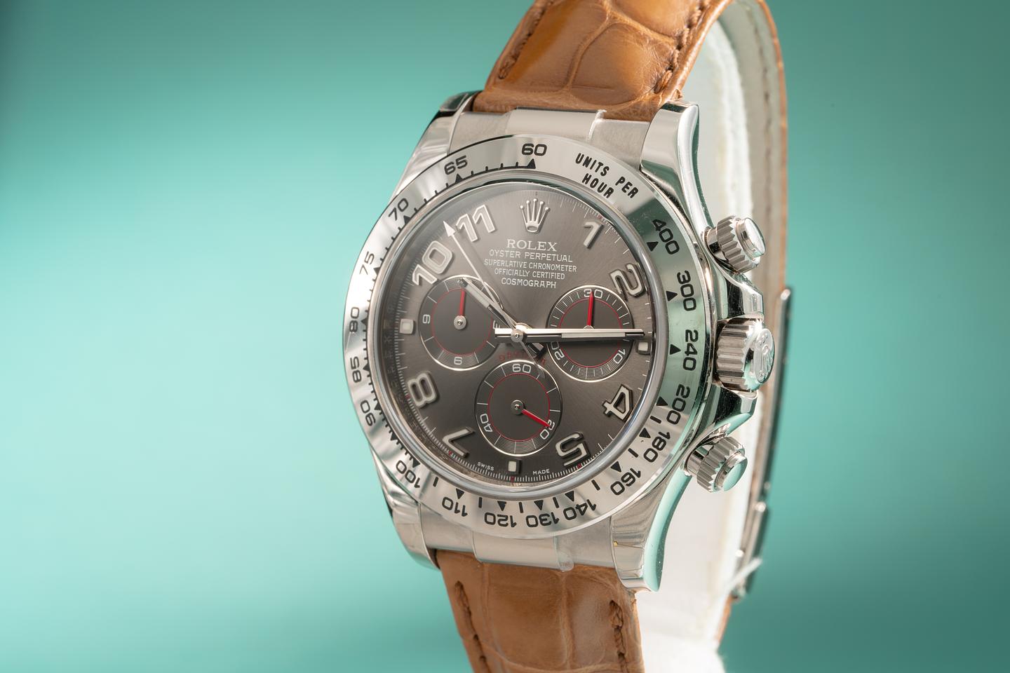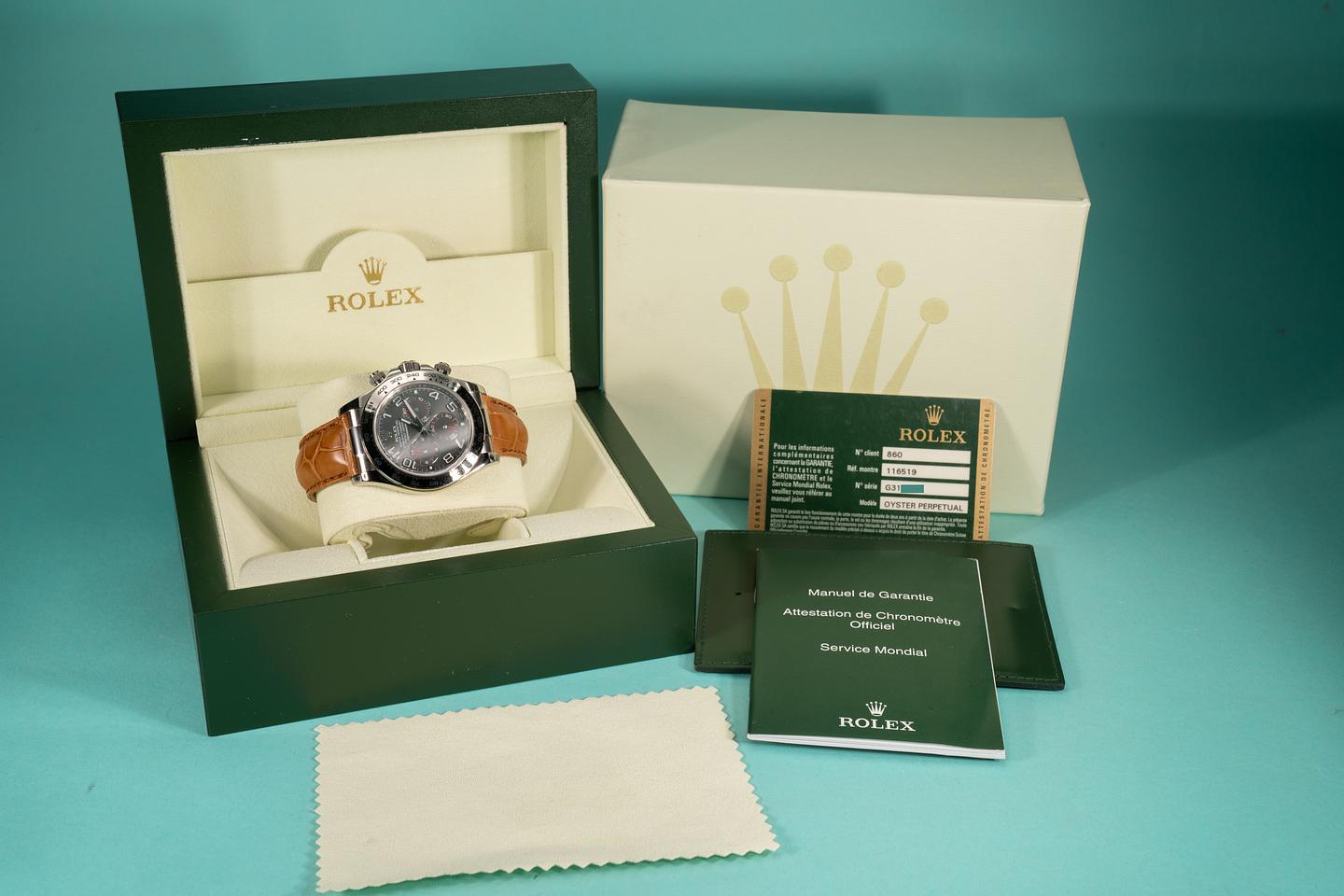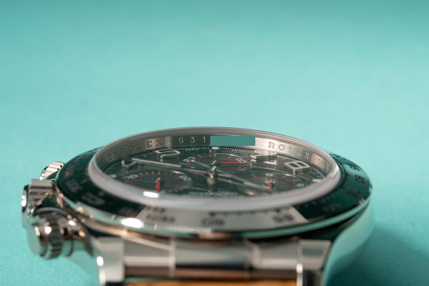 Case: The 18K white gold case is excellent showing only very light wear. Some of the smaller protective stickers from the factory are still in place. The smooth 18K white gold bezel is also excellent showing only very light wear.