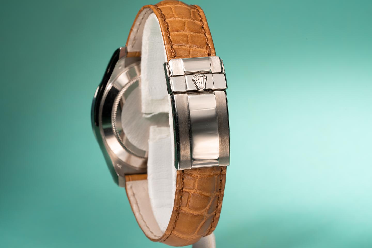 Bracelet: Excellent Rolex made tan alligator strap with Rolex 18k wg clasp.