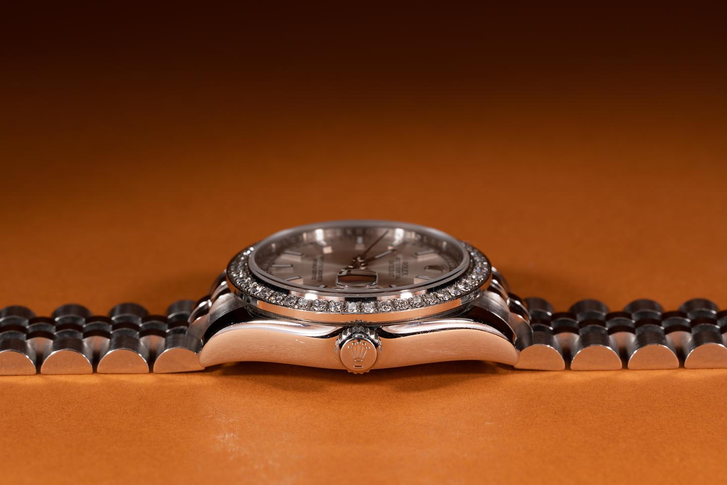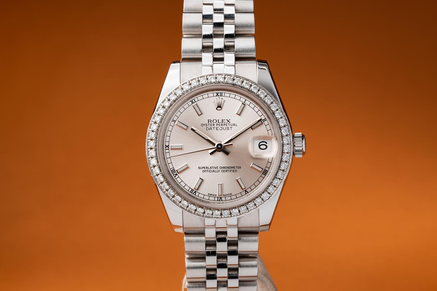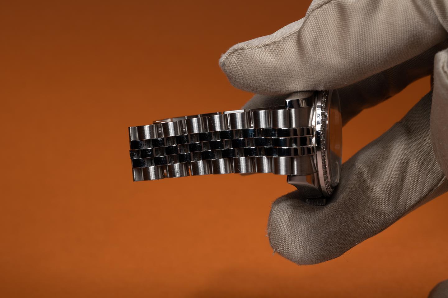 Case: The 31mm midsized case is excellent showing only light wear from use. The aftermarket 18k white gold and diamond bezel is also in excellent condition showing only very light wear from use.