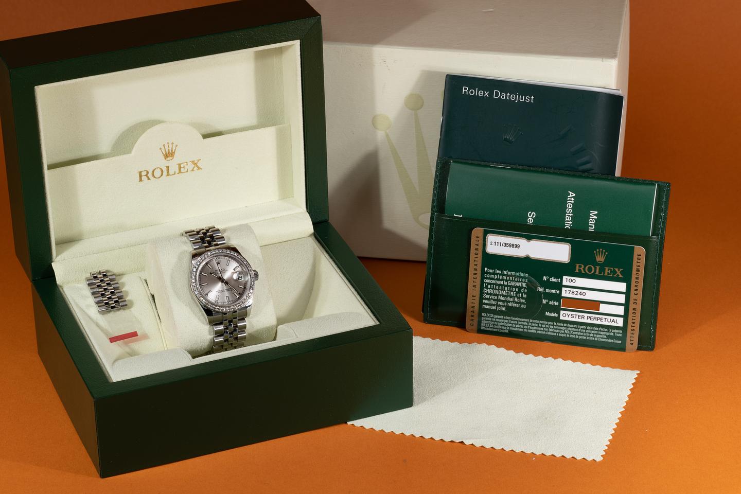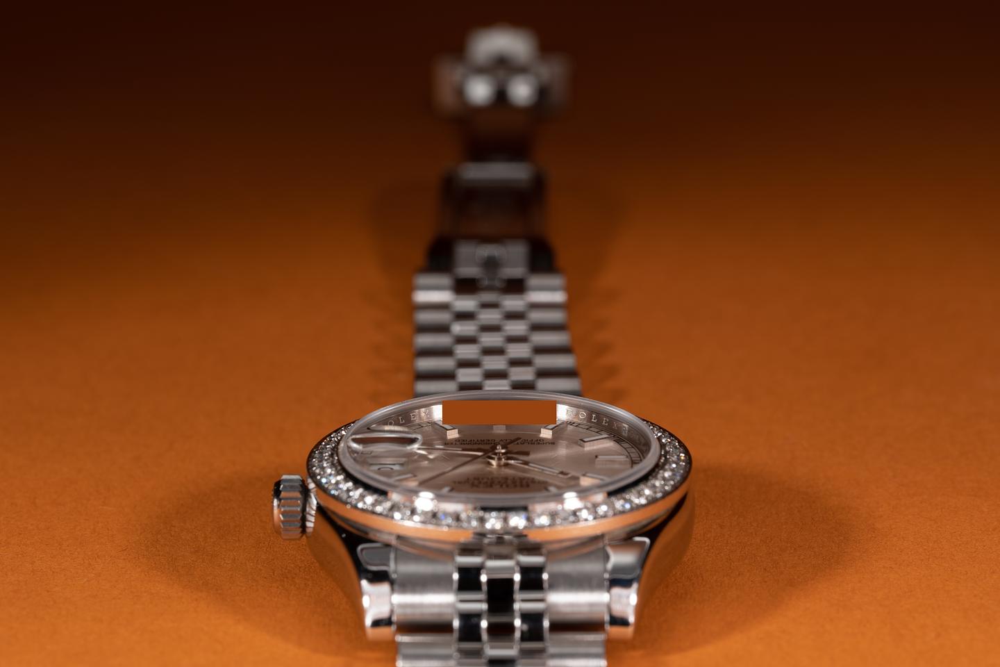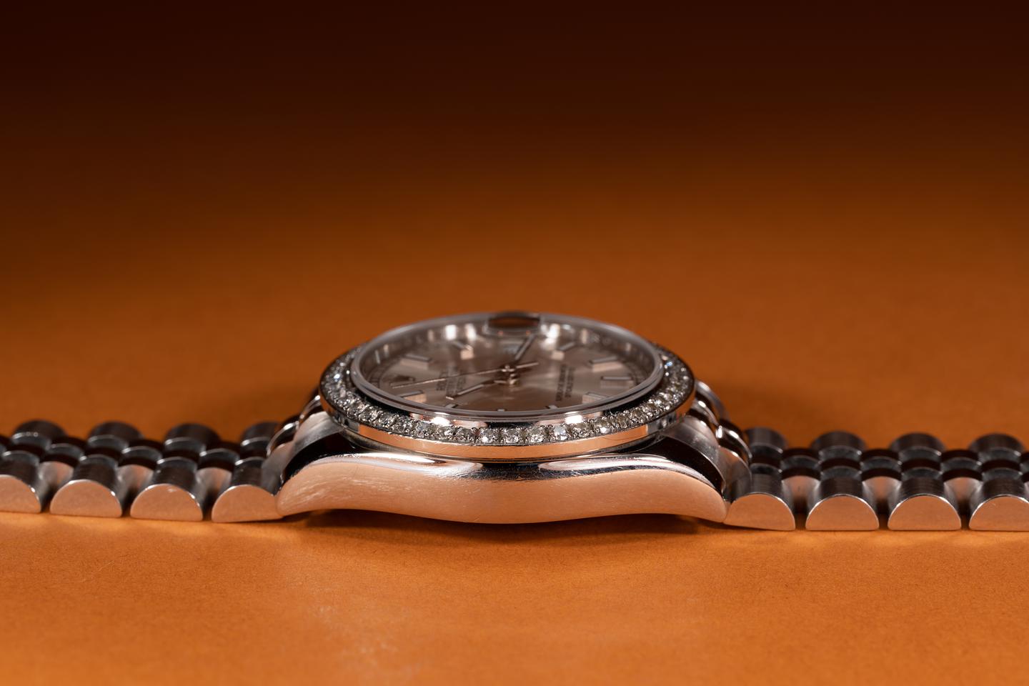 Case: The 31mm midsized case is excellent showing only light wear from use. The aftermarket 18k white gold and diamond bezel is also in excellent condition showing only very light wear from use.