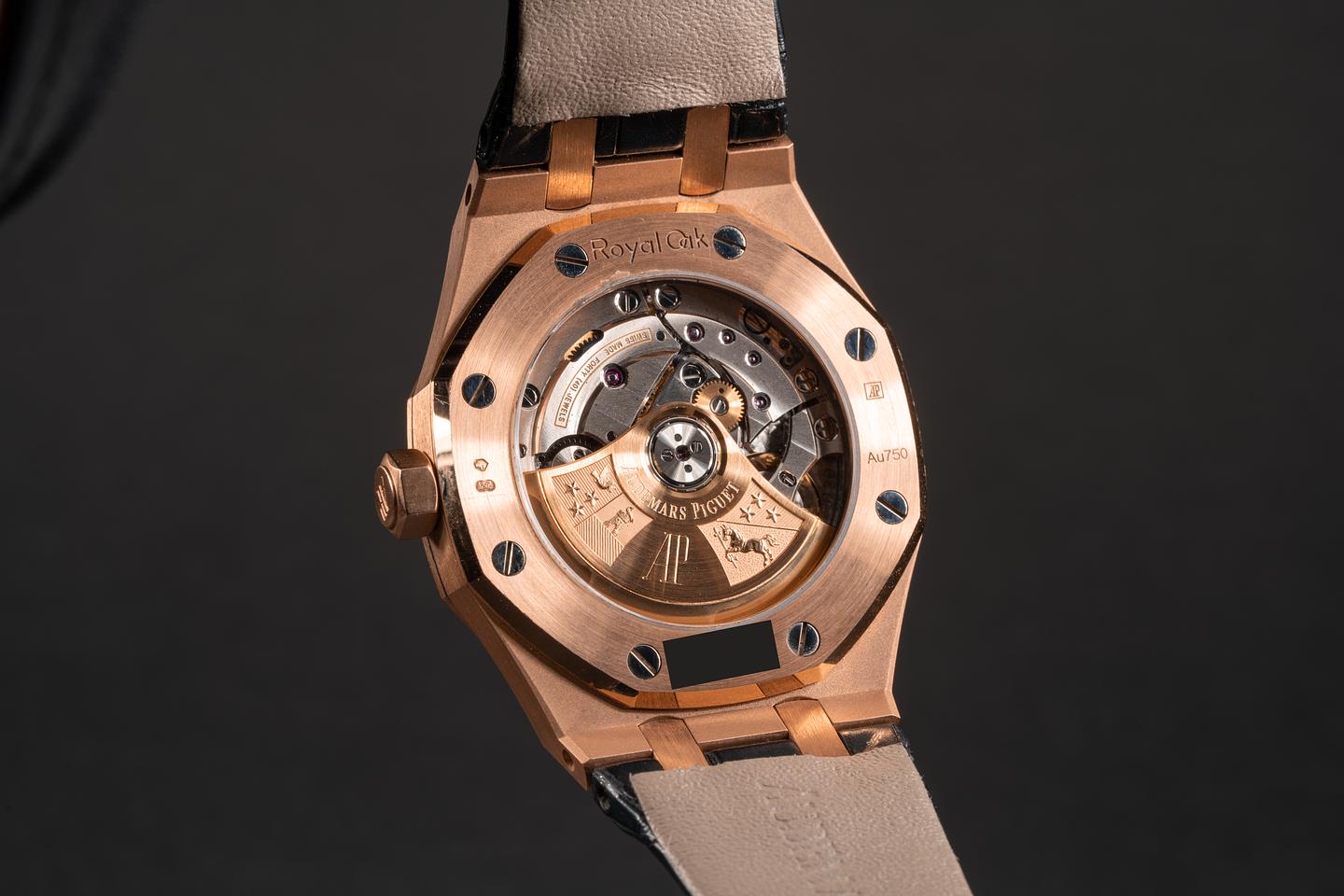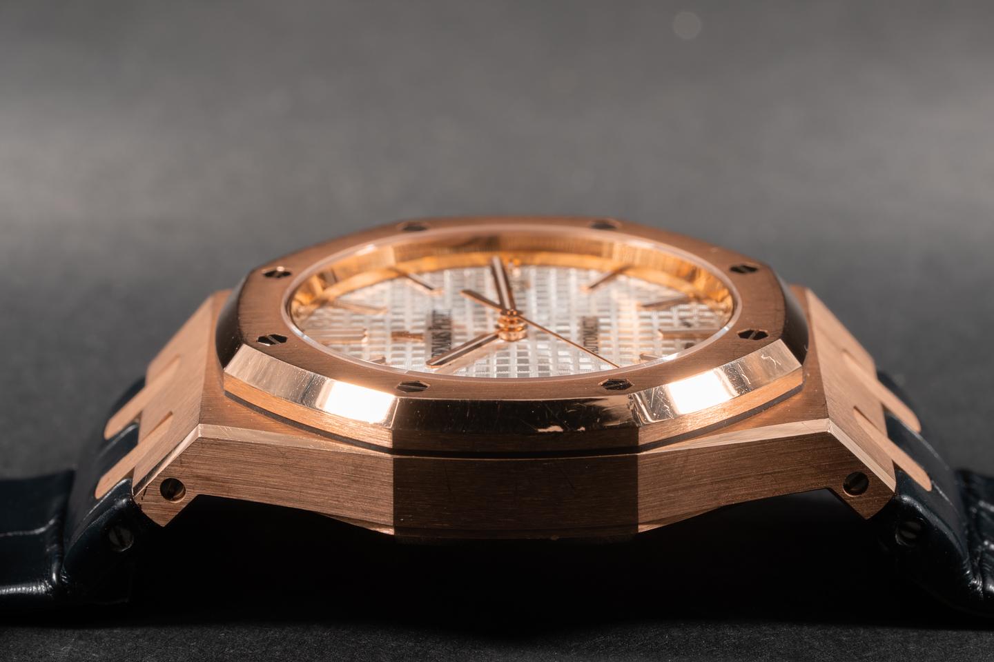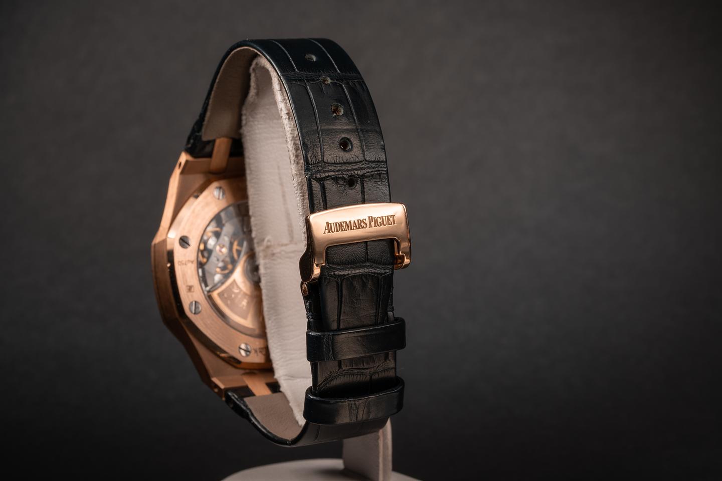 Bracelet: The black leather AP strap is excellent with factory 18k rose gold AP clasp.