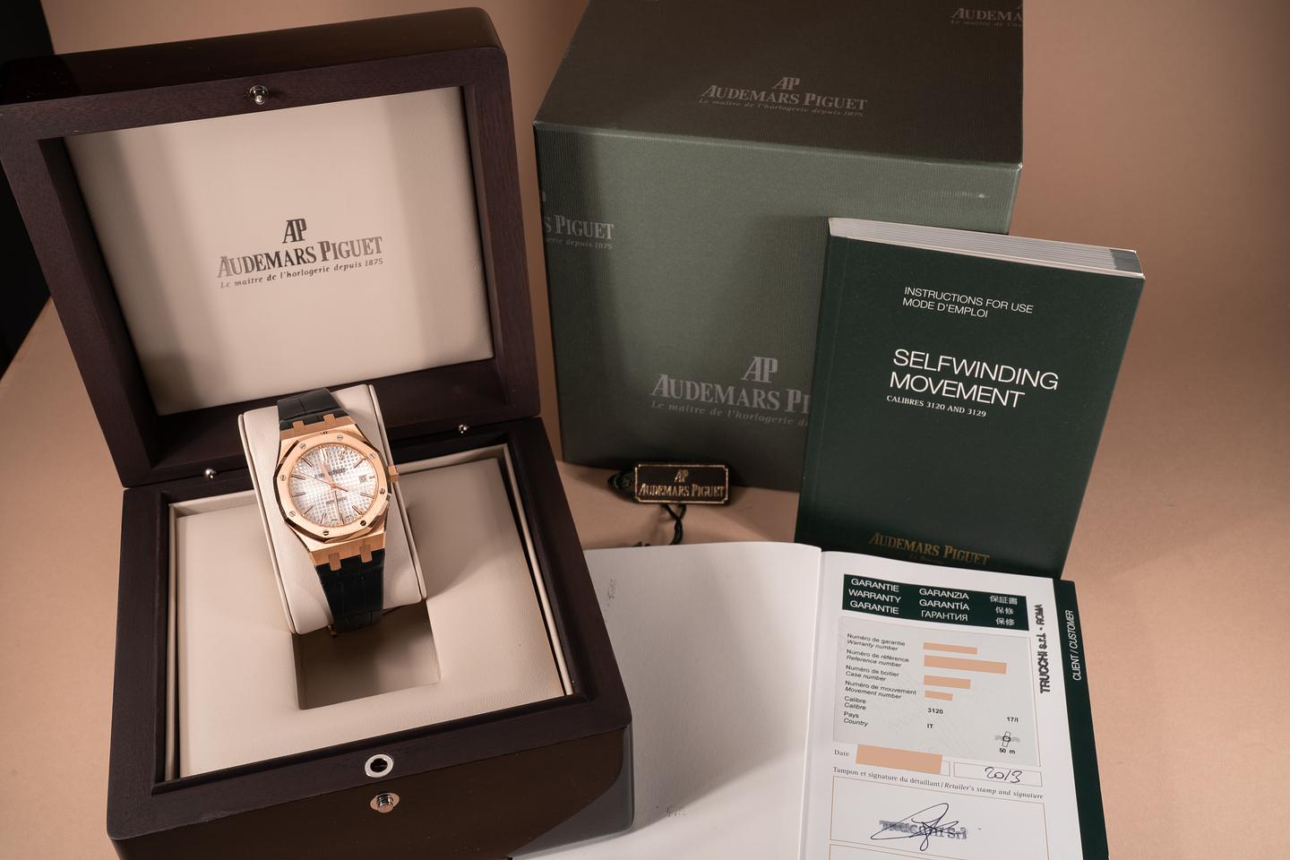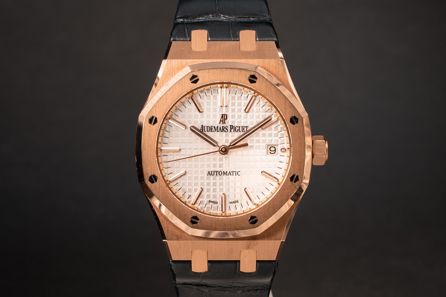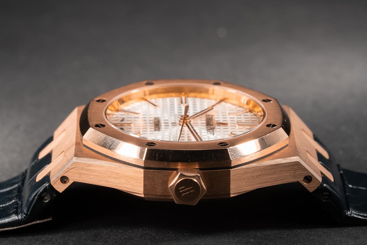 Bracelet: The black leather AP strap is excellent with factory 18k rose gold AP clasp.