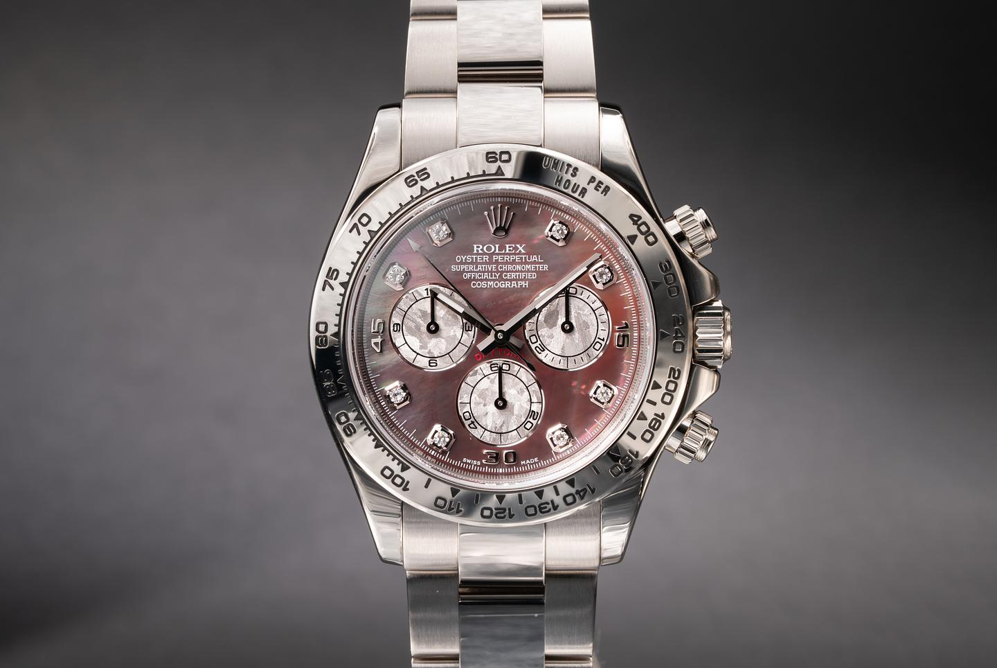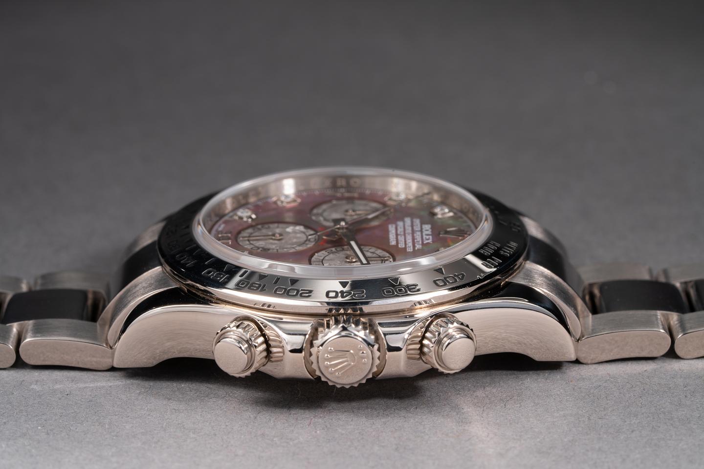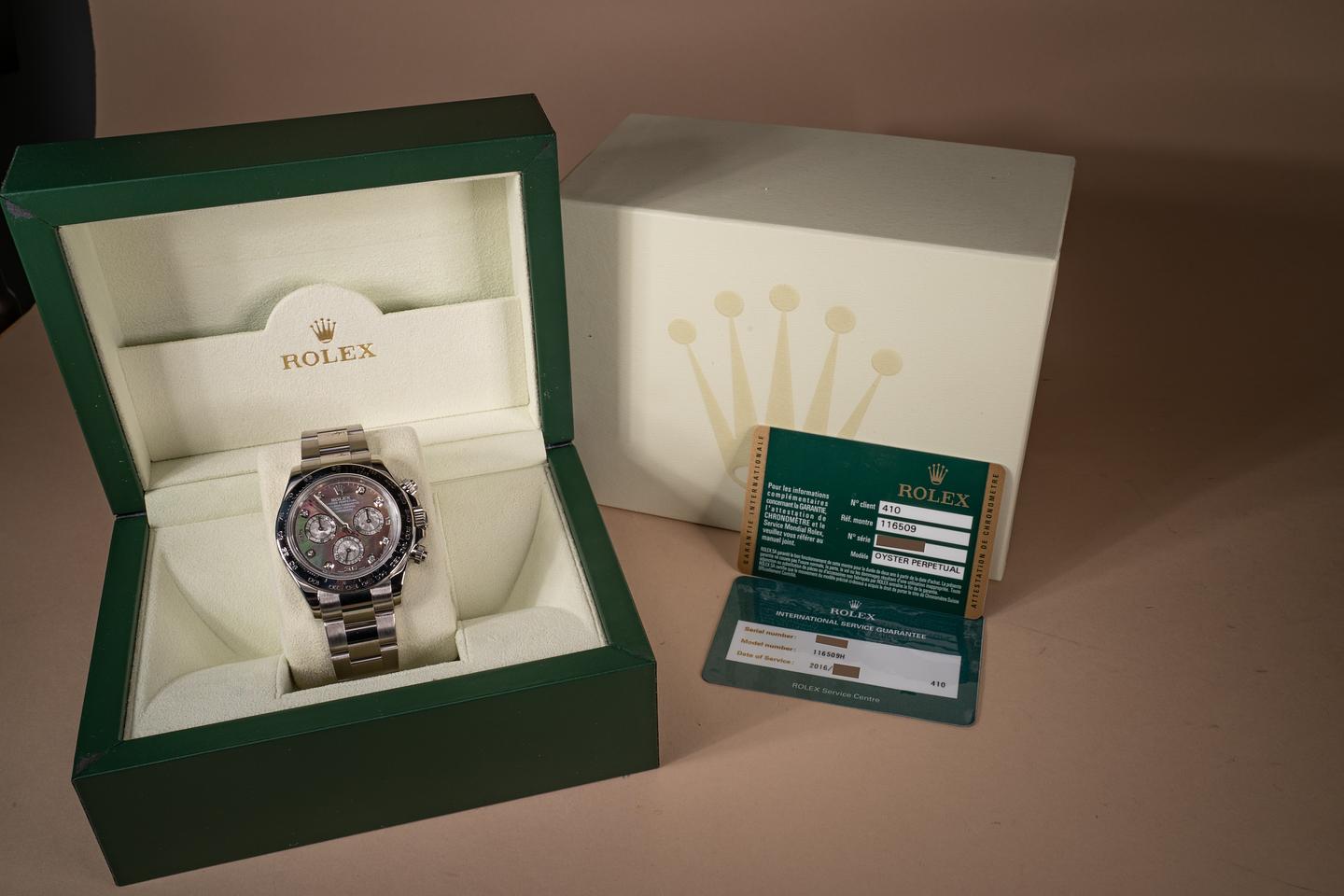 Dial: The black mother of pearl dial shows deep vibrant pastel hues and little if any wear for its age. The original factory hands are matching.