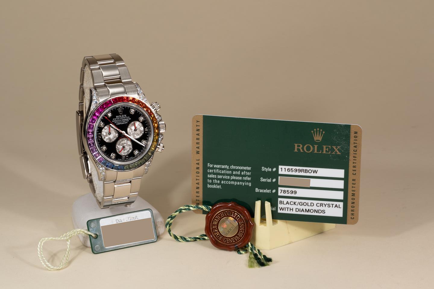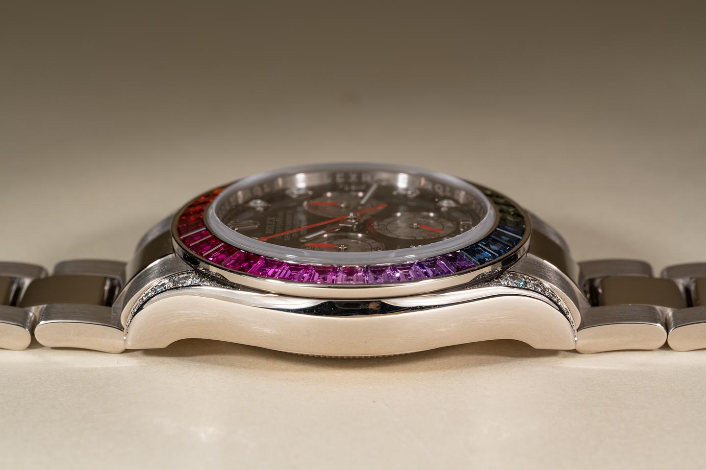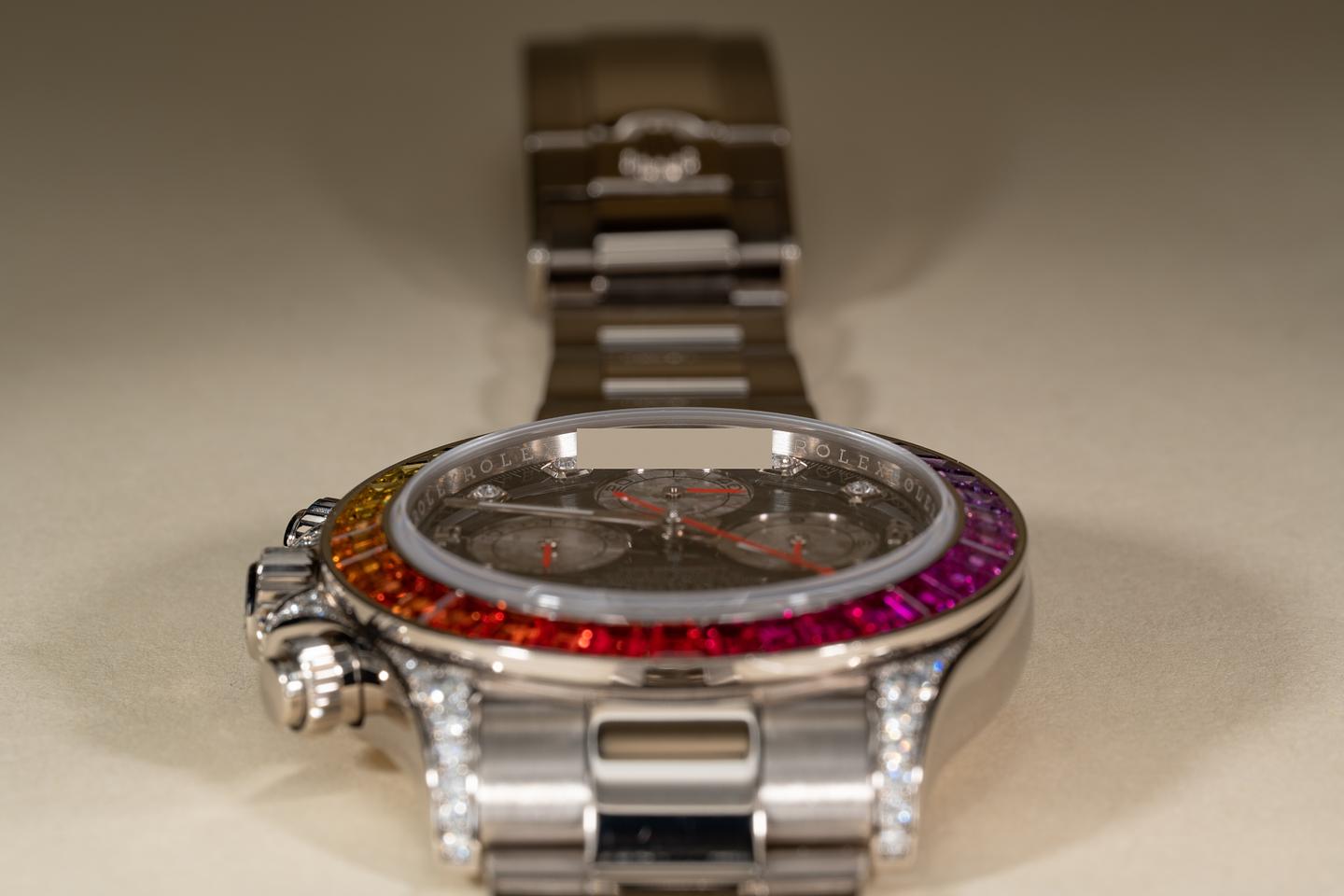 Case: The 18k white gold and diamond case has very light wear from use. The 18k white gold and rainbow sapphire bezel is also in excellent condition showing only very light wear from use.