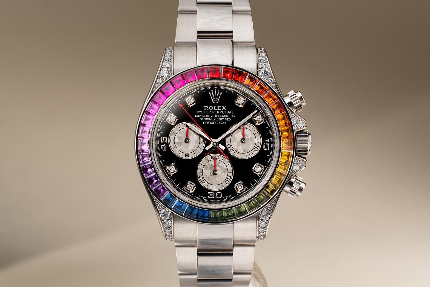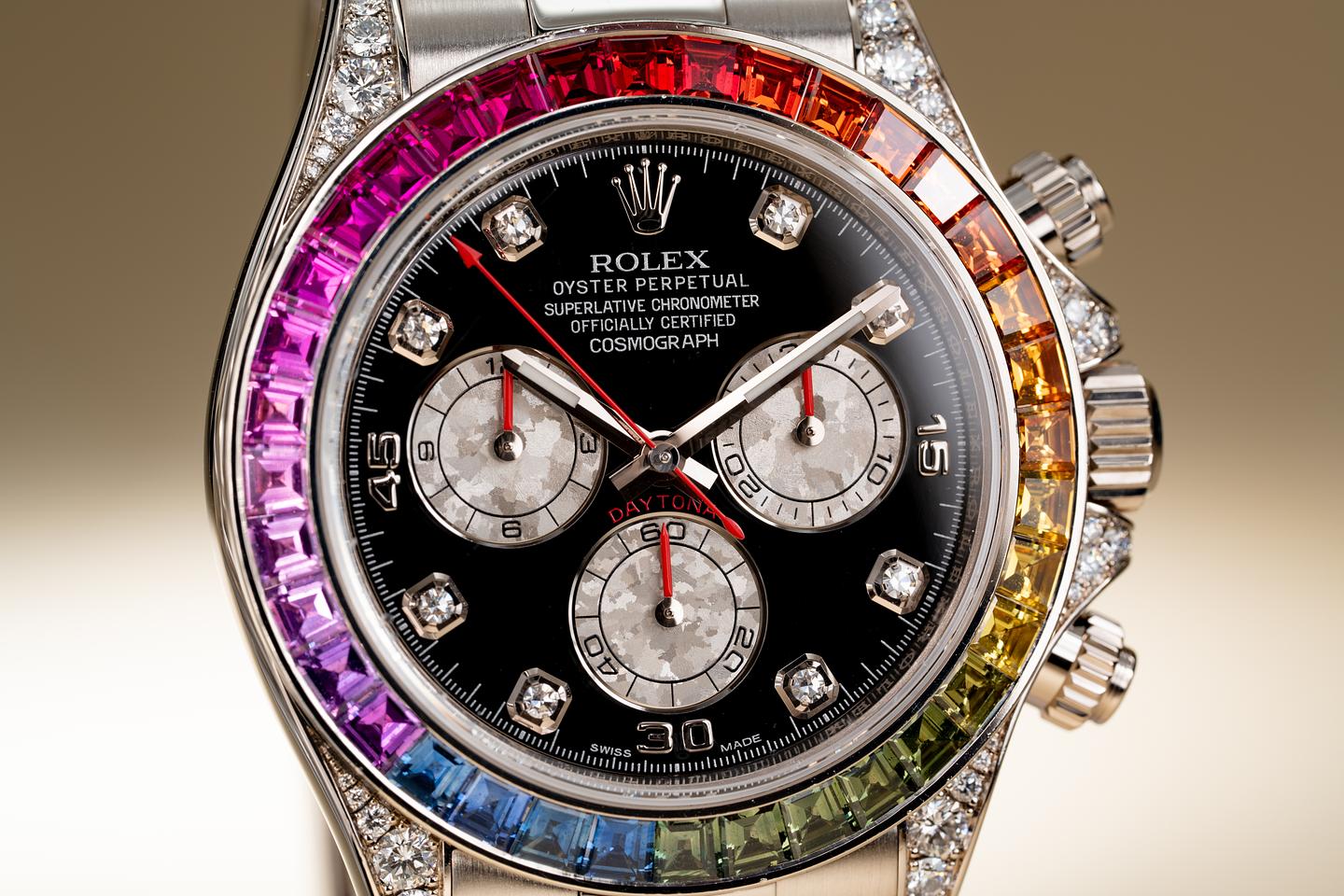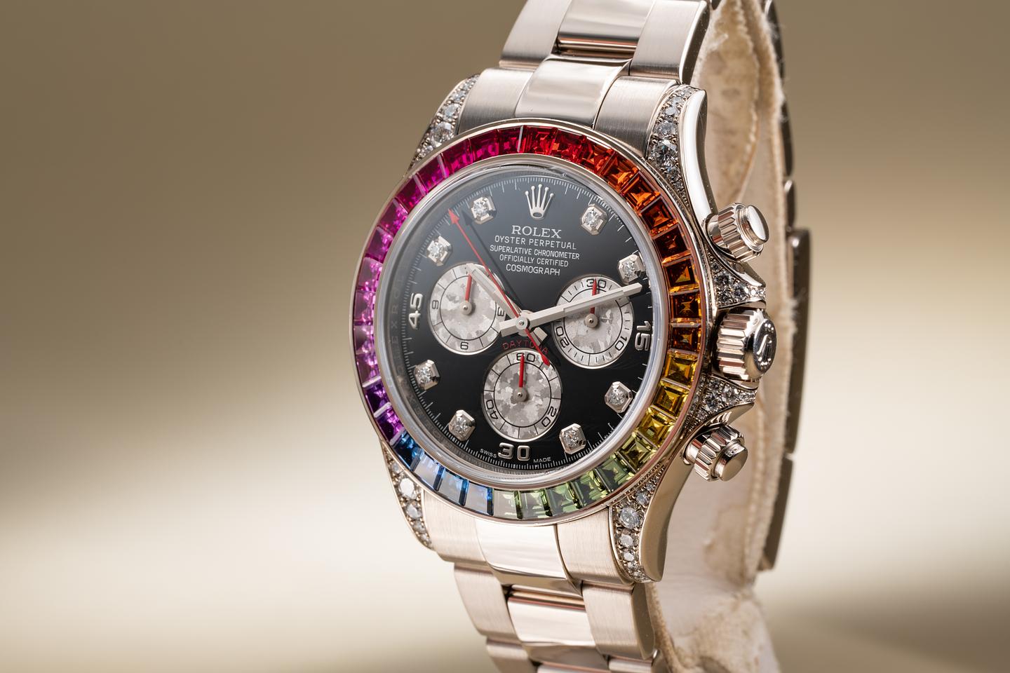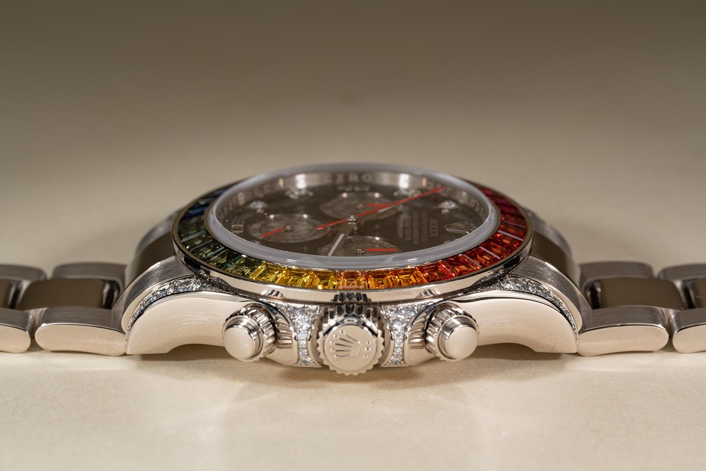 Case: The 18k white gold and diamond case has very light wear from use. The 18k white gold and rainbow sapphire bezel is also in excellent condition showing only very light wear from use.
