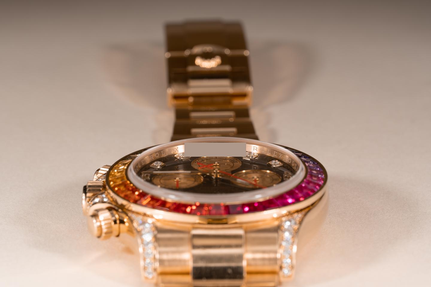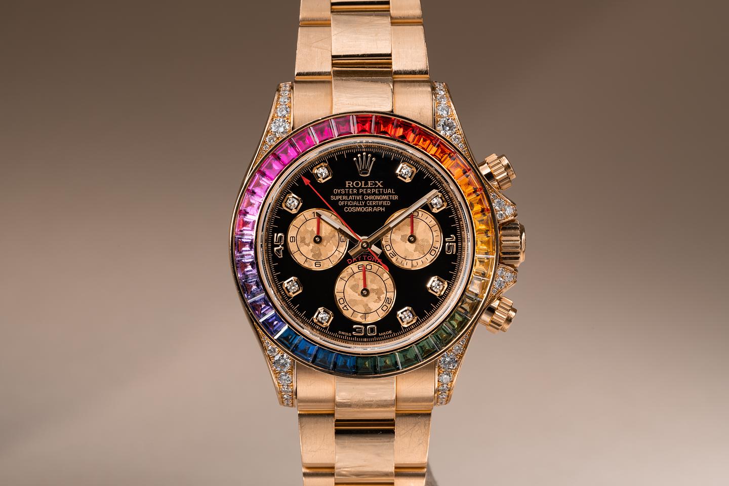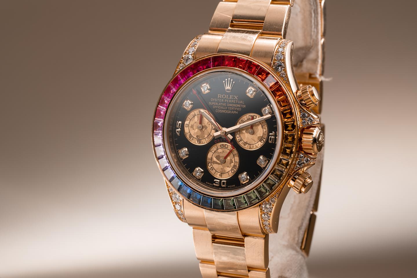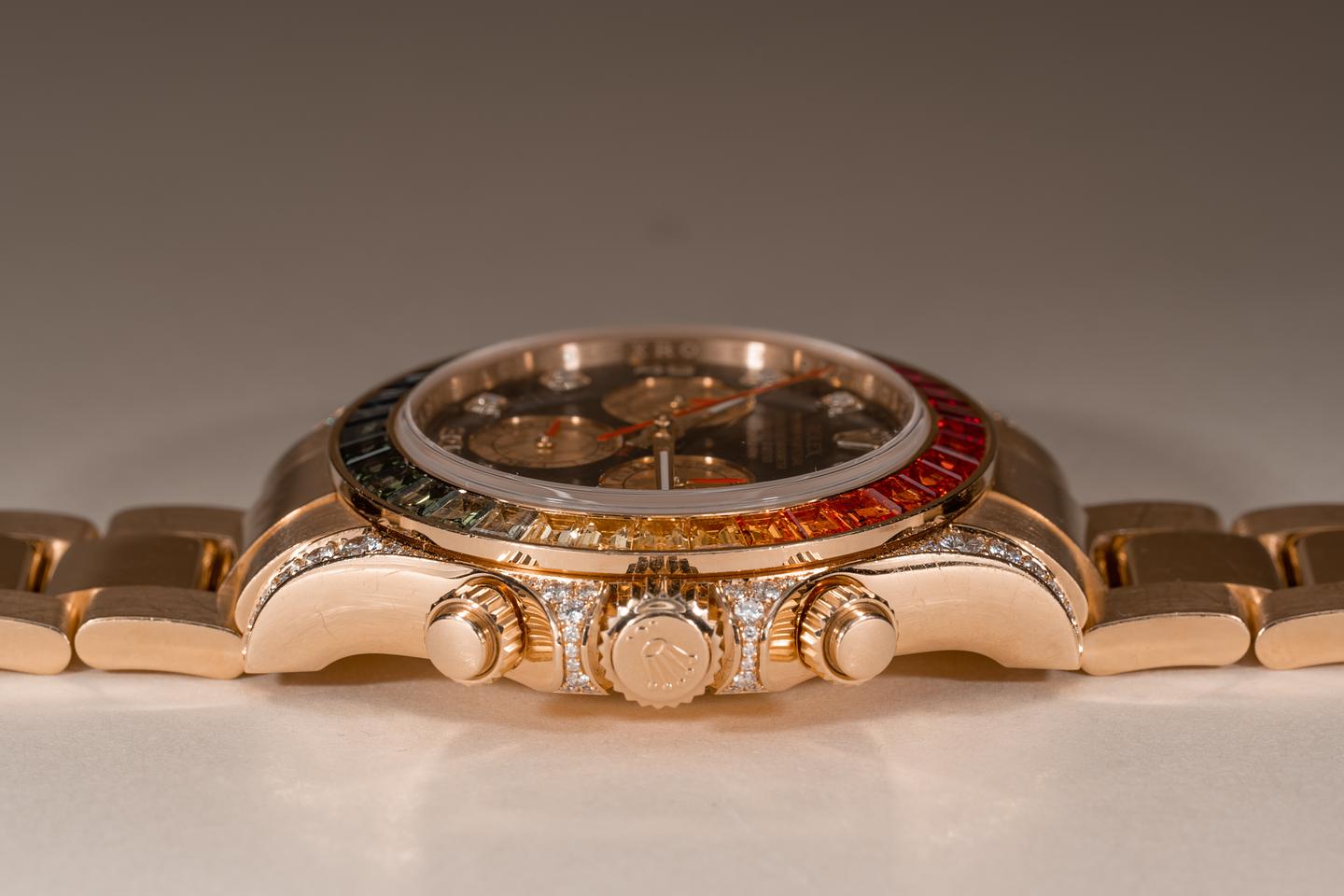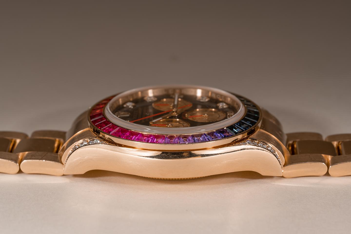 Case: The unpolished 18k yellow gold diamond set case is excellent showing some light wear from use. The 18k yellow gold and rainbow sapphire bezel is also in excellent condition showing only very light wear from use.