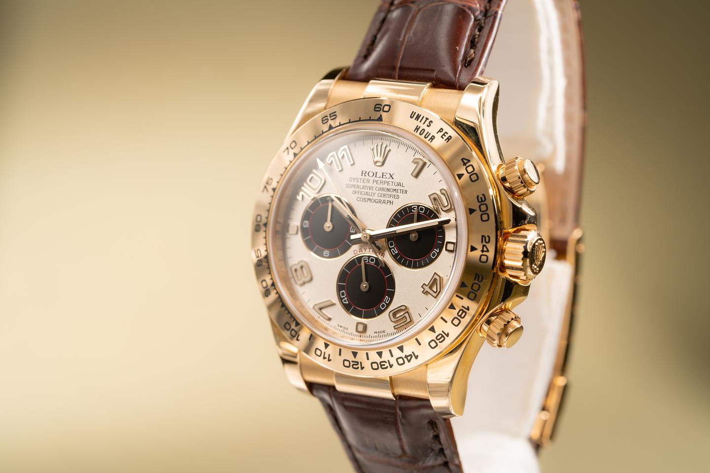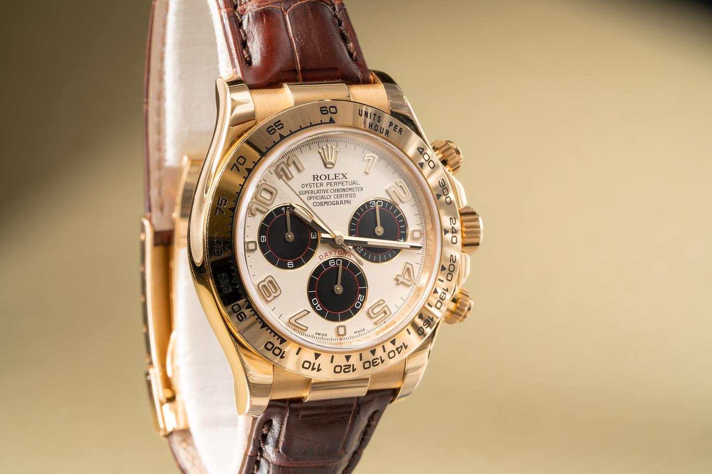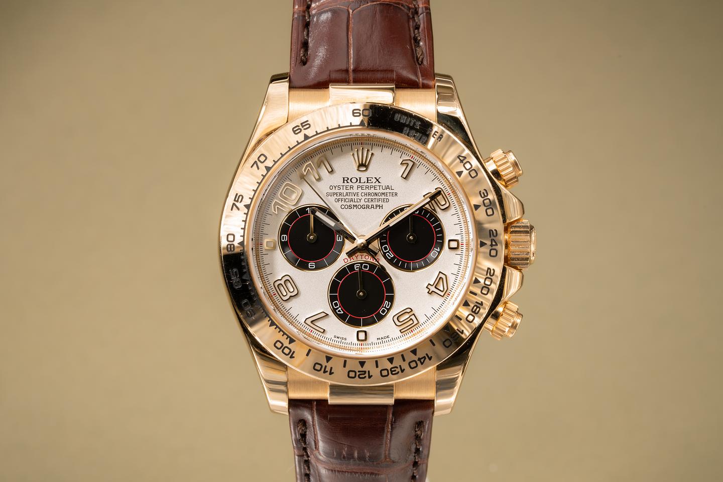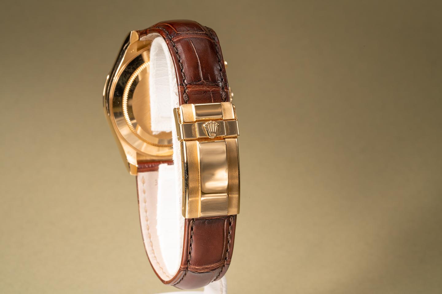 Bracelet: Excellent brown Rolex alligator strap with an 18k yg Rolex clasp.