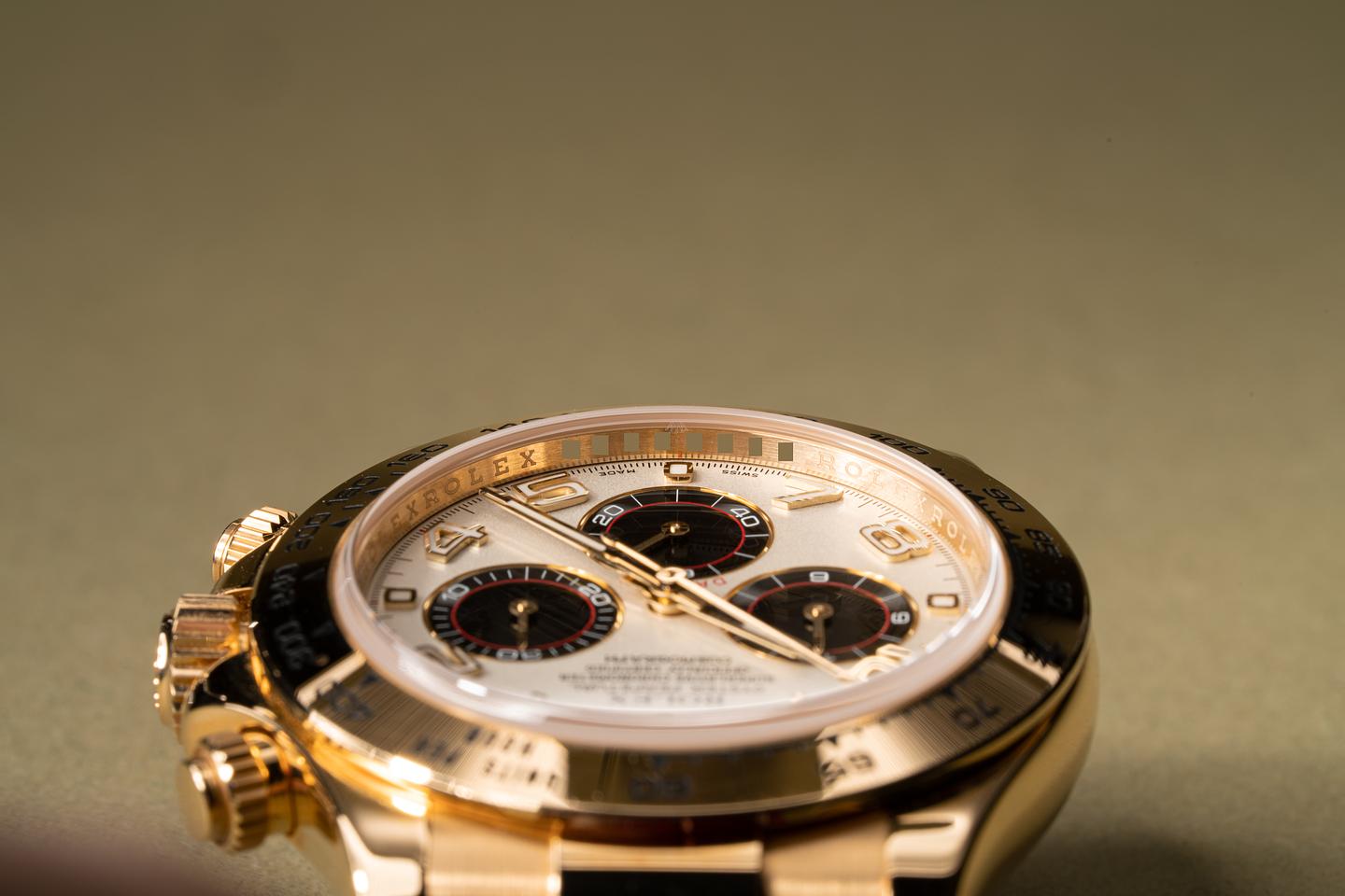 Dial: The white pearlescent Arabic dial is excellent with no visible wear. The black subdials are accented in red and also show no visible wear. The Arabic markers are luminova filled and the 18k yg hands are matching.