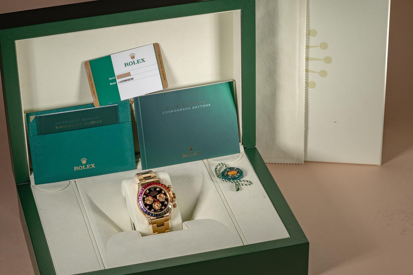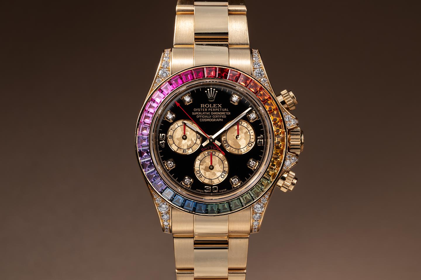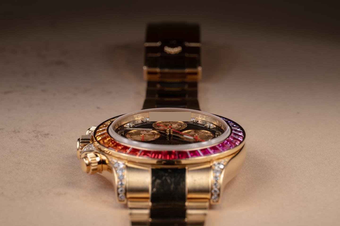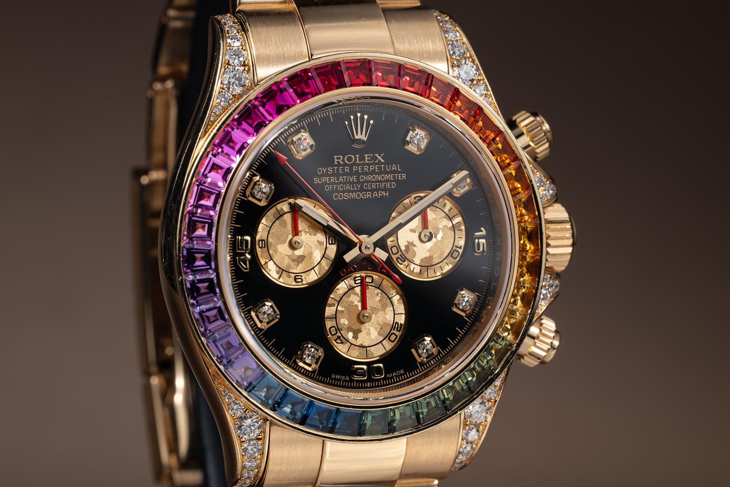 The unpolished 18k yellow gold diamond set case is excellent, showing some light wear from use. The 18k yellow gold and rainbow sapphire bezel is also in excellent condition, showing only very light wear from use.