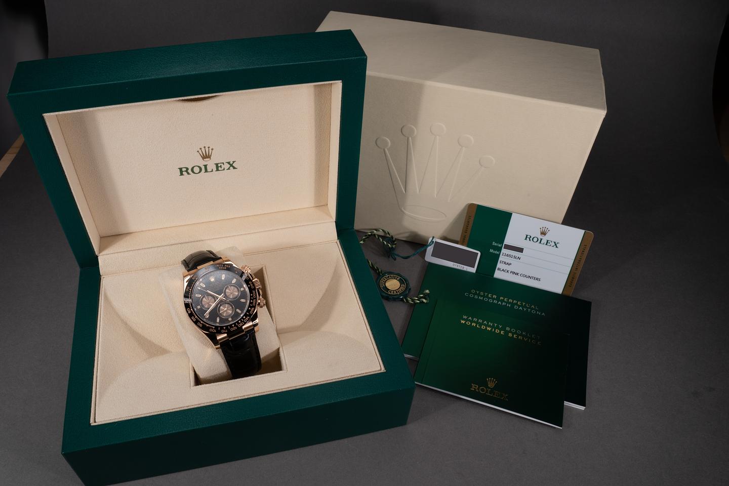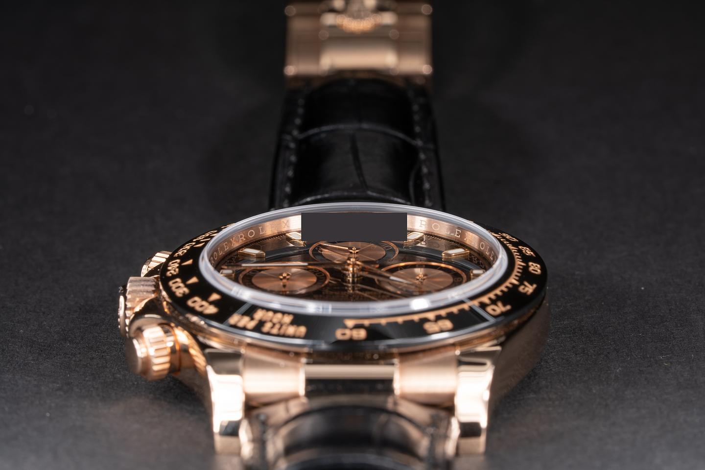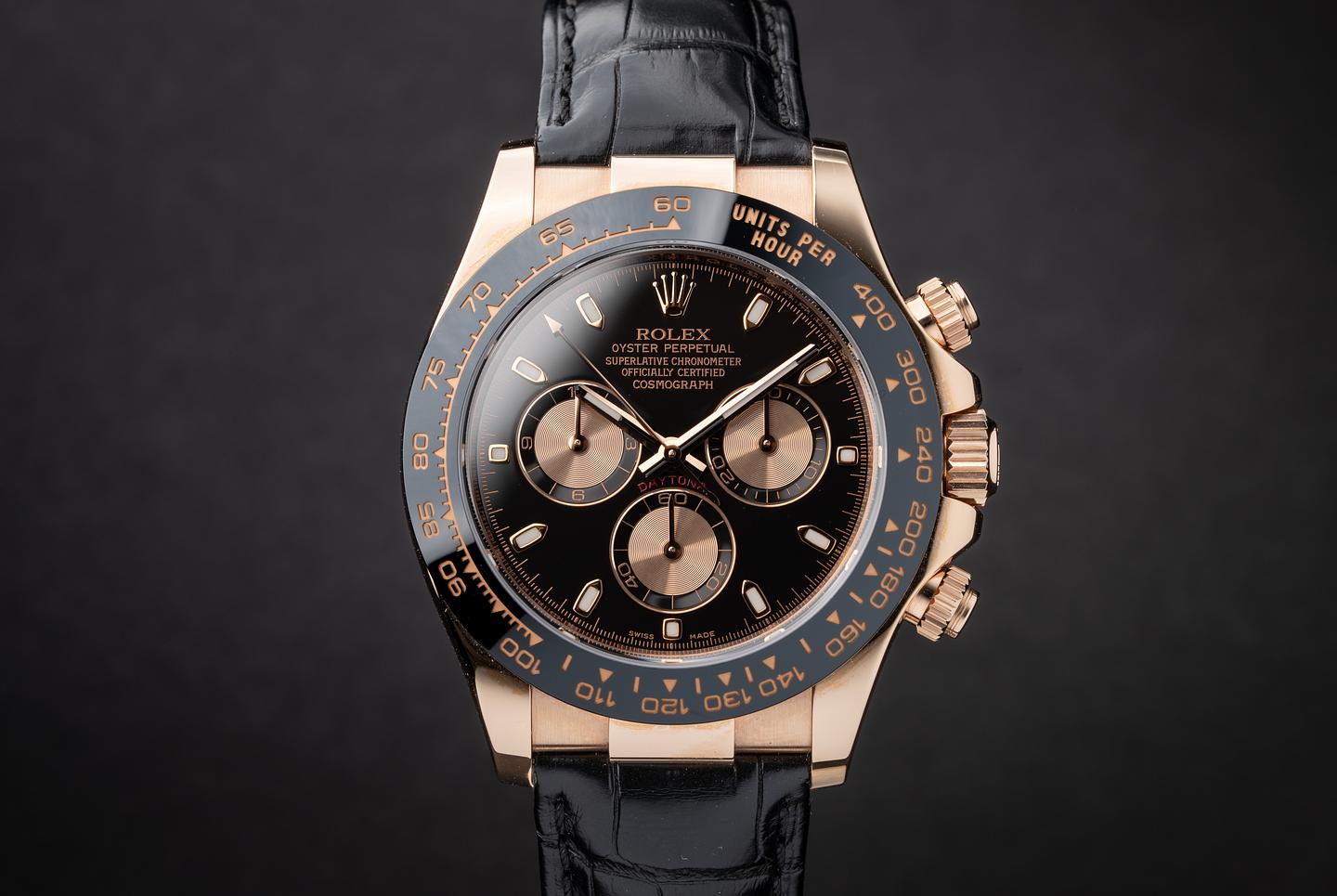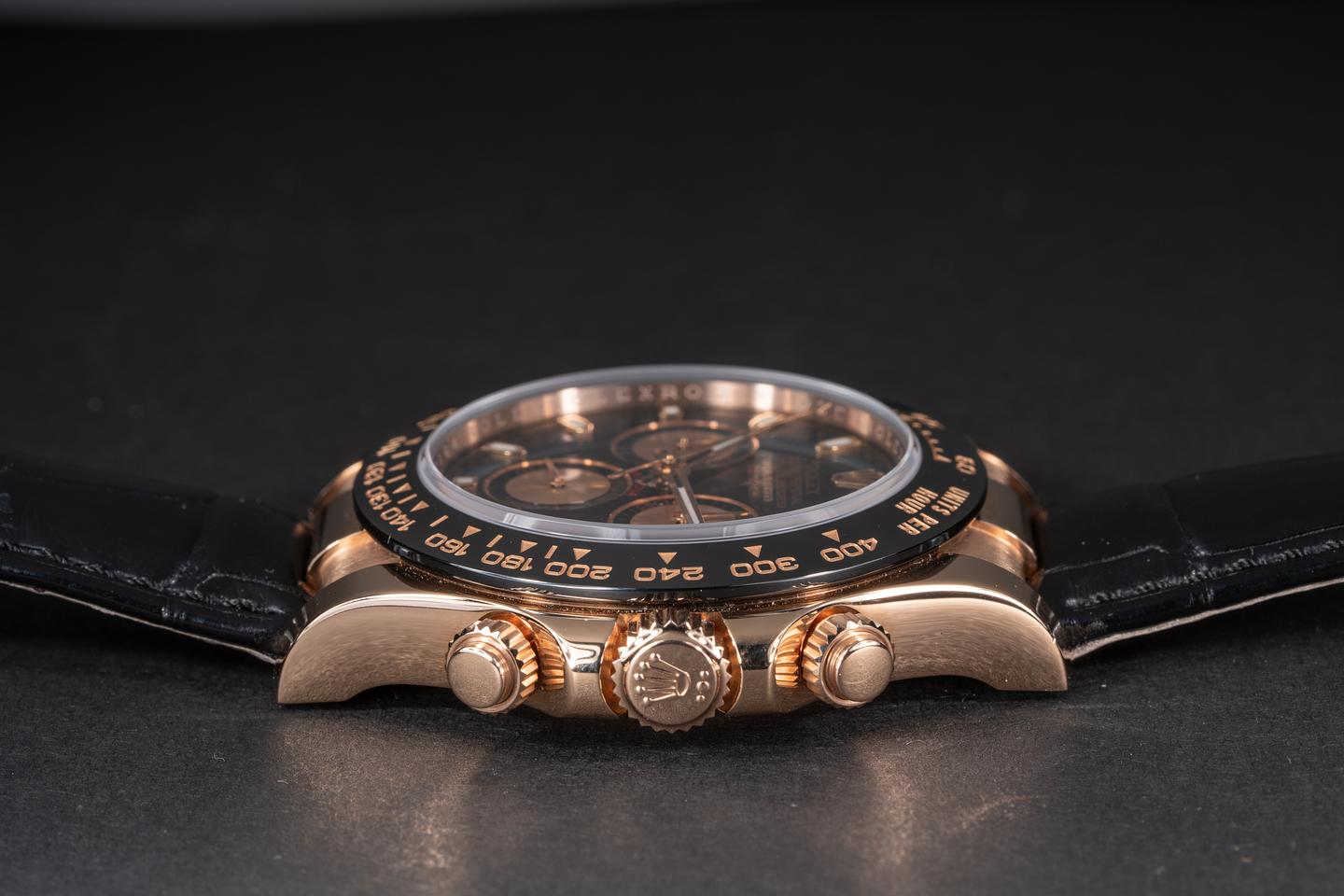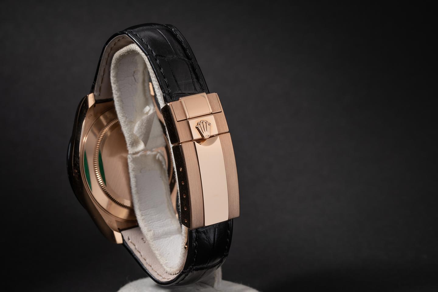 Bracelet: The Rolex black alligator strap is excellent showing only very light wear from use. the 18k Everose gold buckle is also in excellent condition showing only very light wear from use.