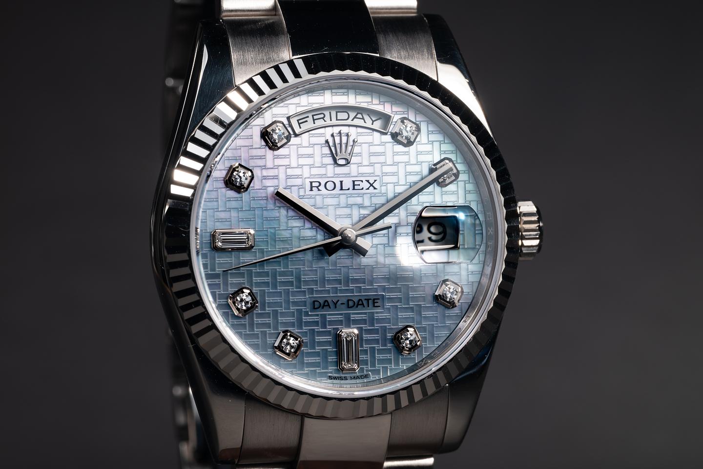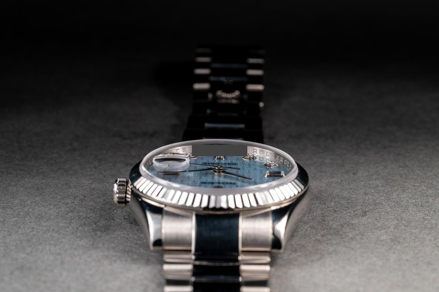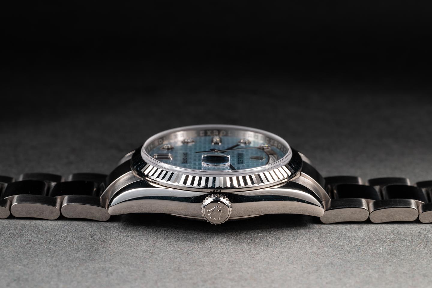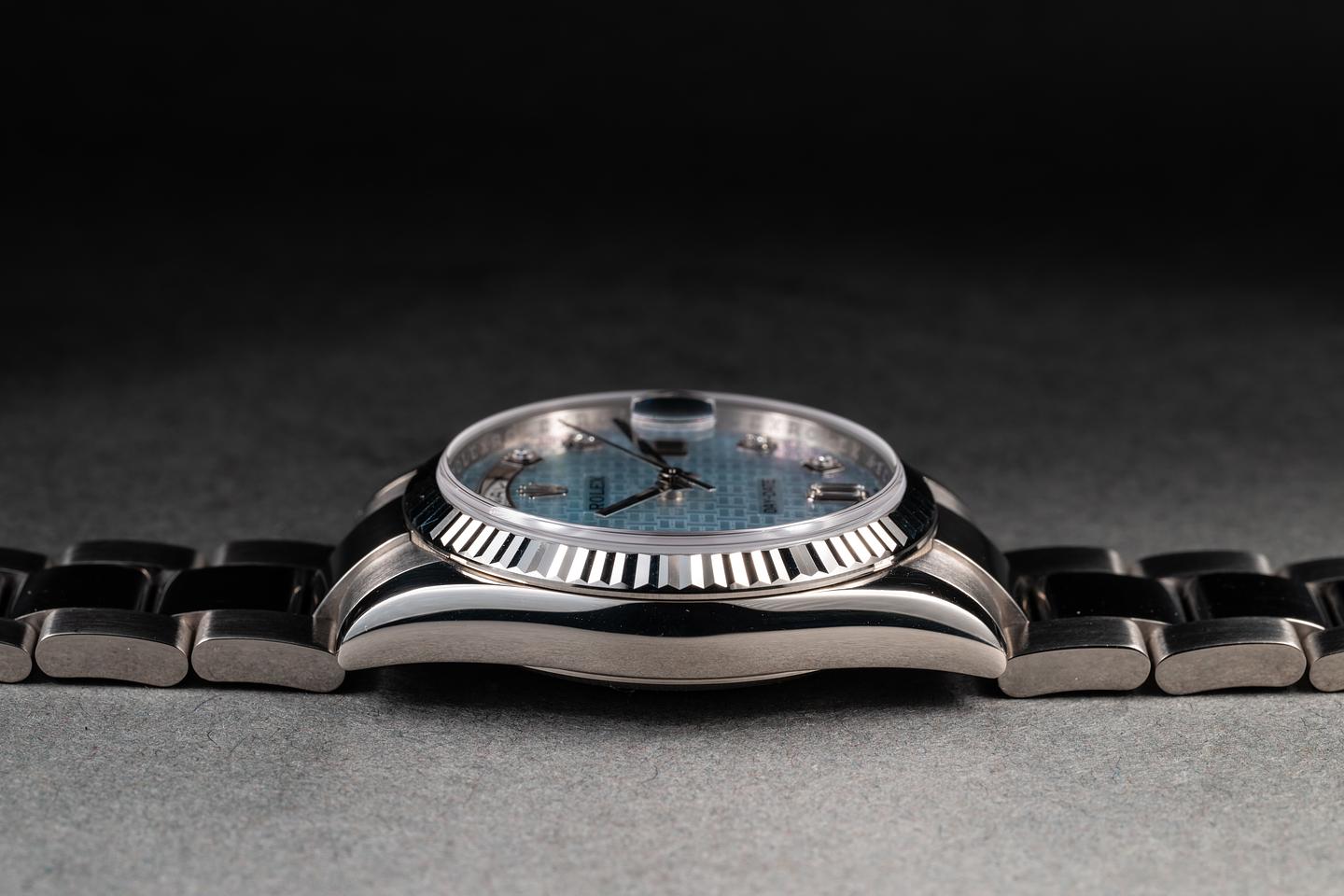 Case: The 18K white gold case is excellent, showing only very light wear. The sharp 18K white gold fluted bezel is also in excellent condition, showing only very light wear.