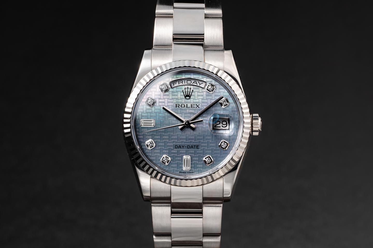 Dial: The Oxford motif mother-of-pearl diamond dial is mint, and the original factory hands match.