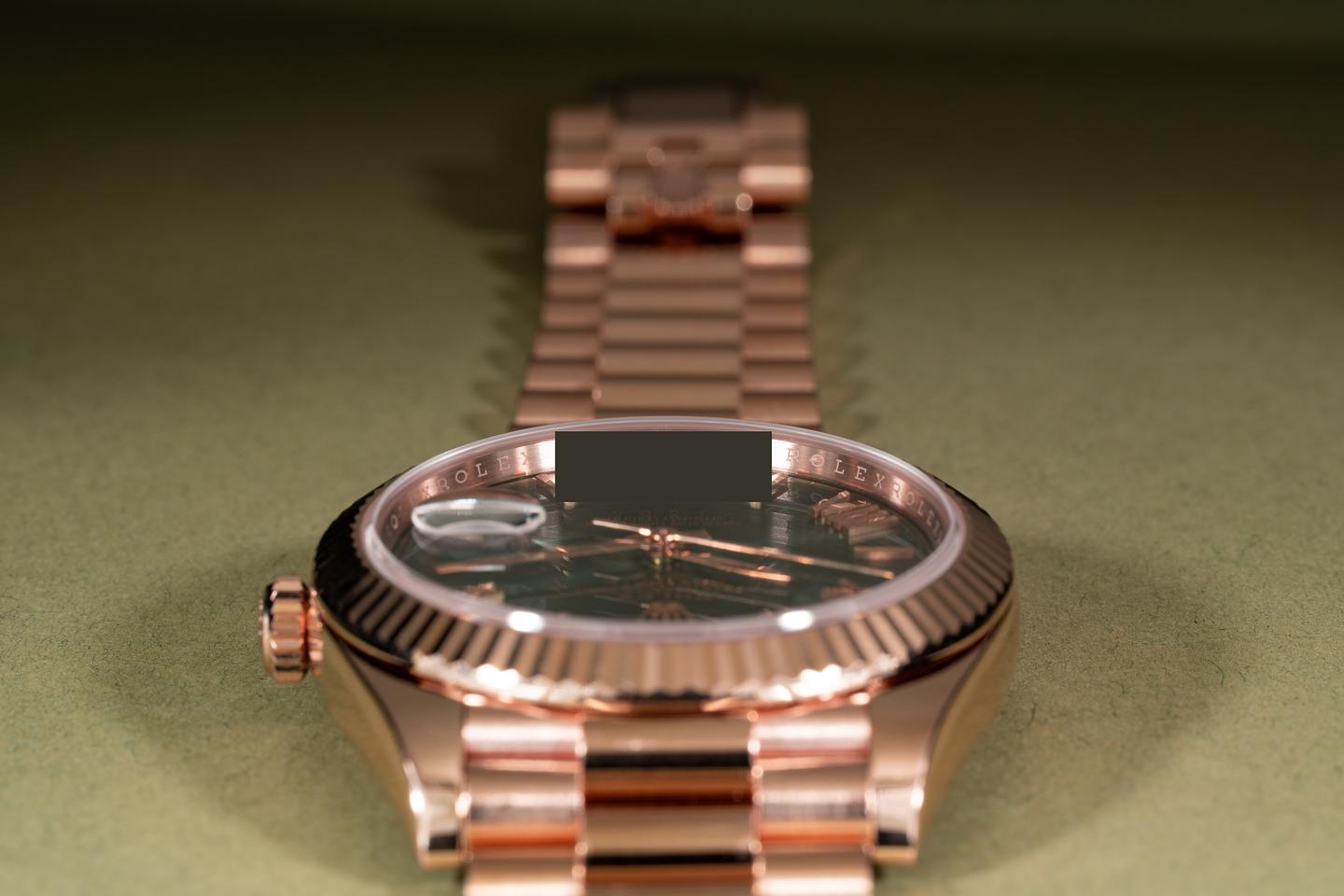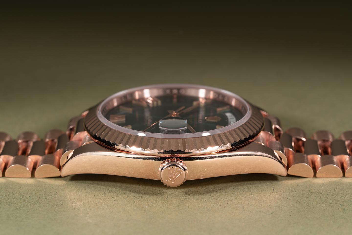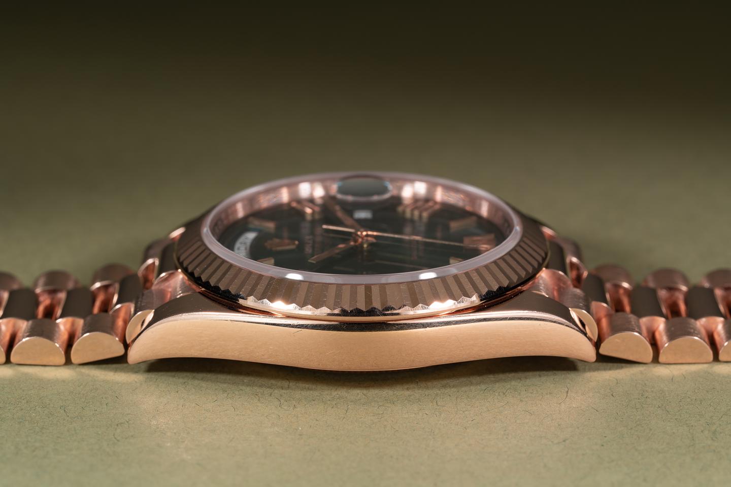 Case: The 18k everose case is excellent showing only very light wear from use. The sharp 18k everose gold fluted bezel is also in excellent condition showing only very light wear from use.