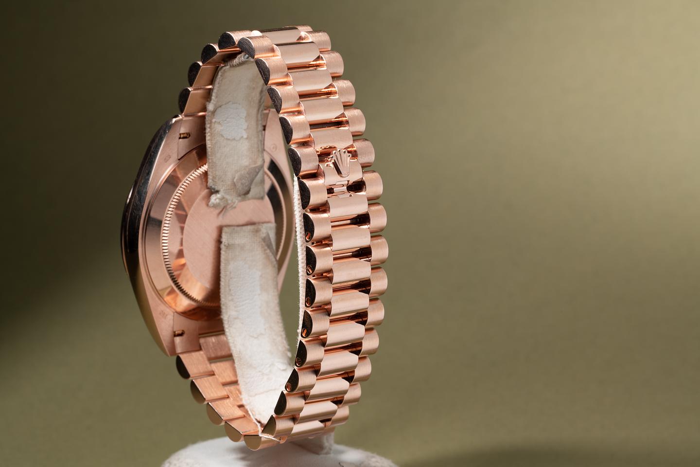 Bracelet: The 23 link 18K everose gold president bracelet is excellent showing no perceivable stretch.