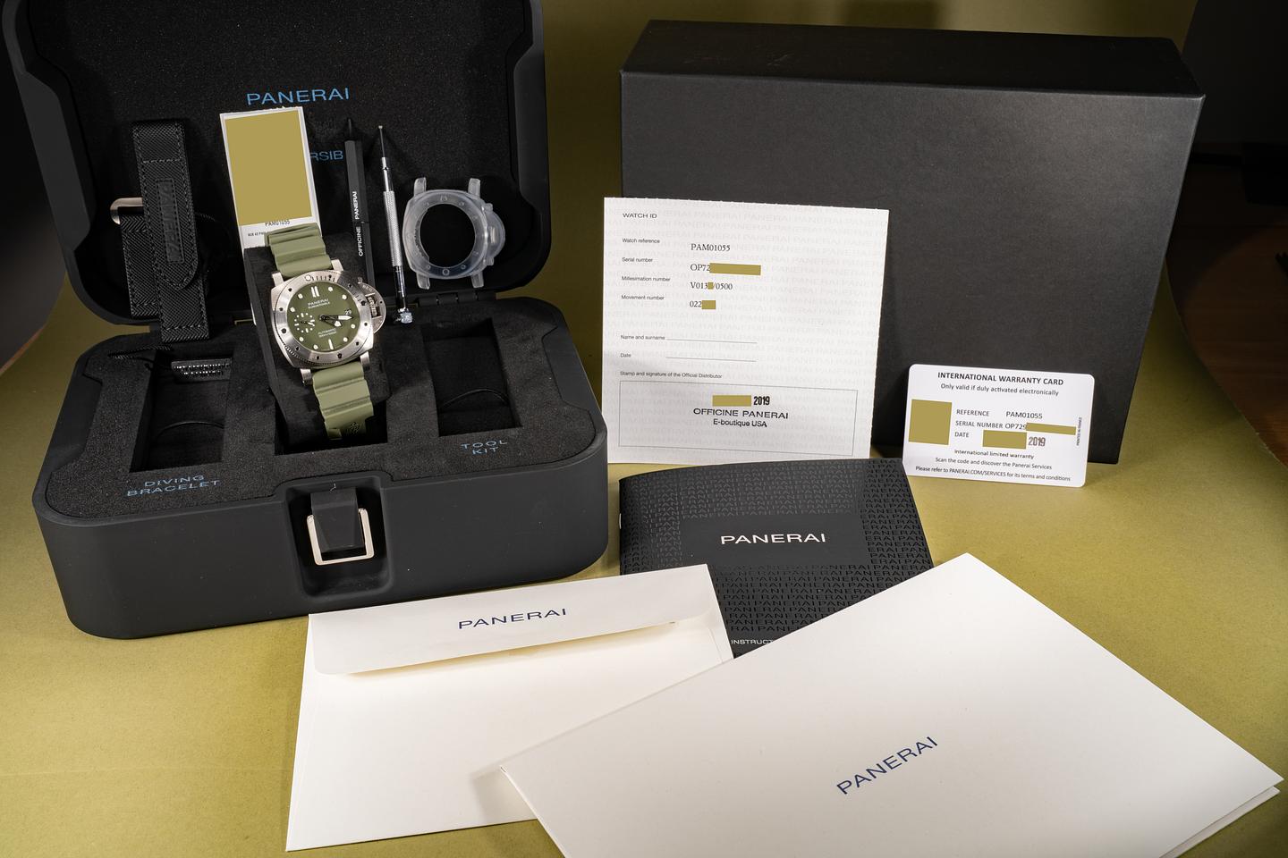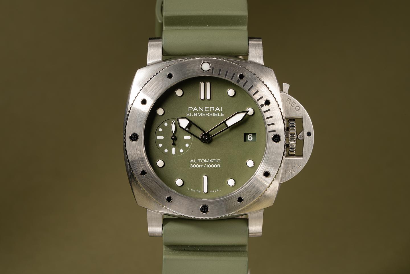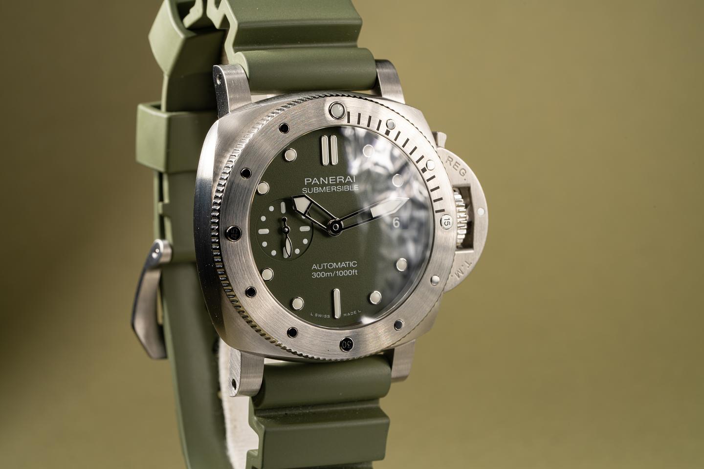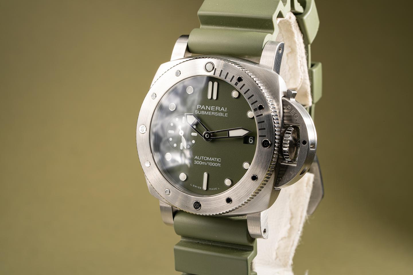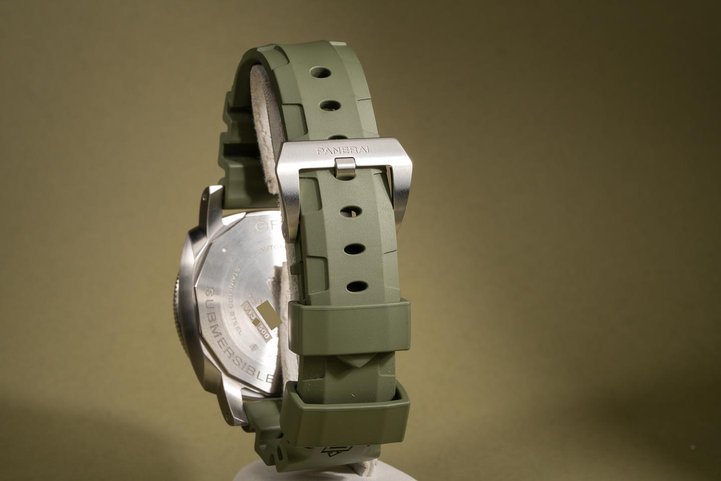 Bracelet: Excellent Panerai rubber dive strap in military green shows little to no wear.