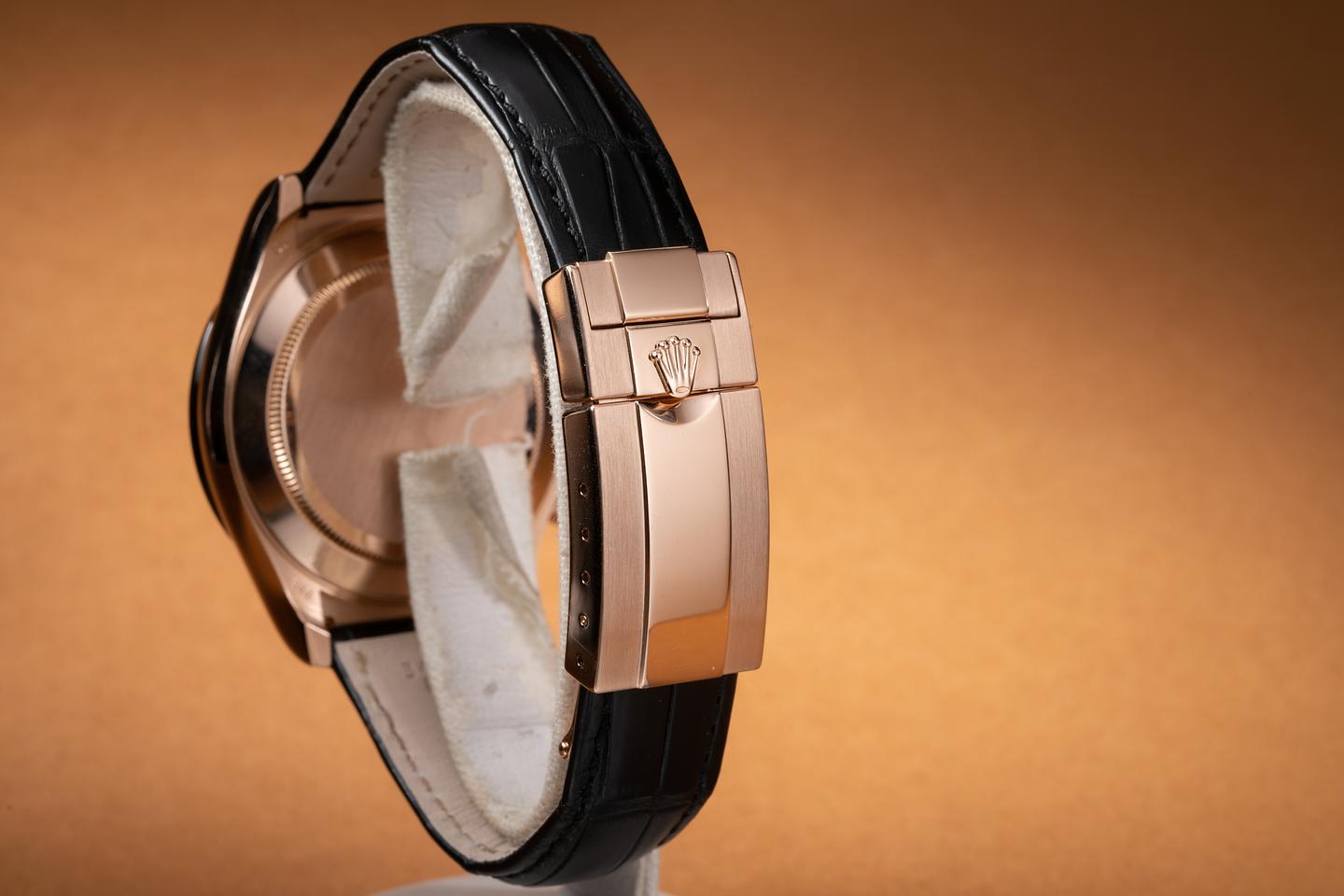 Bracelet: New Black alligator strap. The matching 18k everose clast is excellent showing only light wear from use.