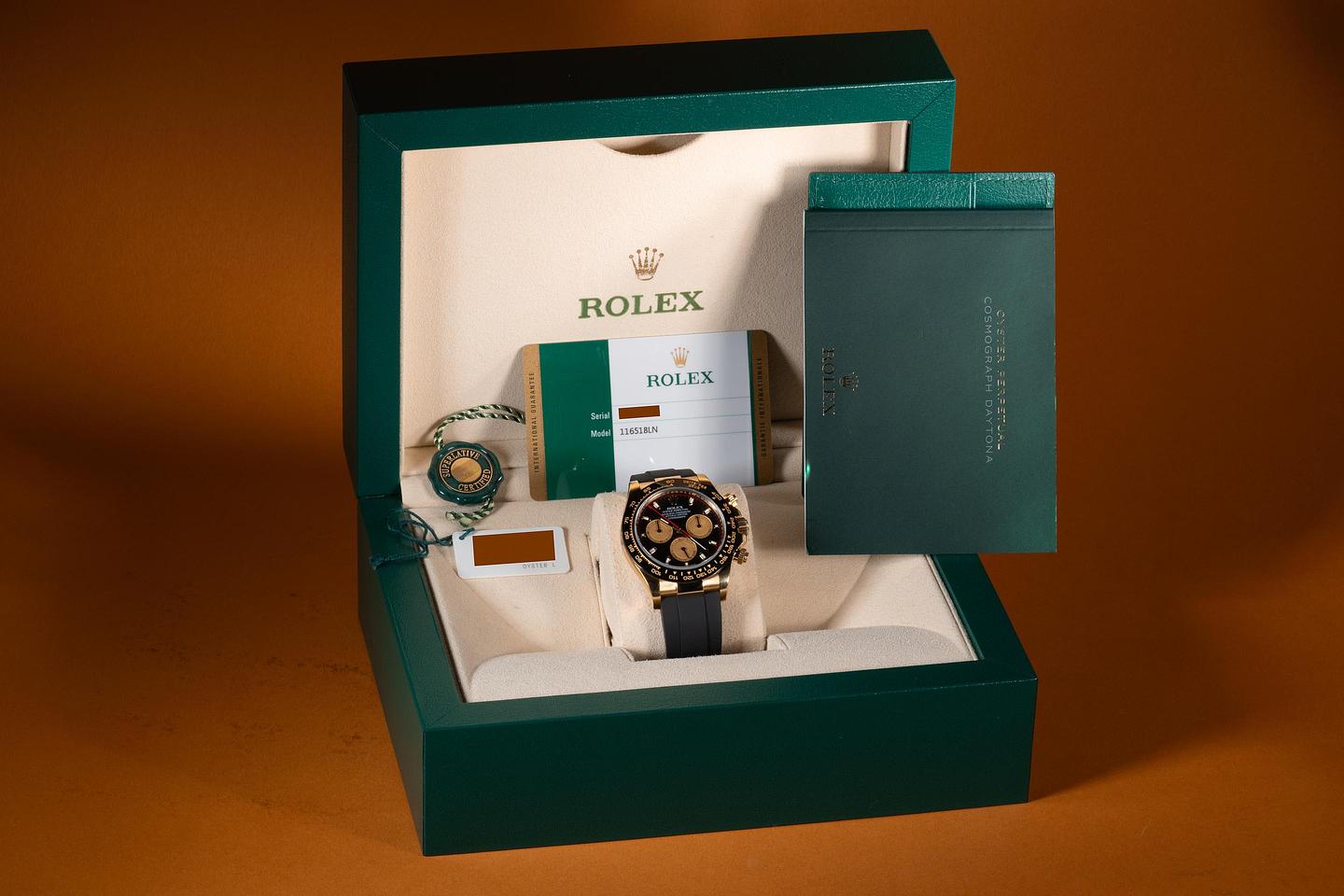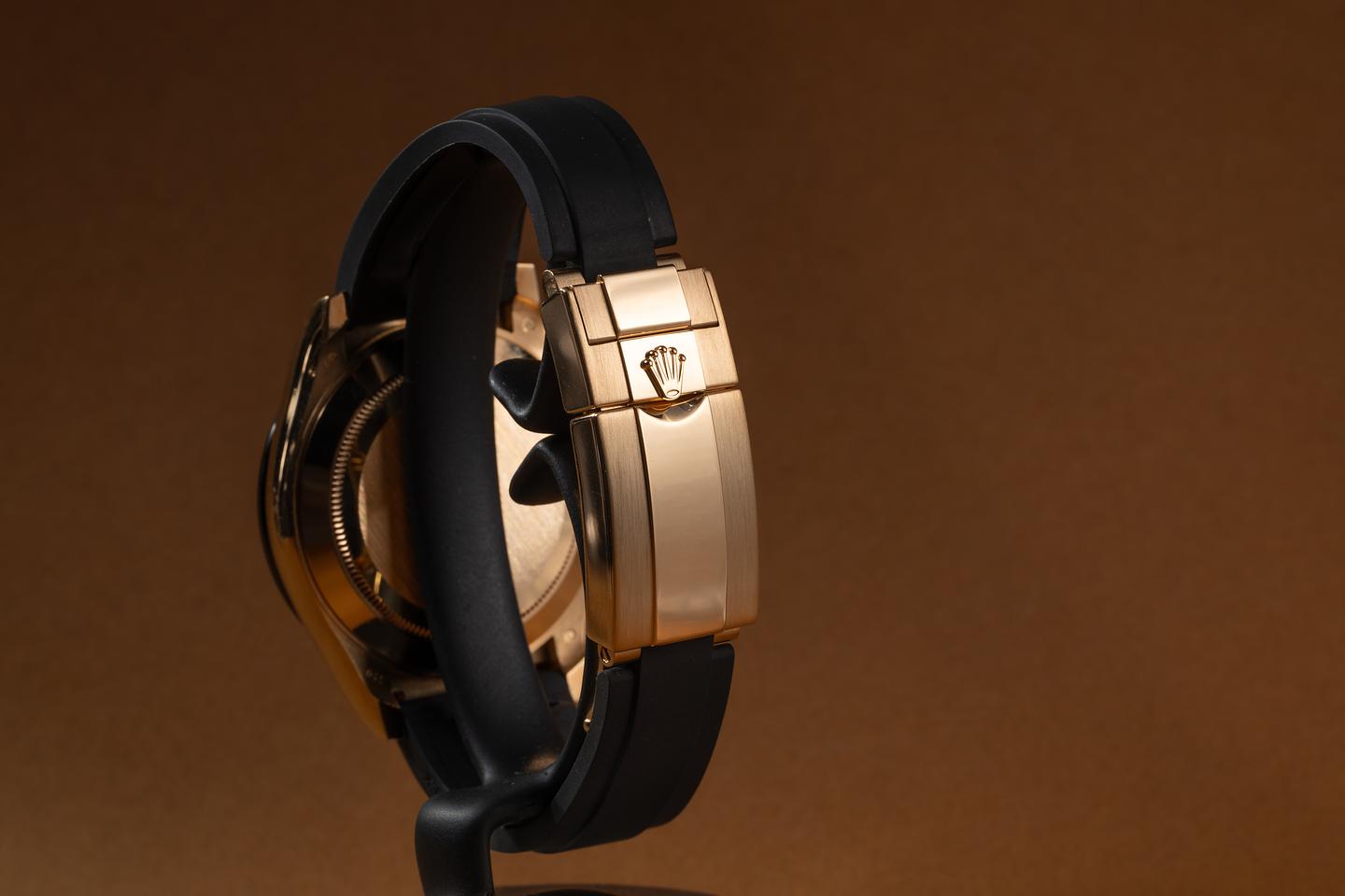 Bracelet: The Rolex Oysterflex rubber strap is excellent, showing only very light wear from use. The 18K yellow gold clasp is also in excellent condition, showing only very light wear. The strap will fit up to a 16.5 cm. / 6.49" wrist. (E + E-E).