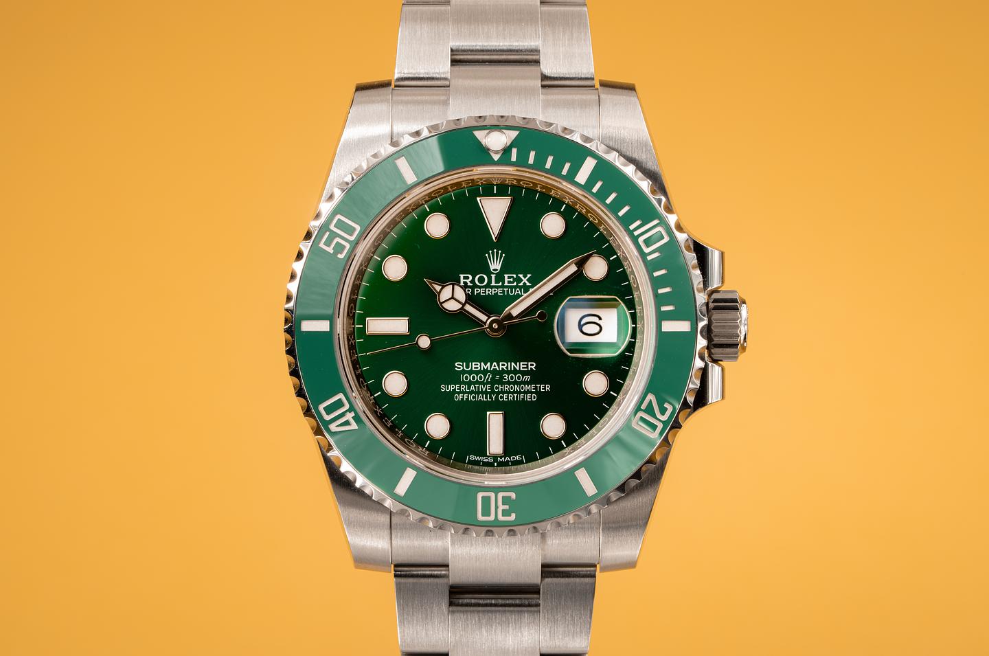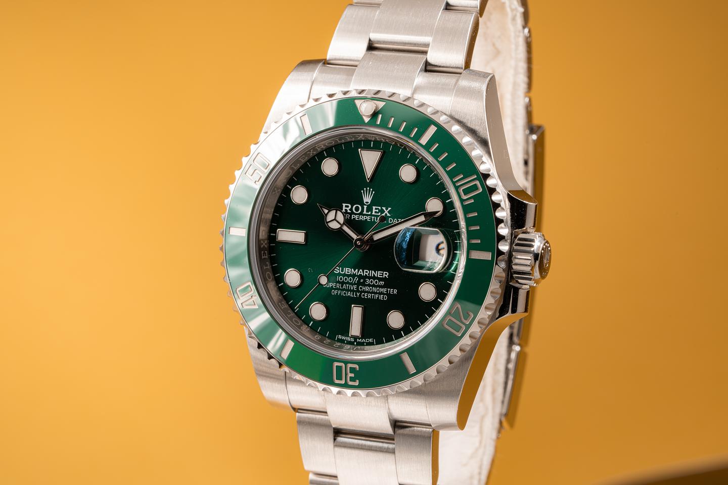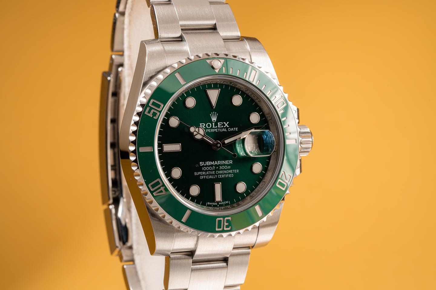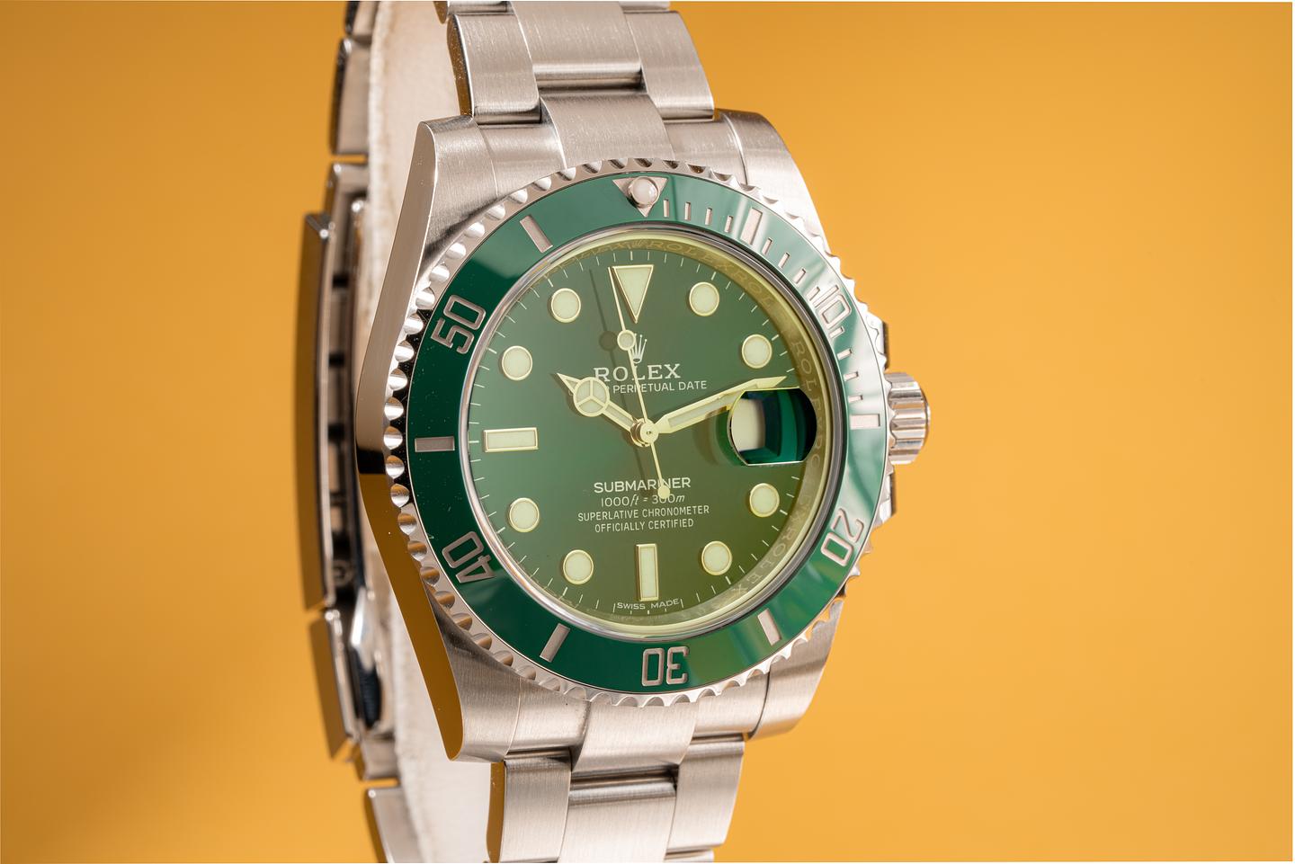 Case: The case is excellent and shows very light wear. The green ceramic bezel is also in excellent condition and shows very light wear.