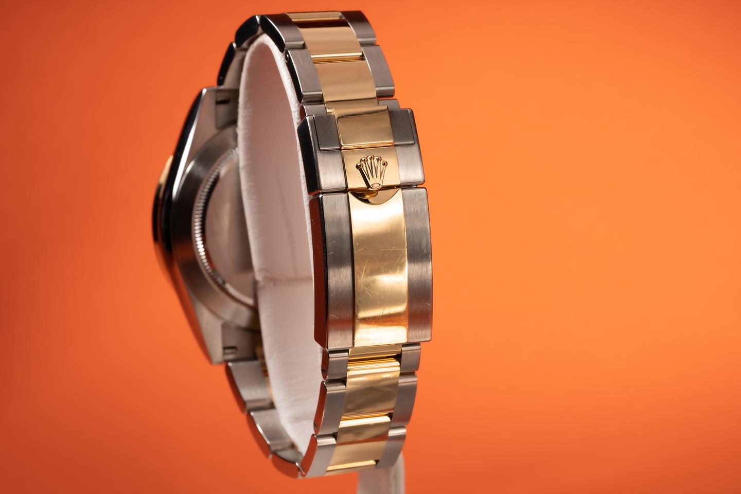 Case: The stainless case is excellent and shows light wear from use. The 18k yellow gold bezel is also excellent and shows light wear from use.