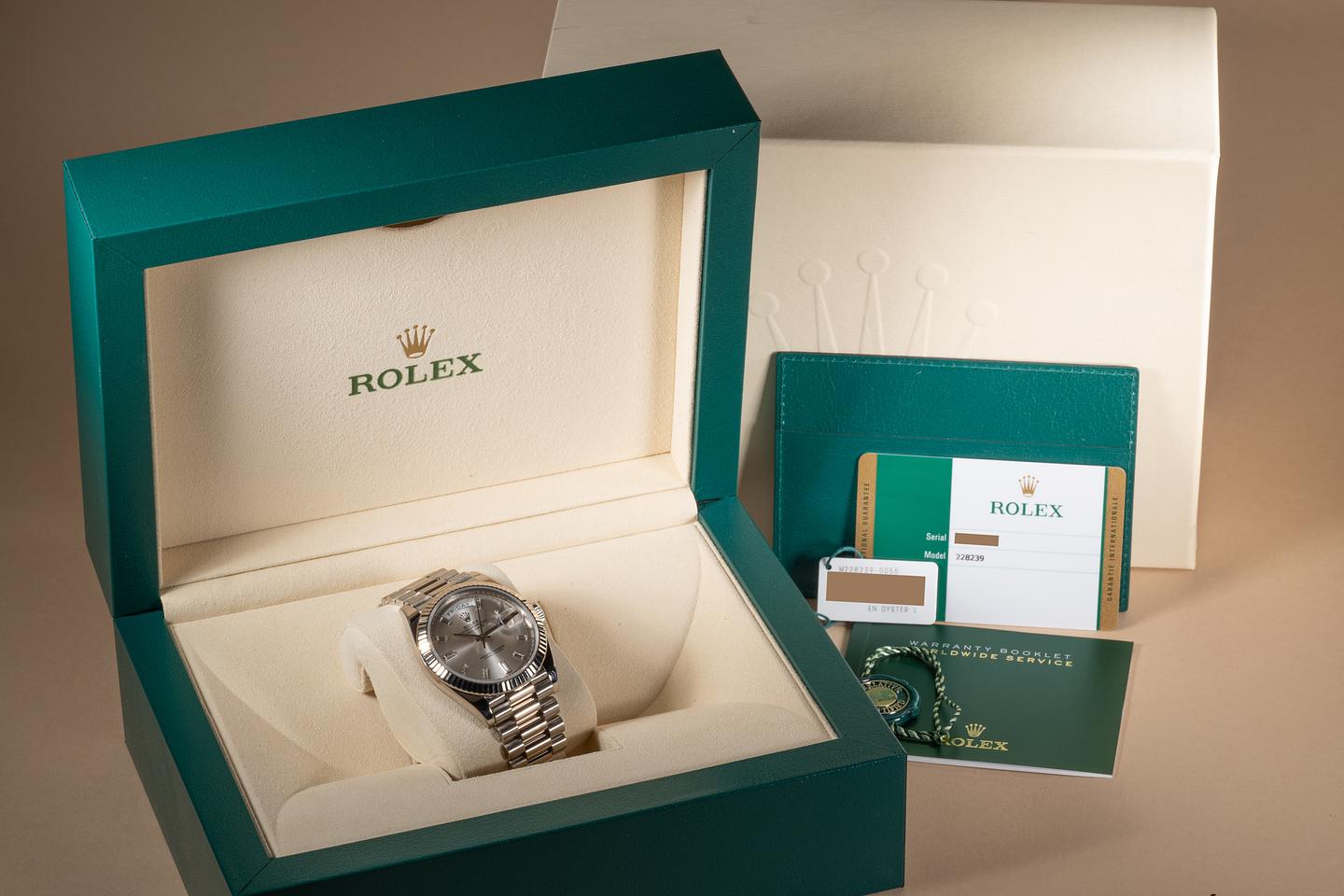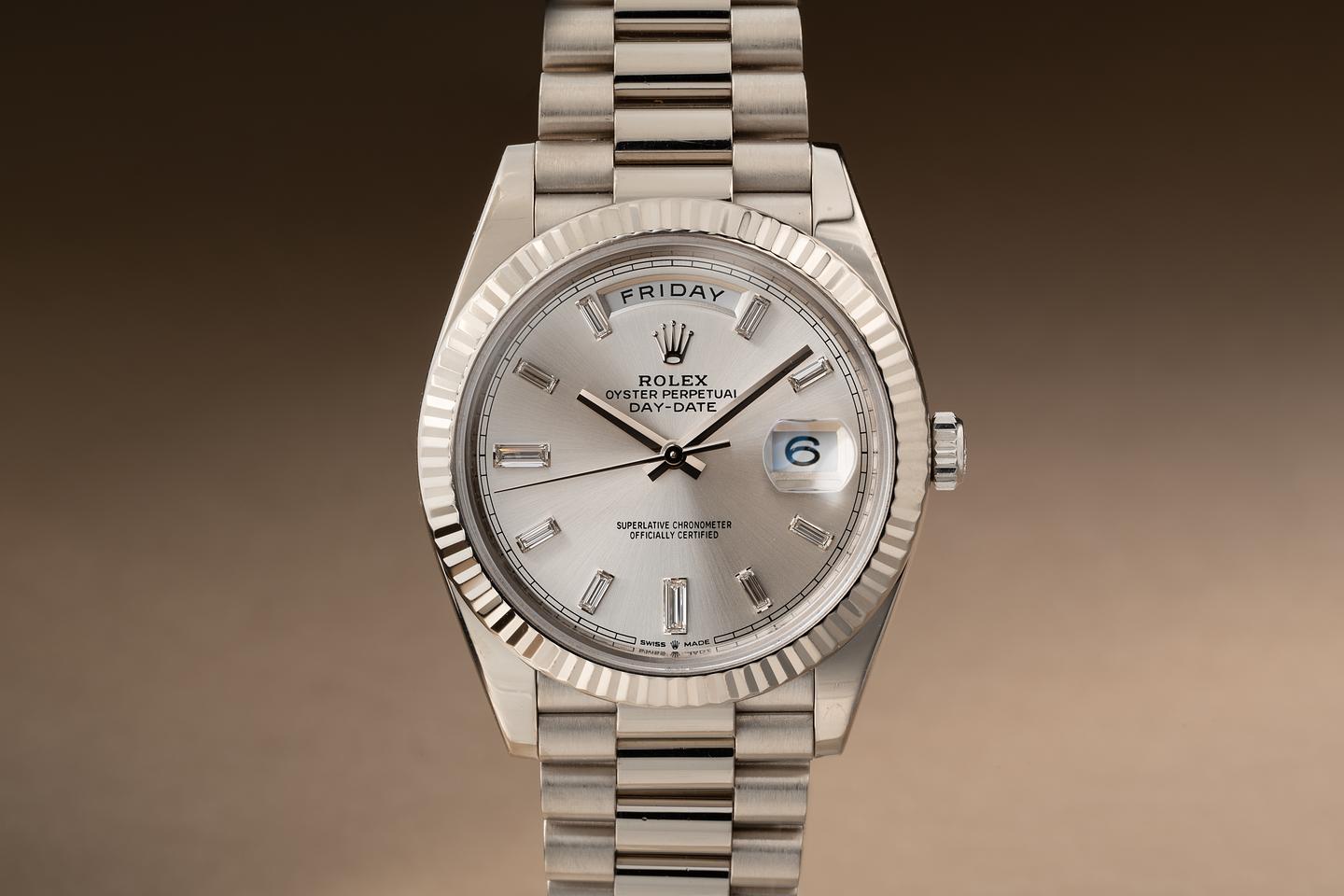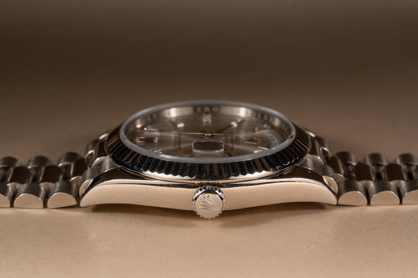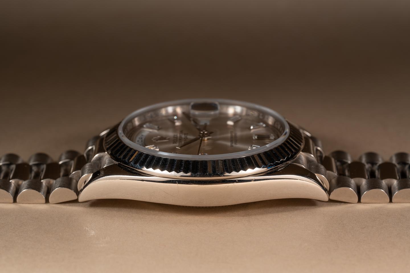 Case: The 18k white gold 40mm case is excellent showing only very light wear from use. The sharp 18k white gold fluted bezel is also in excellent condition showing only light wear from use.