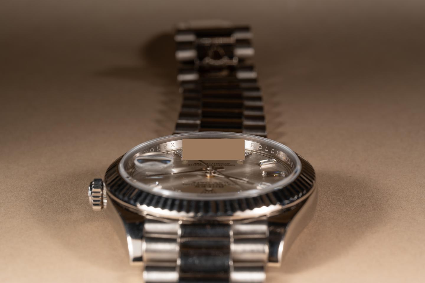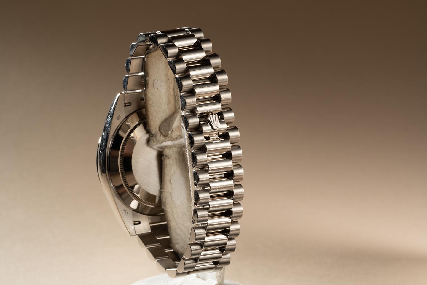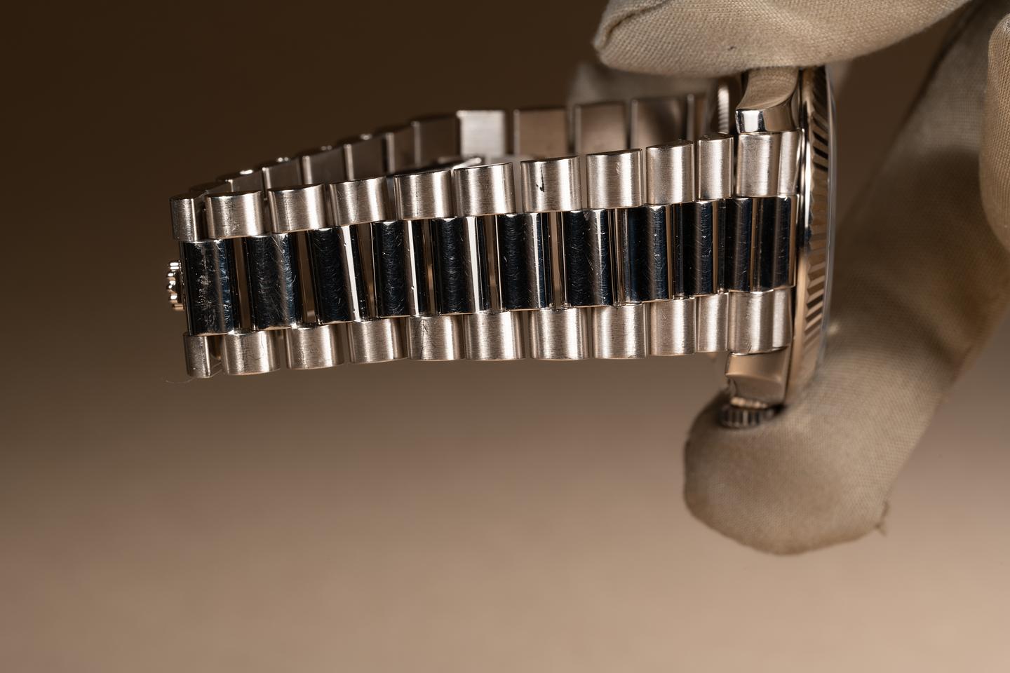 Bracelet: The 22 link 18K white gold President bracelet is excellent showing only very light stretch.