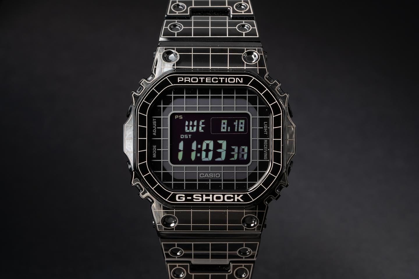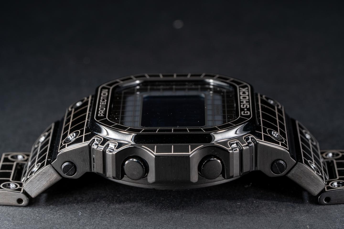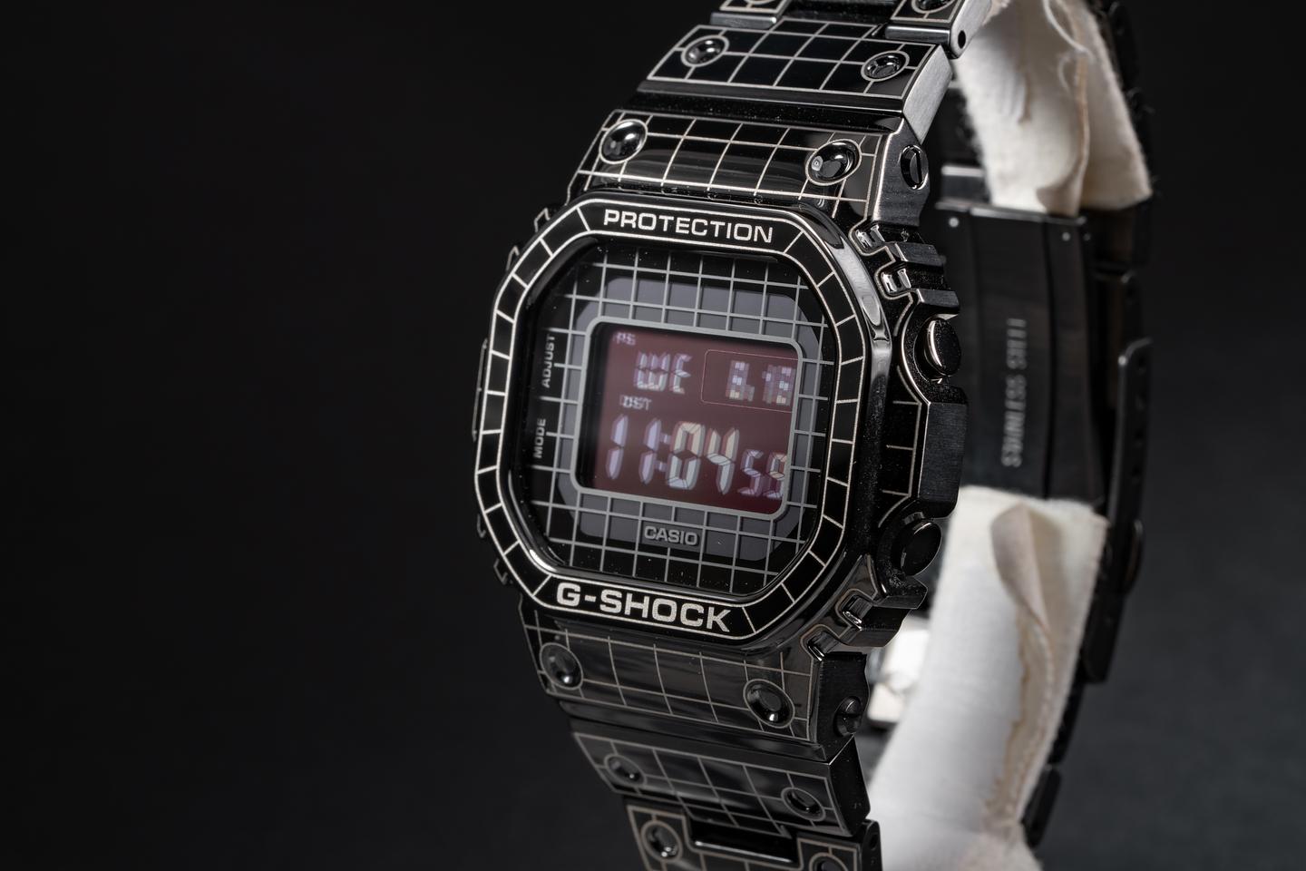 Notes: This laser-engraved model is a new variation on the full-metal square-face GMWB5000 that inherits plenty of the DNA of the original G-SHOCK DW5000C. The surface of the stainless steel case and band of the base model GMWB5000D is given a black IP finish, which is then laser etched to create an innovative Grid Tunnel pattern. The Grid Tunnel finish of this model adds a new modern touch to the timeless, classical design of the 5000 Series G-SHOCK