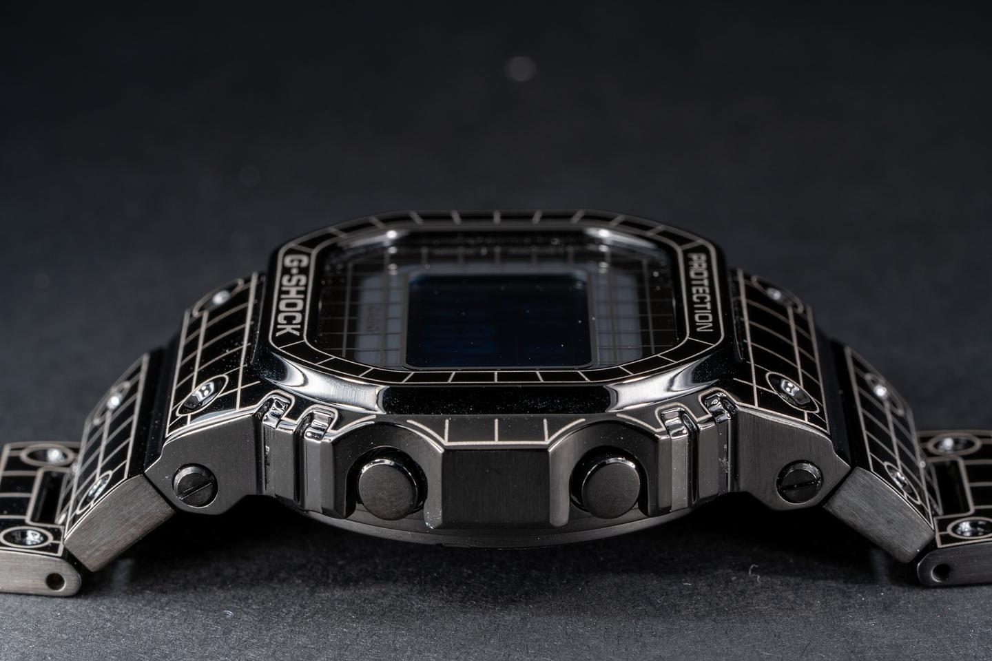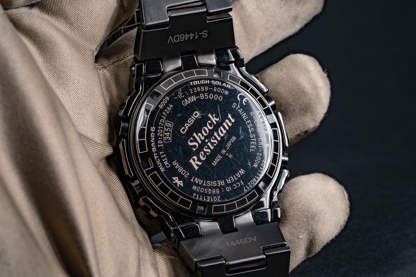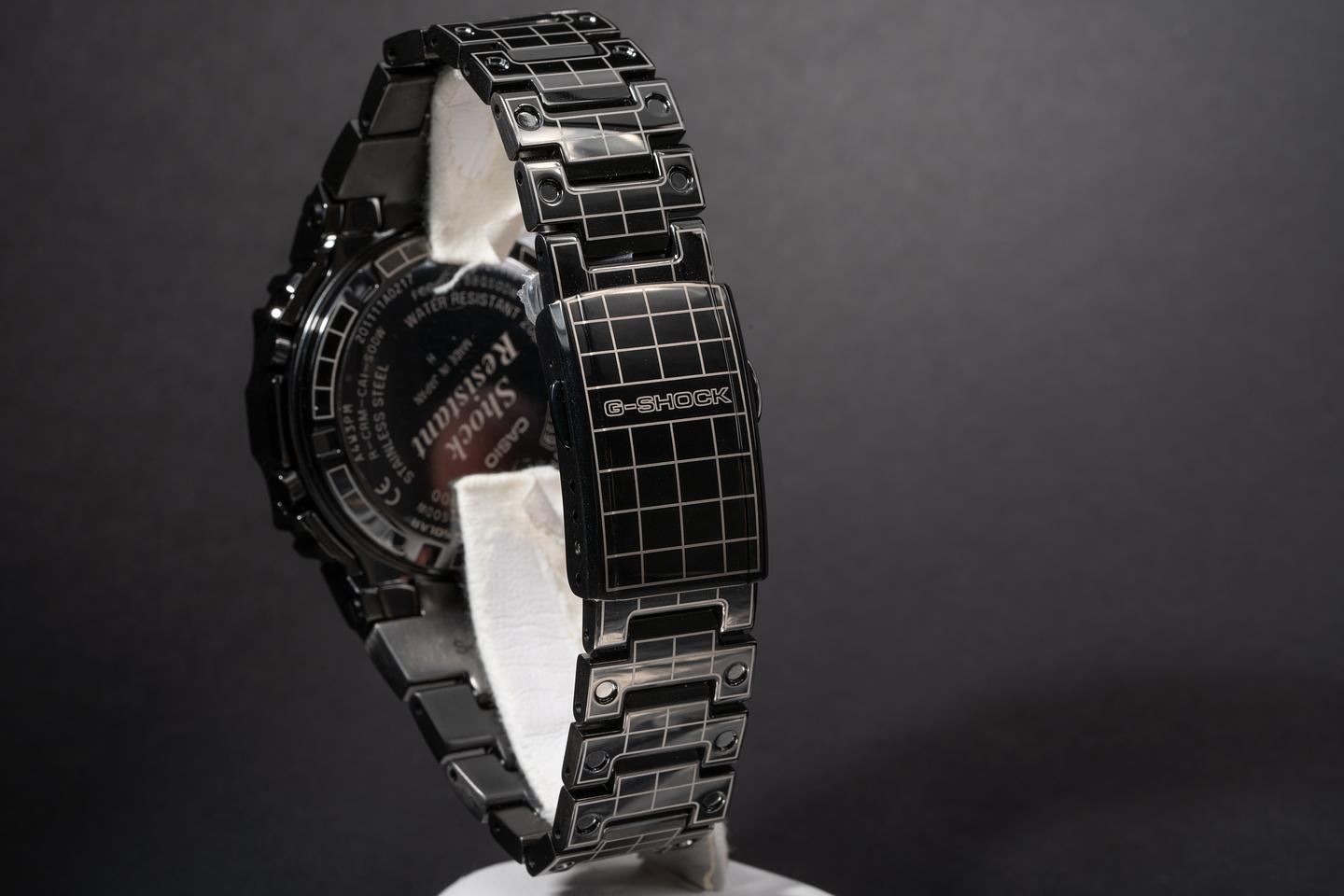 Notes: This laser-engraved model is a new variation on the full-metal square-face GMWB5000 that inherits plenty of the DNA of the original G-SHOCK DW5000C. The surface of the stainless steel case and band of the base model GMWB5000D is given a black IP finish, which is then laser etched to create an innovative Grid Tunnel pattern. The Grid Tunnel finish of this model adds a new modern touch to the timeless, classical design of the 5000 Series G-SHOCK