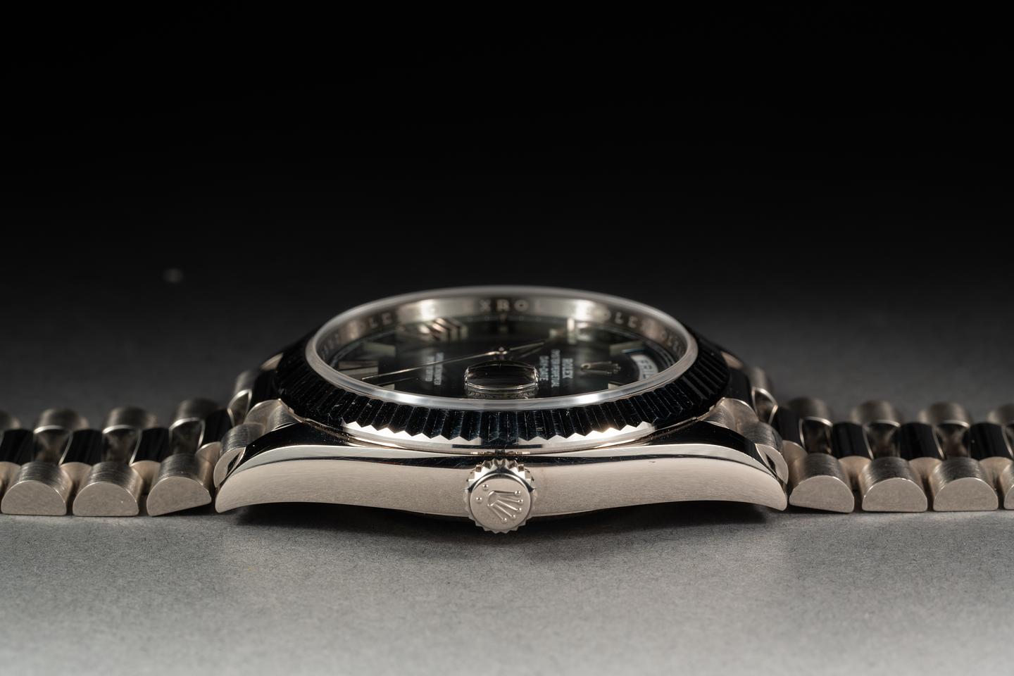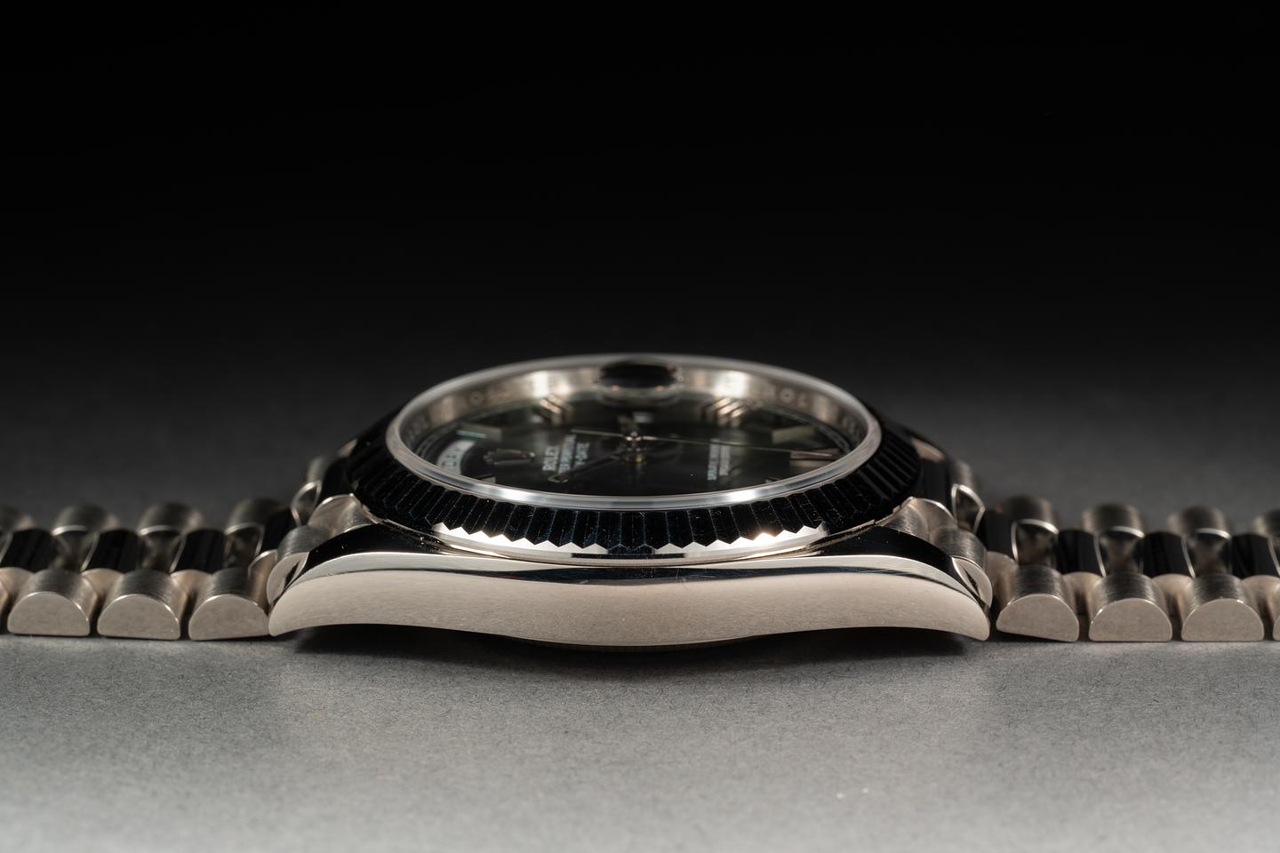 Case: The 40mm 18K white gold case is excellent showing only very light wear. The sharp 18K white gold fluted bezel is also in excellent condition showing only very light wear.