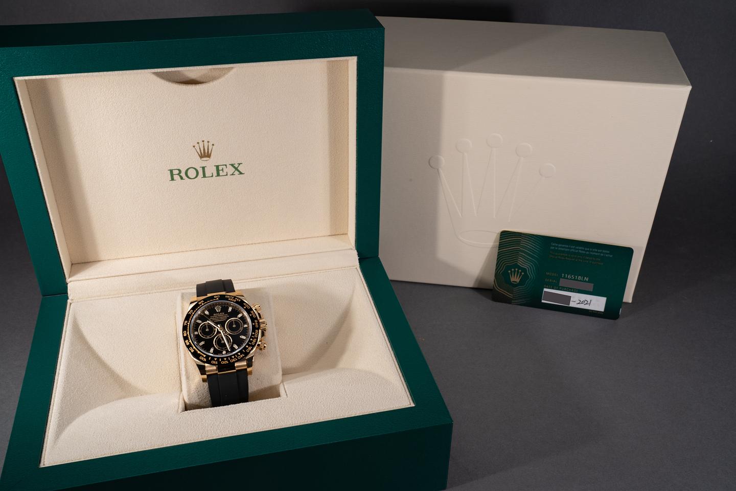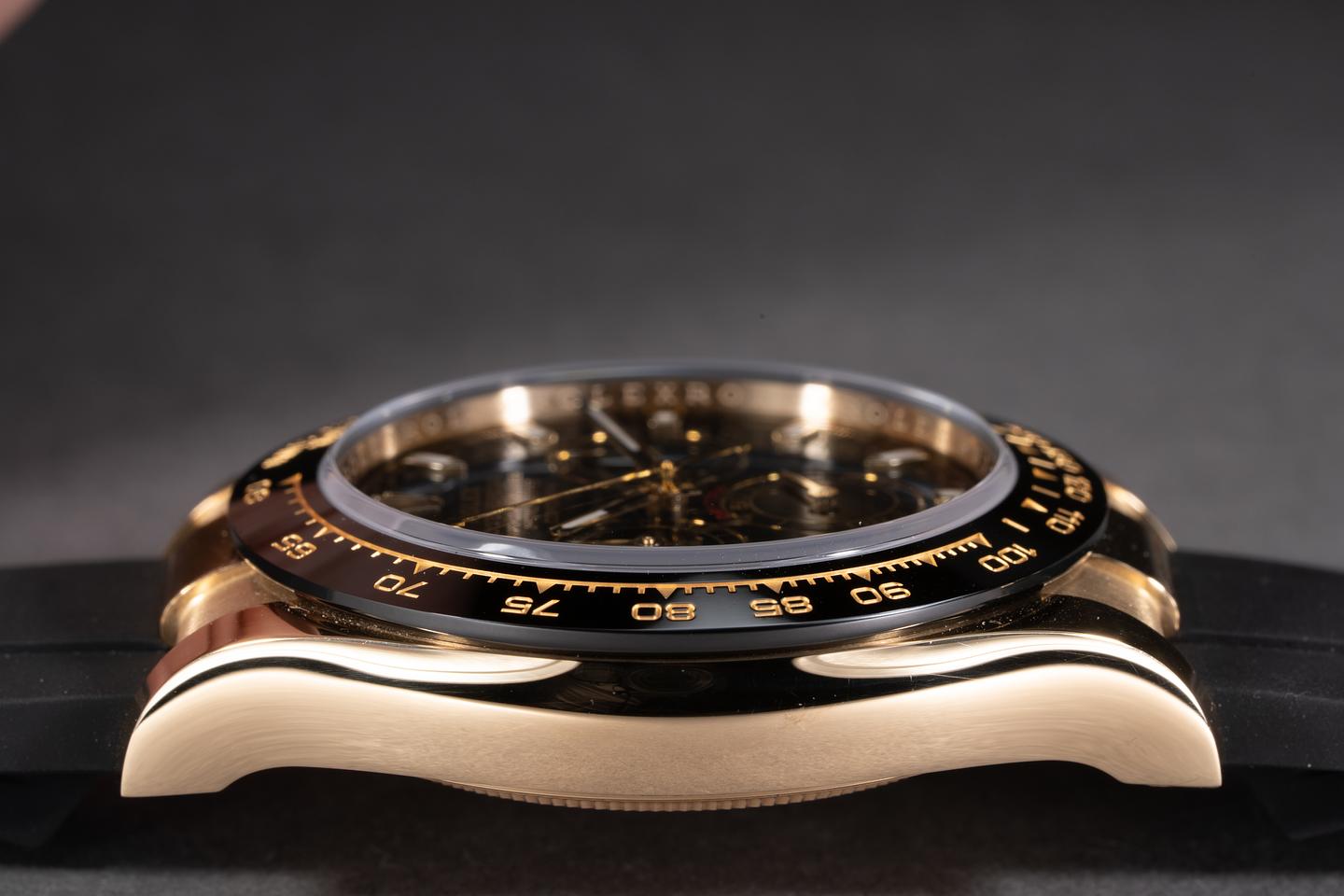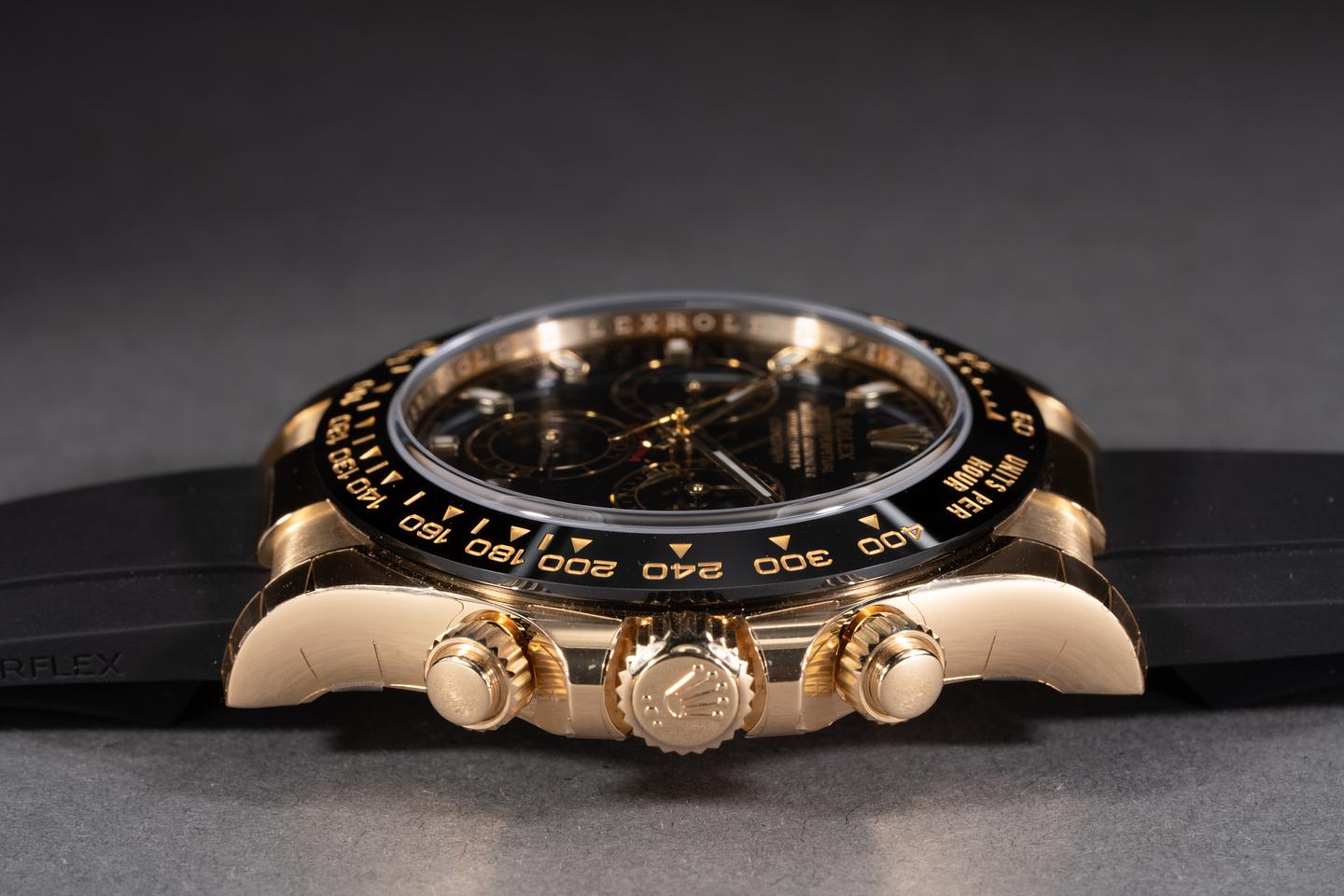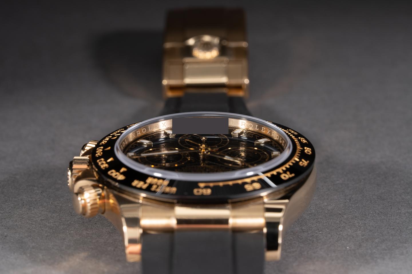Case: The 18k yellow gold case is mint with some of the factory protective stickers still in place. The black ceramic bezel is mint.