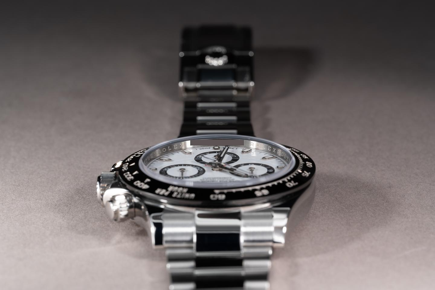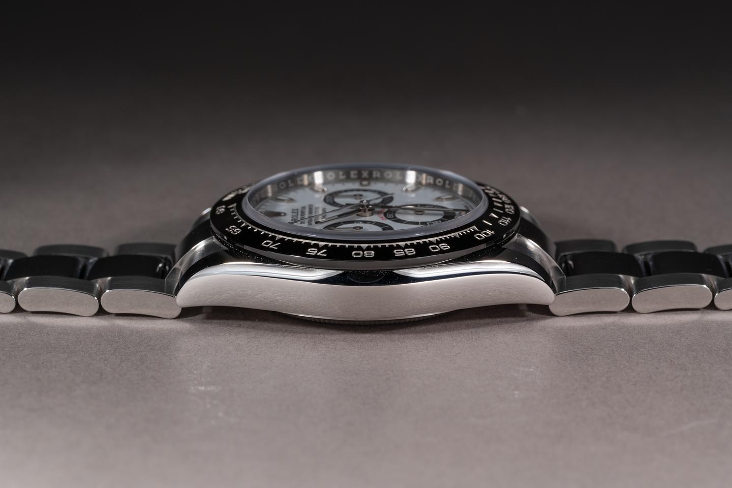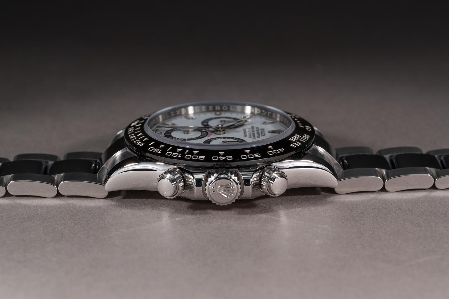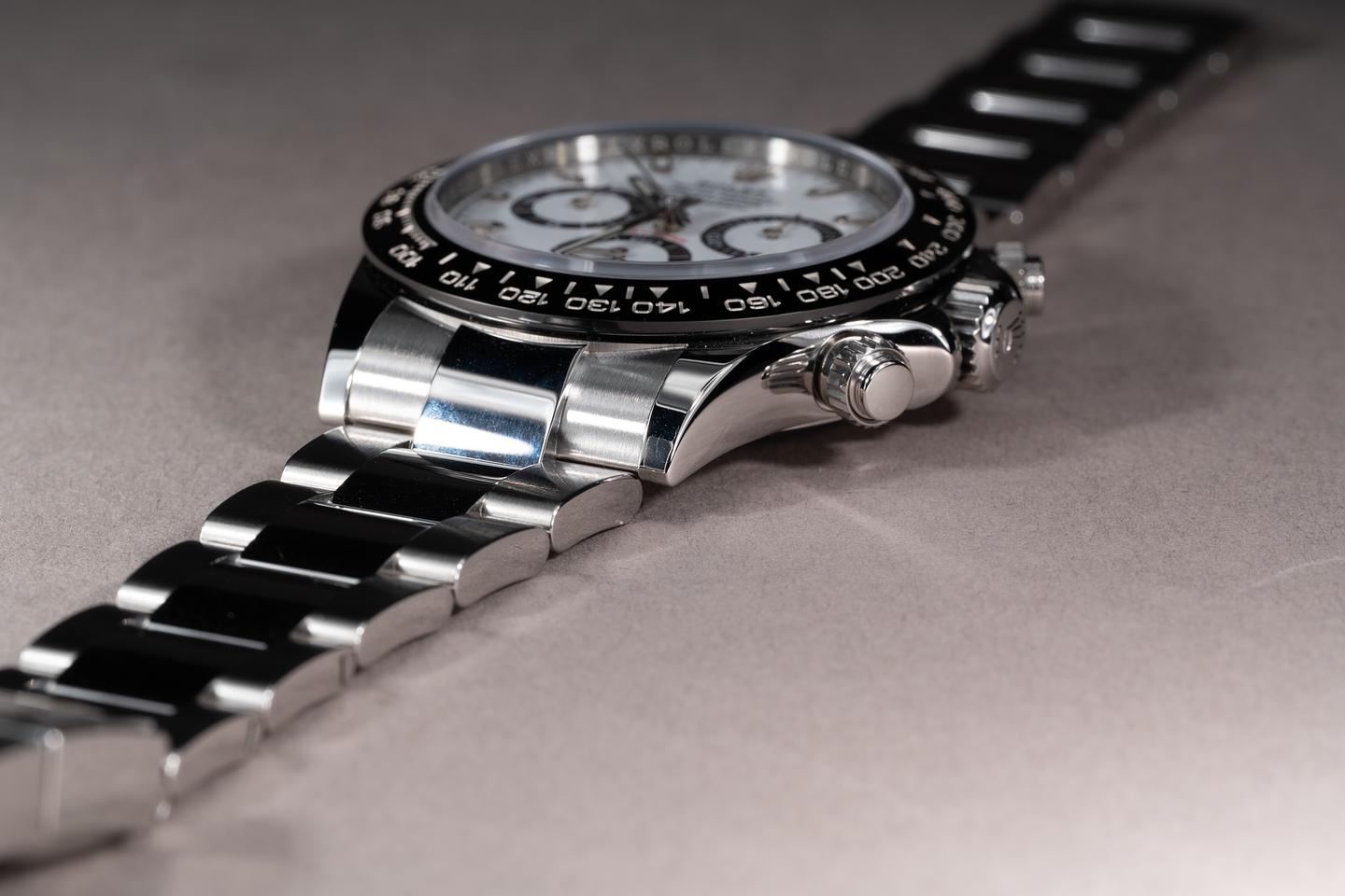 Case: The case appears to be unworn showing only extremely light wear. One of the factory protective stickers is still in place on the tip of the 5 o'clock lug. The black ceramic bezel is mint.