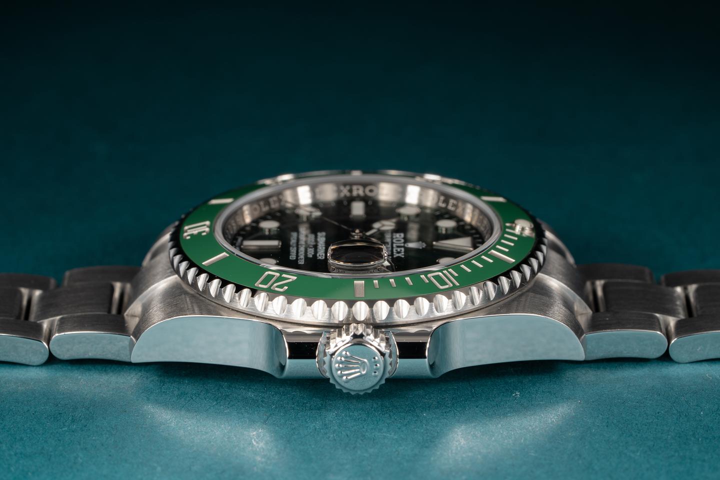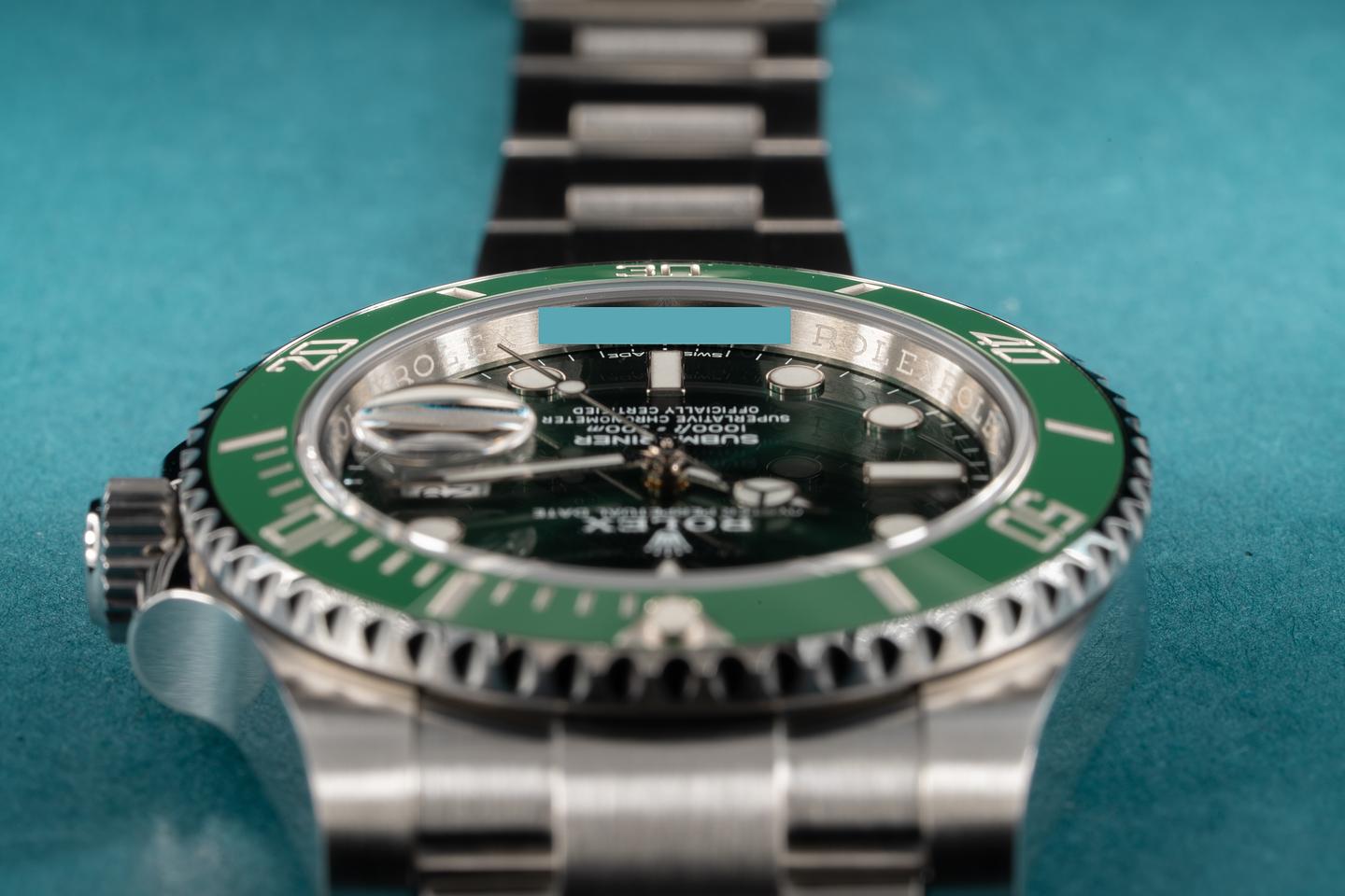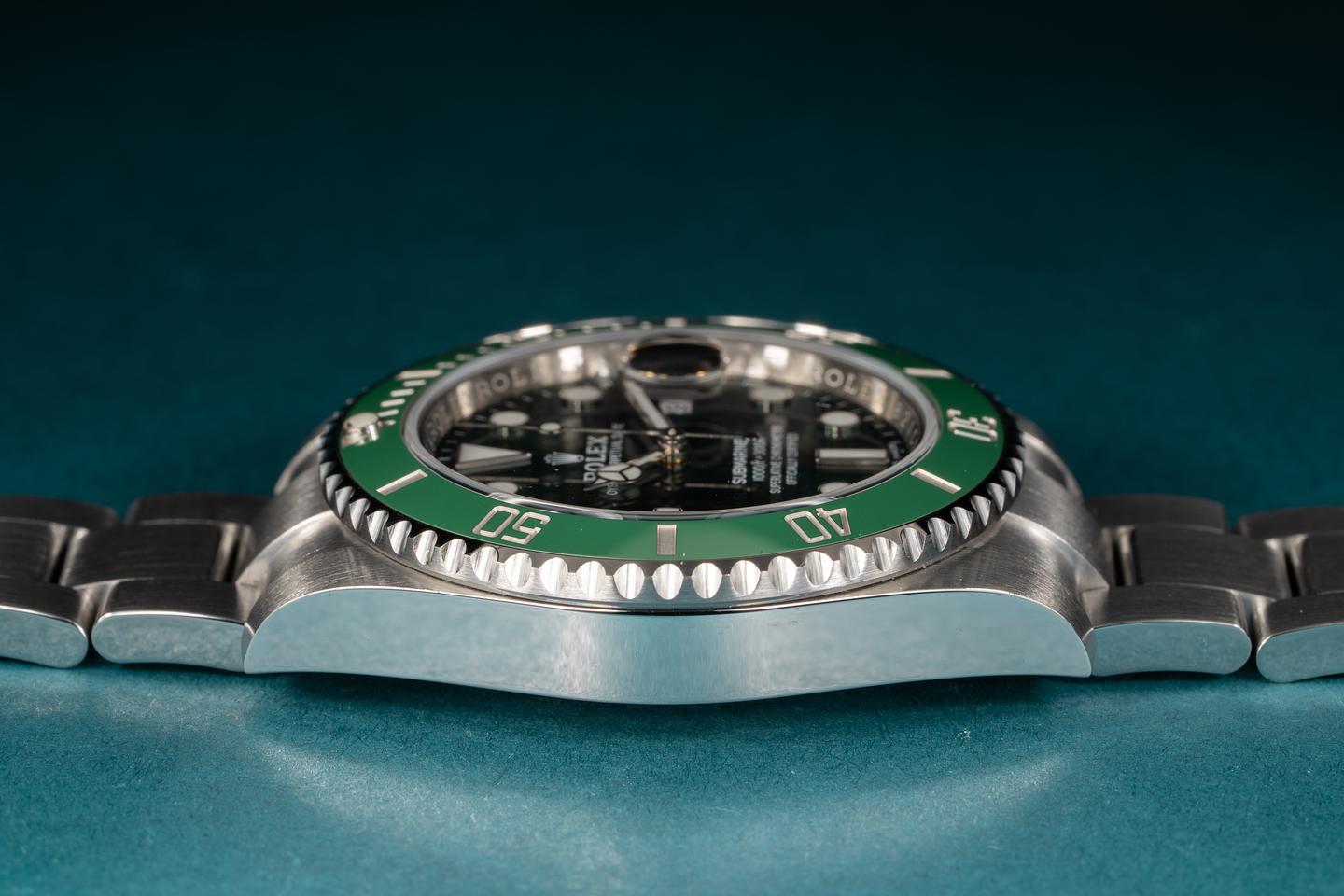 Case: The case is excellent and shows only light wear from use. The green ceramic bezel insert is also excellent and shows little if any wear.