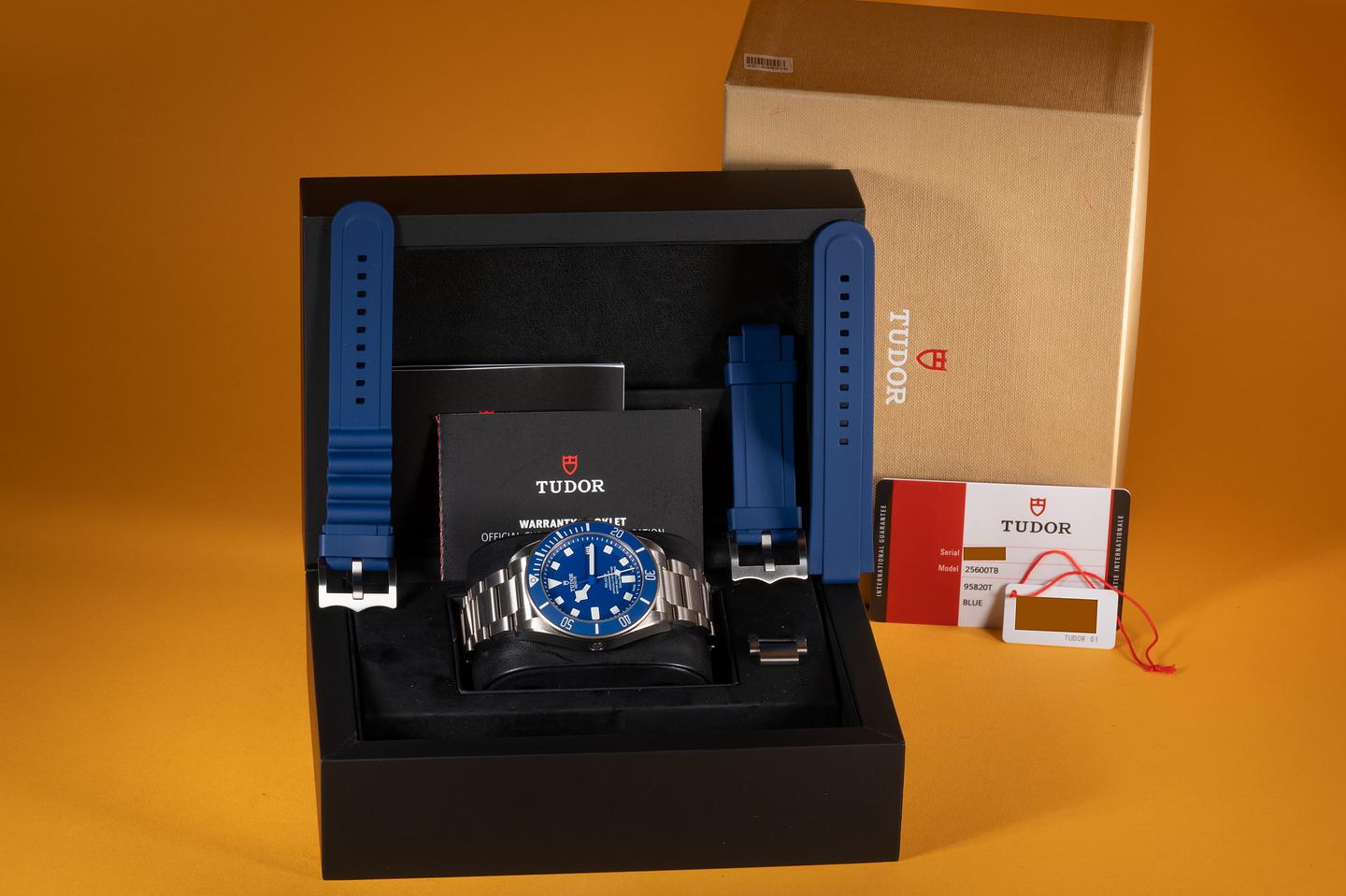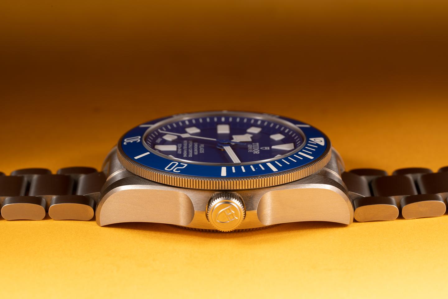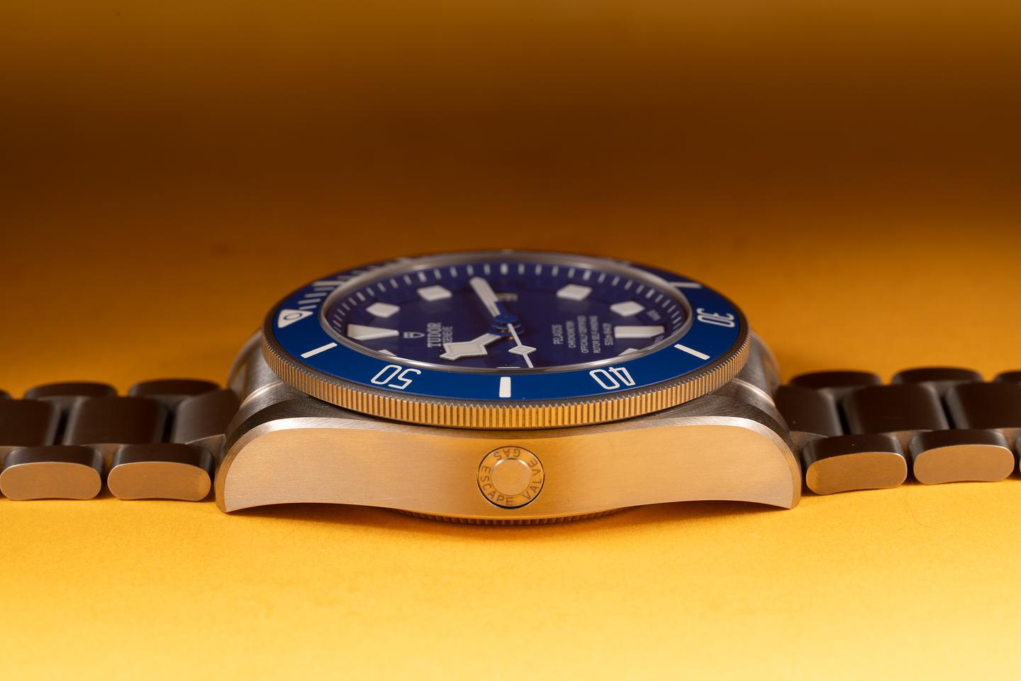 Case: The titanium case is excellent showing only very light wear from sue. The blue ceramic bezel is also in excellent condition showing no visible wear.