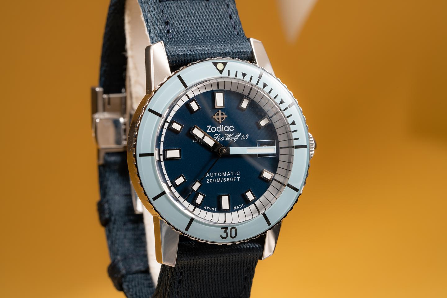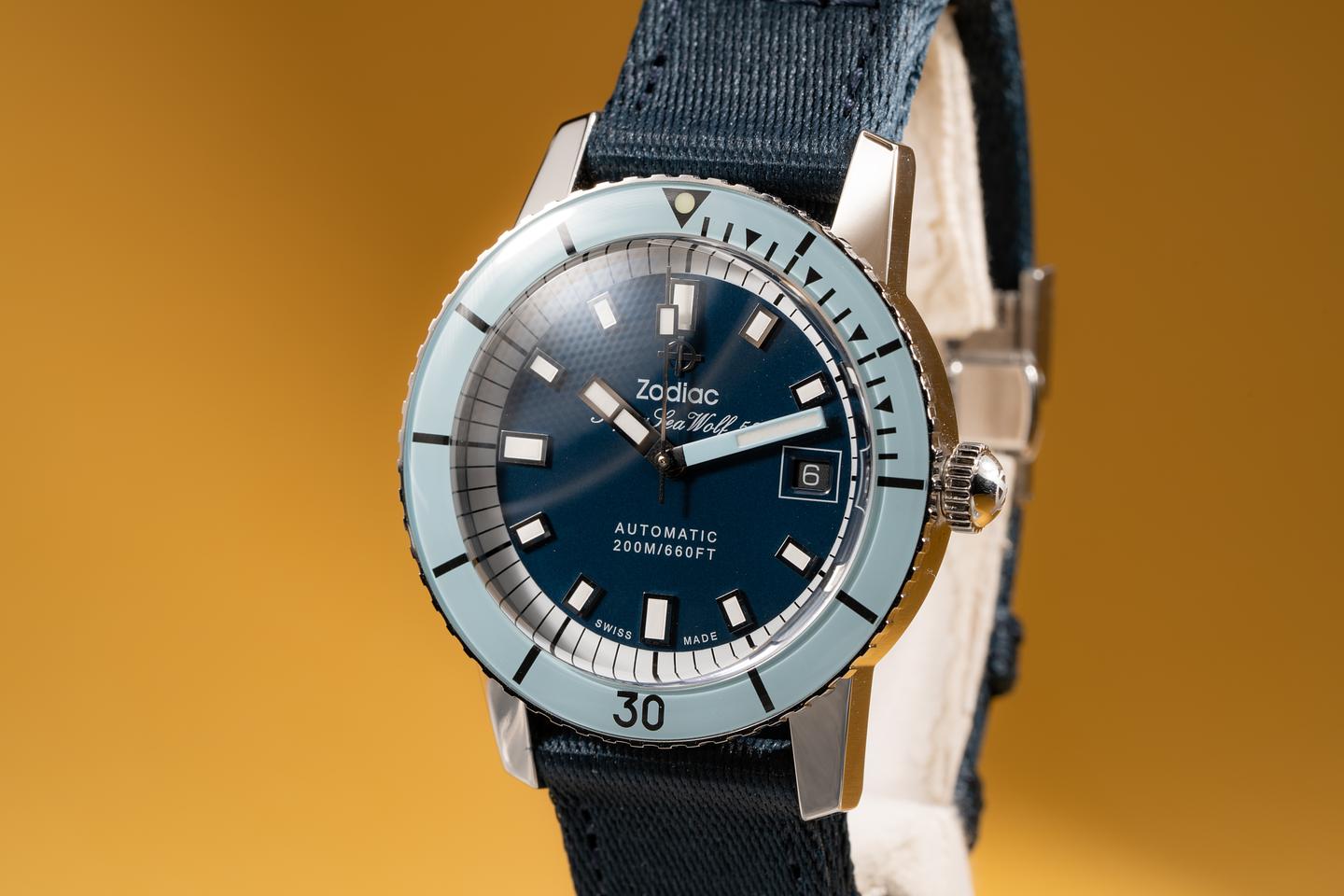 Notes: Zodiac has been creating fun unconventional watches for a long time now. Fortunately, the recent reboot is no different. The new Super Sea Wolf mixes vintage and modern perfectly with long sexy lugs on a 40mm case, a robust bakelite inspired bezel, and a fun multi-colored dial.