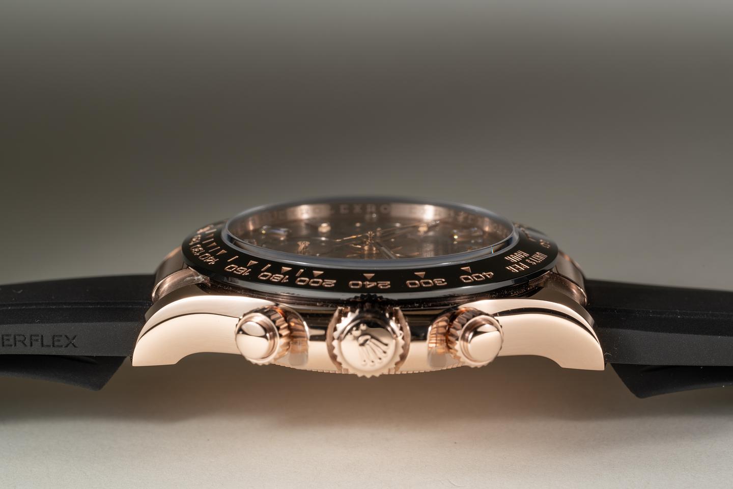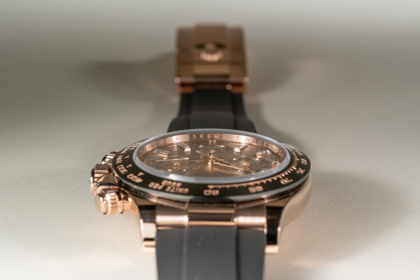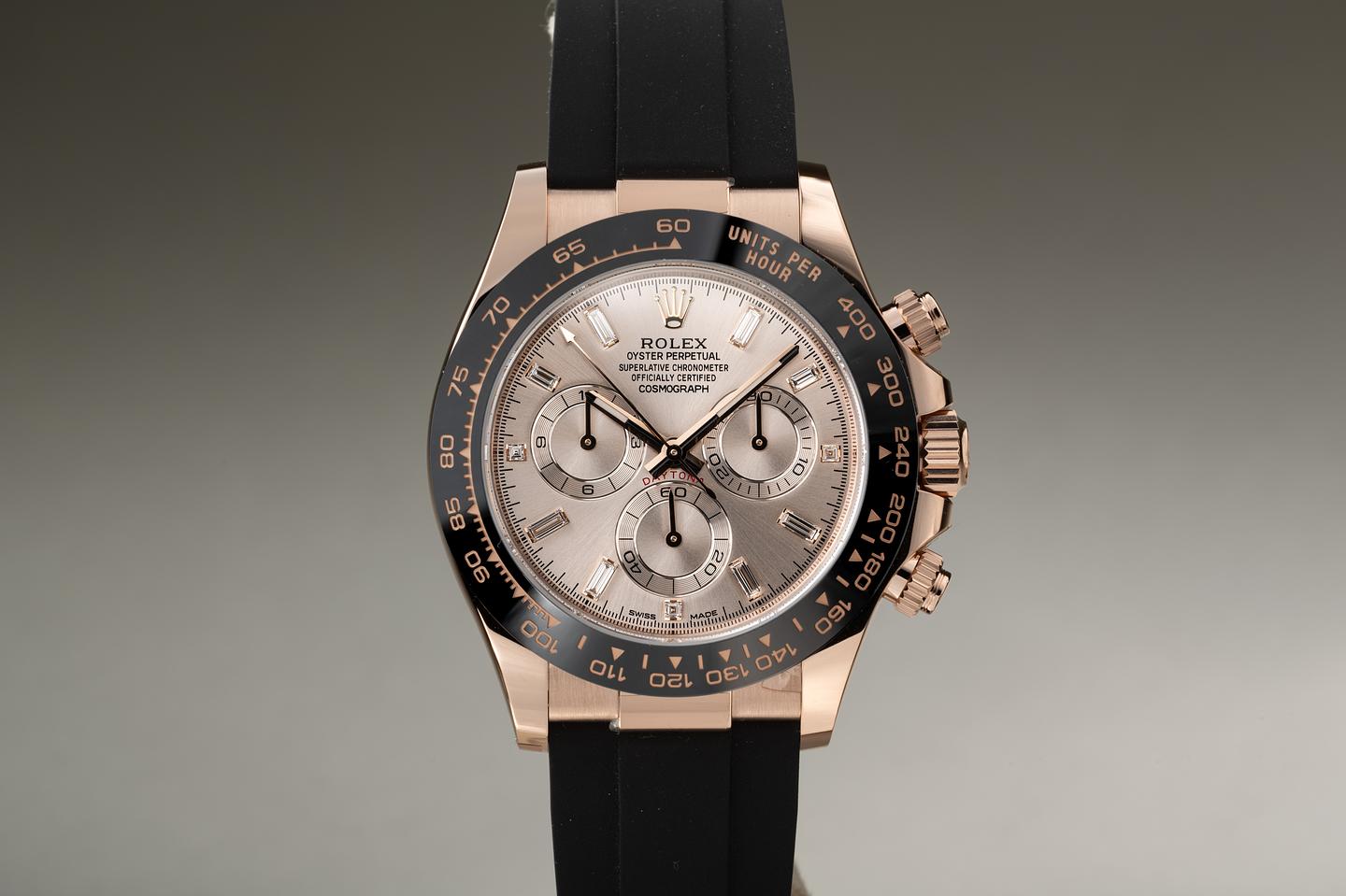 Case: The 18k Everose case is excellent with a few stickers still on the case. The black ceramic bezel is also in excellent condition showing no visible wear.