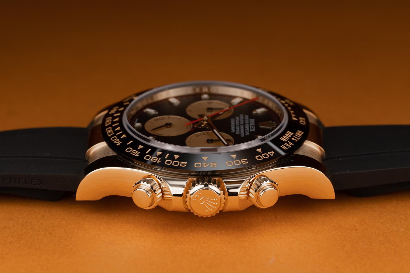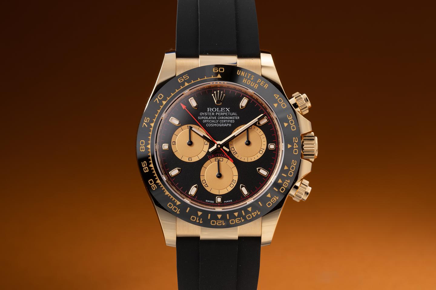 Case: The unpolished 18k yellow gold case is excellent showing only very light wear. The black ceramic bezel is also in excellent condition showing no visible wear.