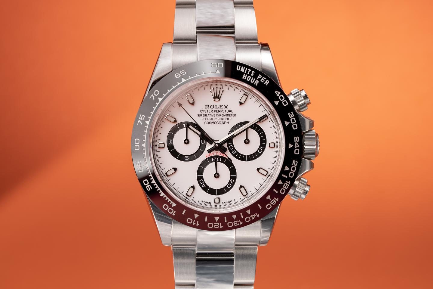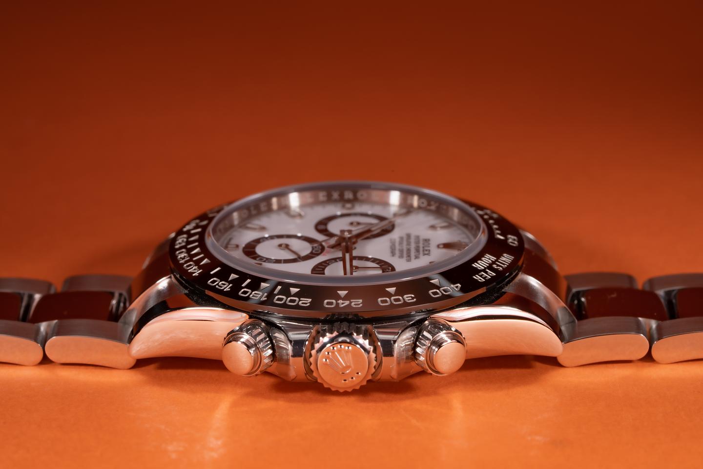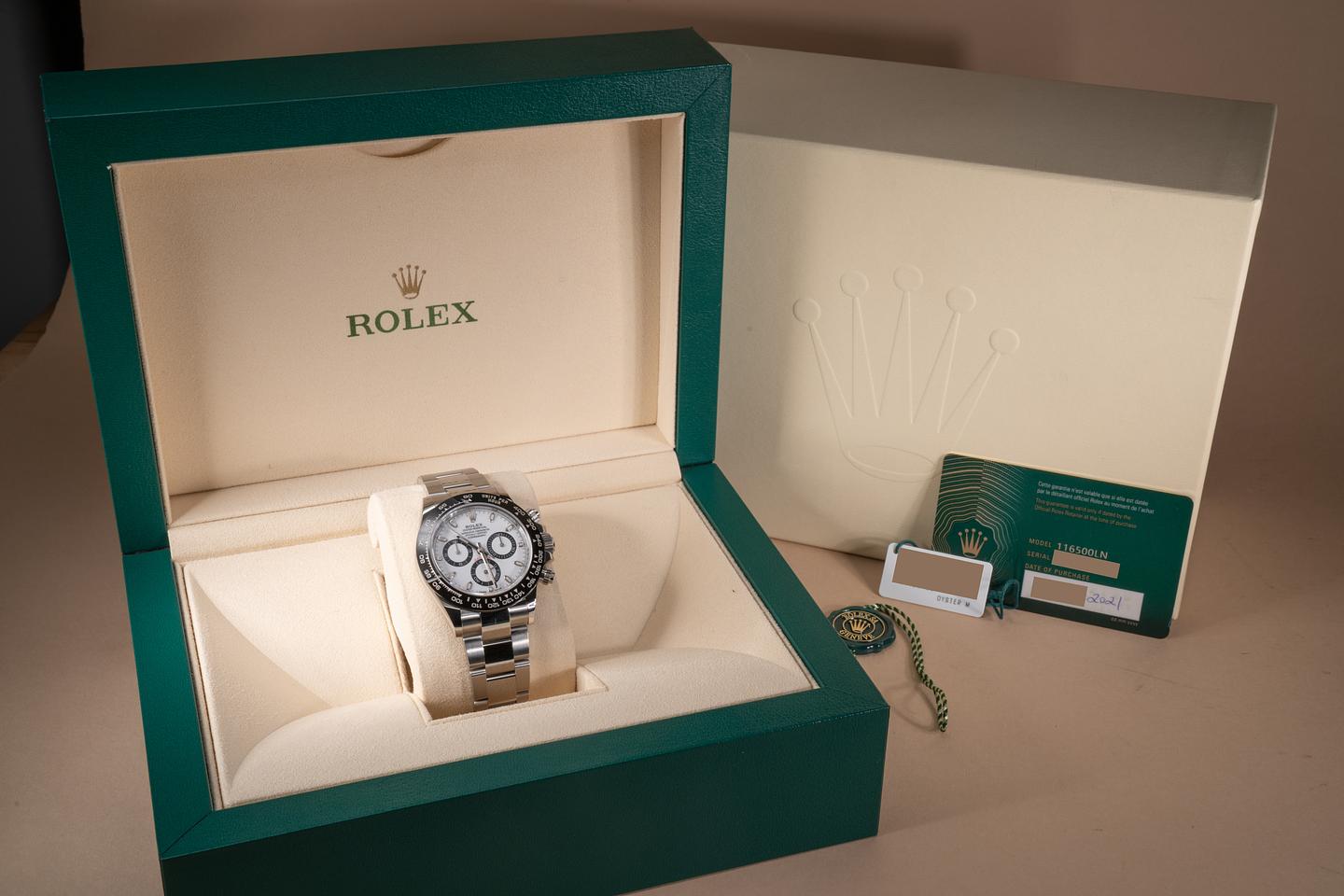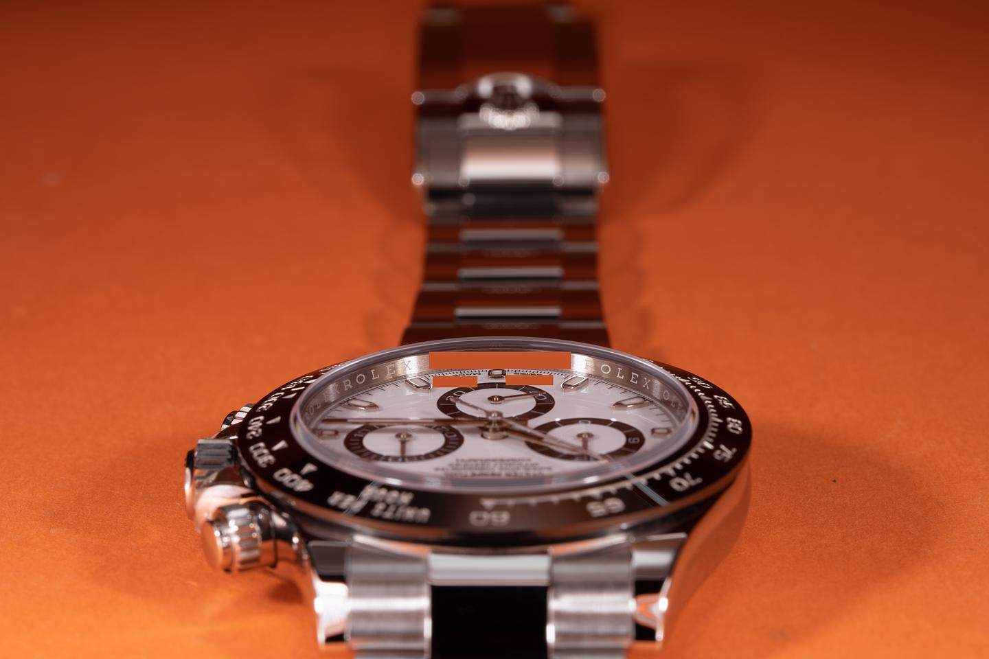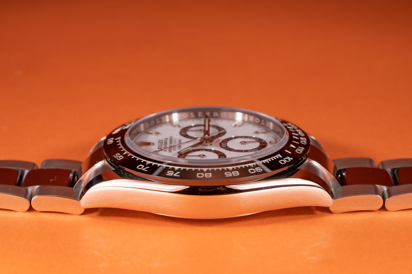 Case: The case is near mint and appears to be unworn showing only extremely light shop wear. The black ceramic bezel is mint showing no visible wear.