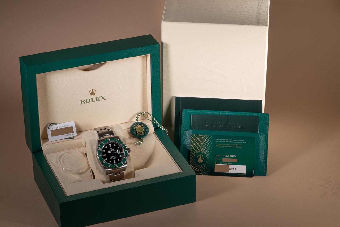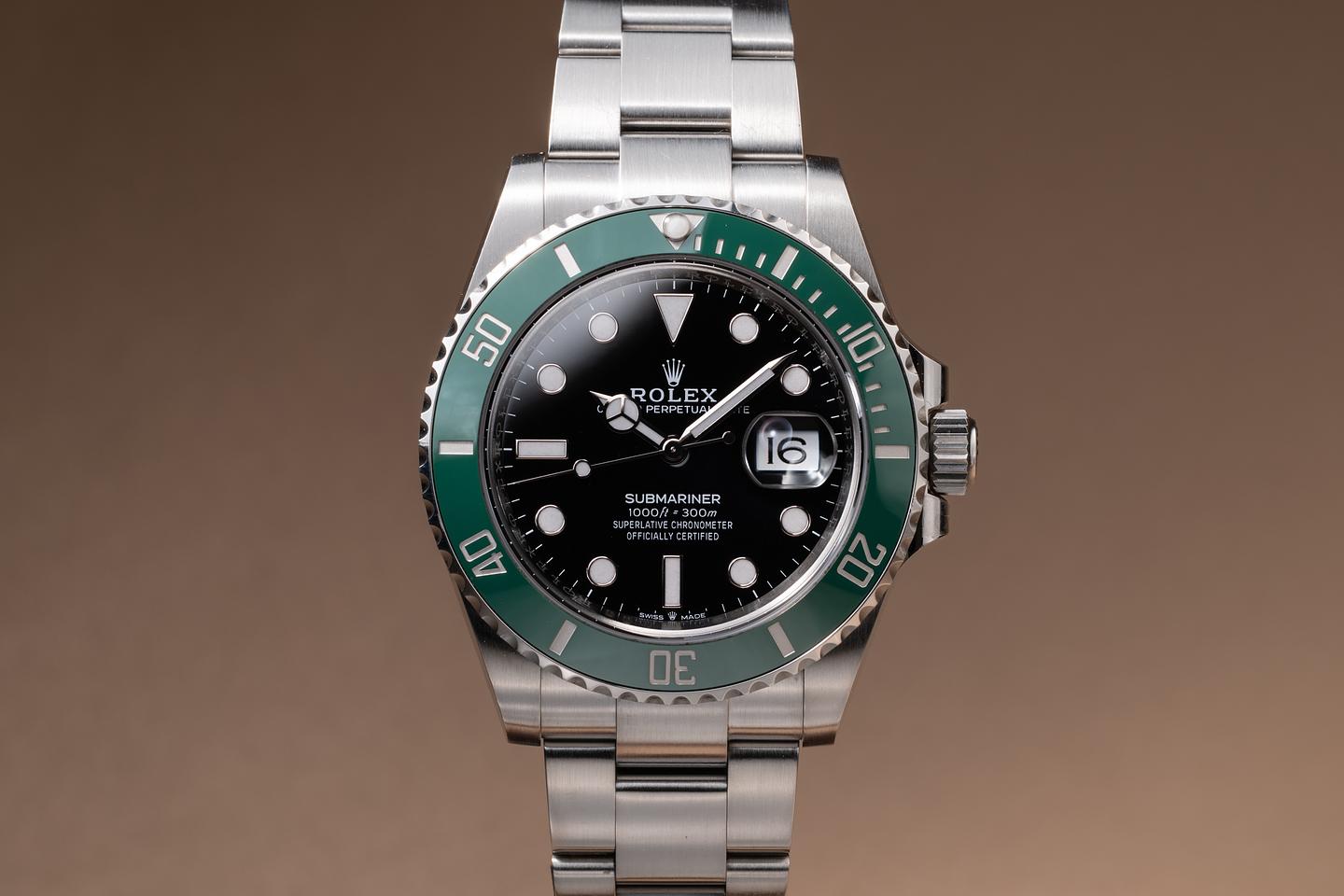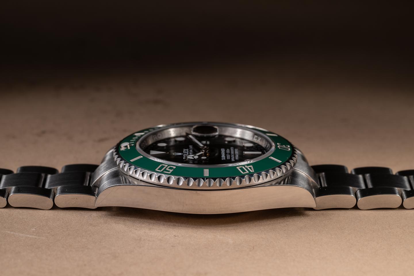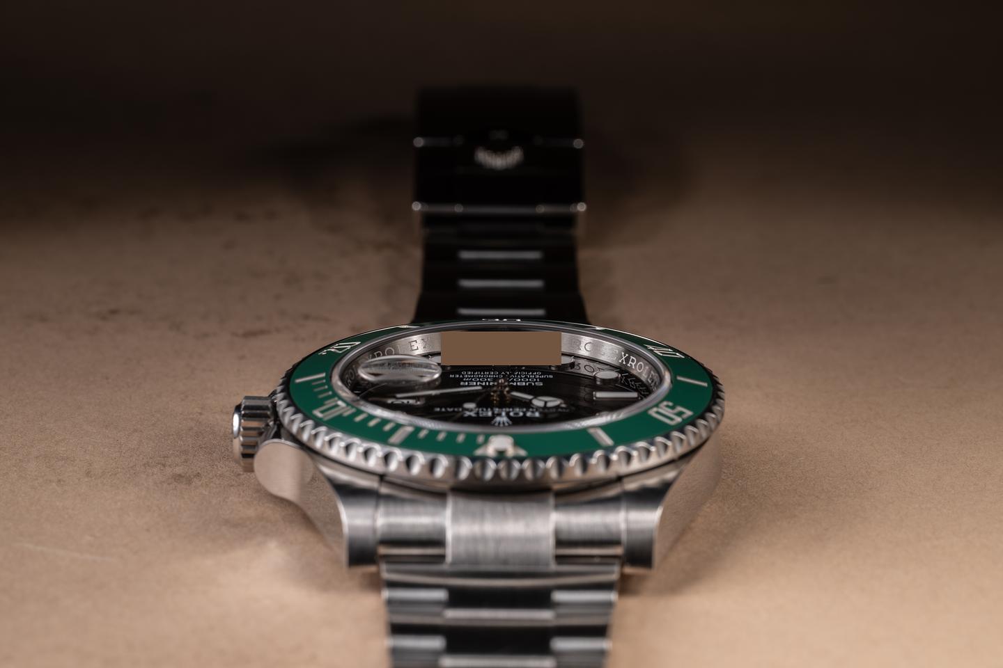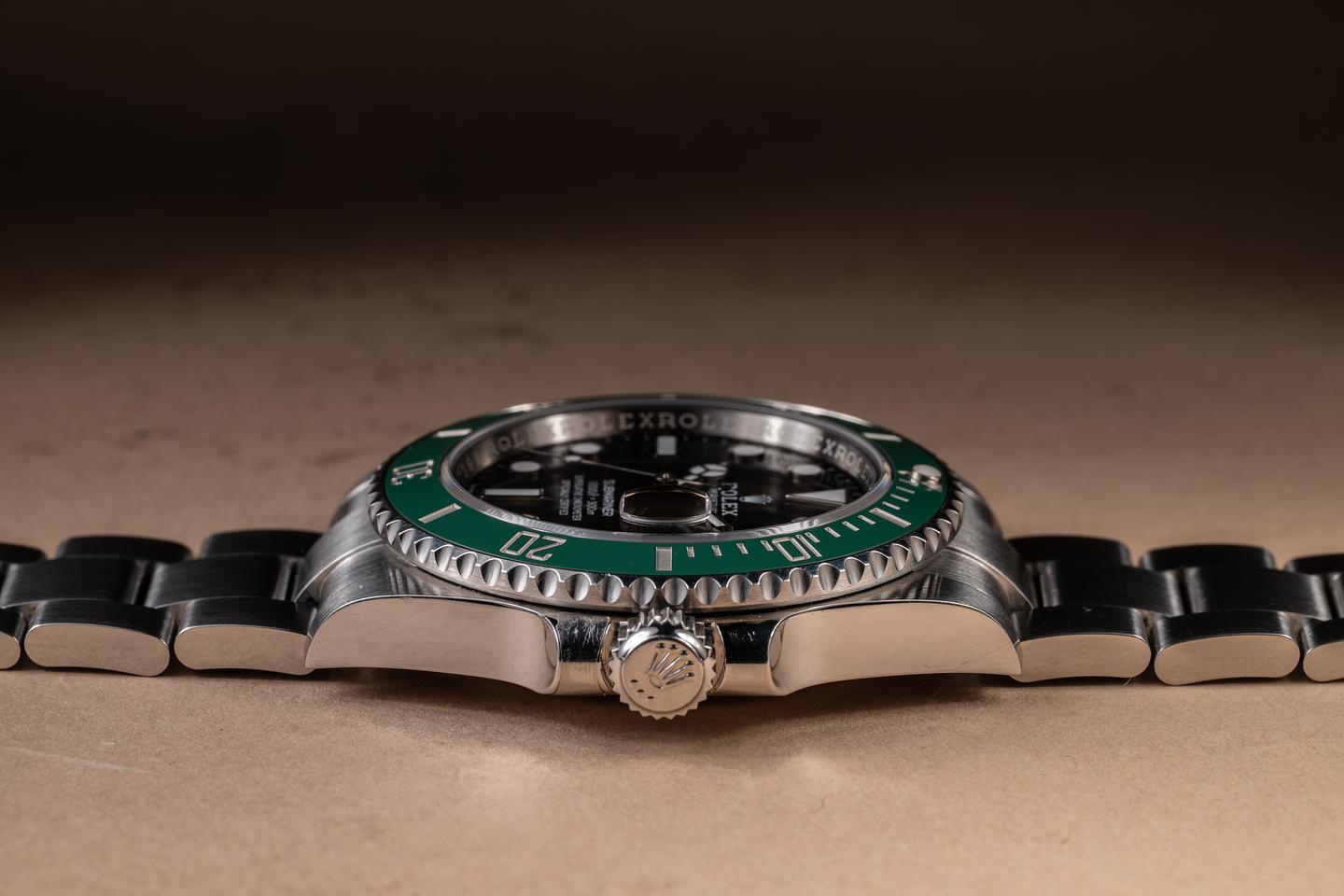 Case: The sharp, unpolished case is excellent, showing only very light wear from use. The Green ceramic bezel is also in excellent condition, showing no visible wear. There is one remaining factory protective sticker in place on the crown guard.