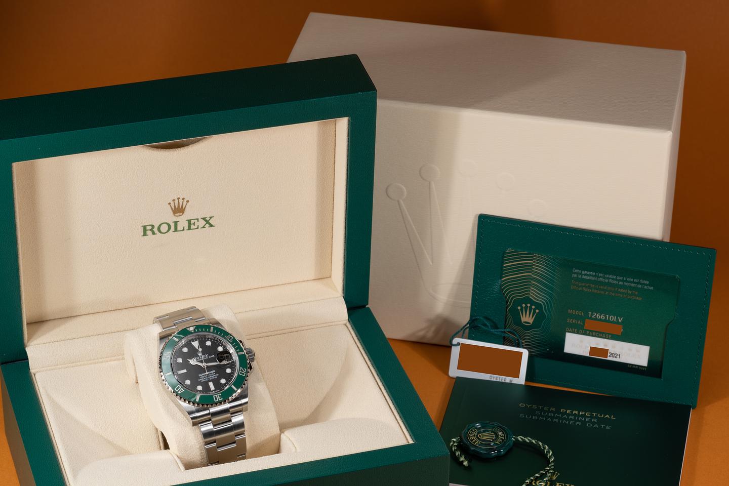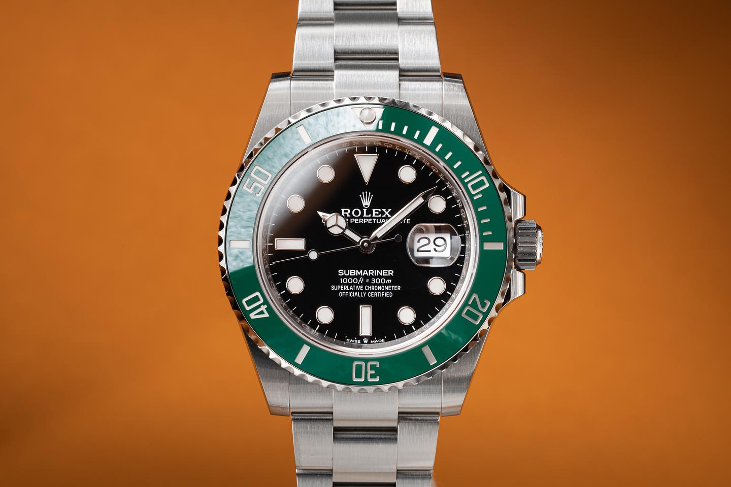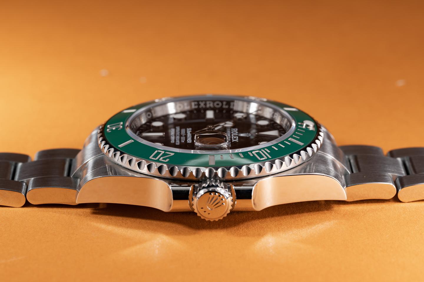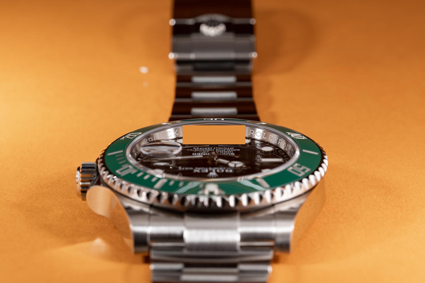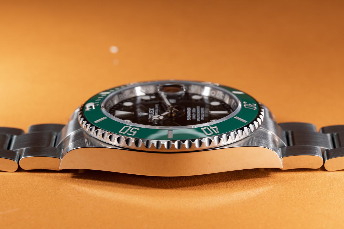 Case: The unpolished case is excellent showing only very light wear from use. The ceramic green bezel is mint.