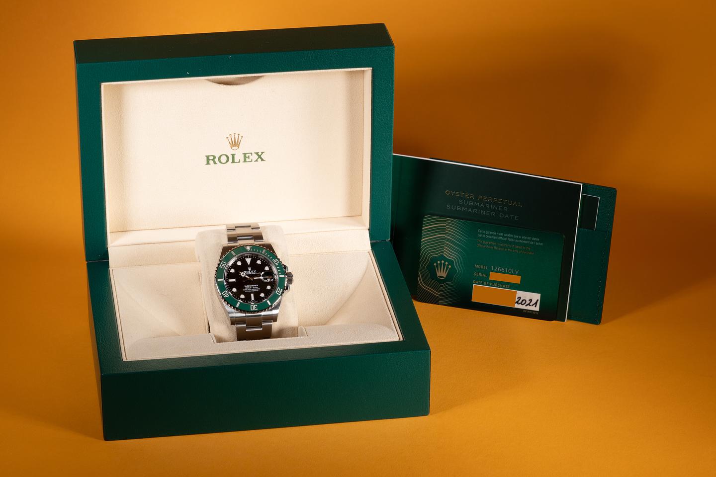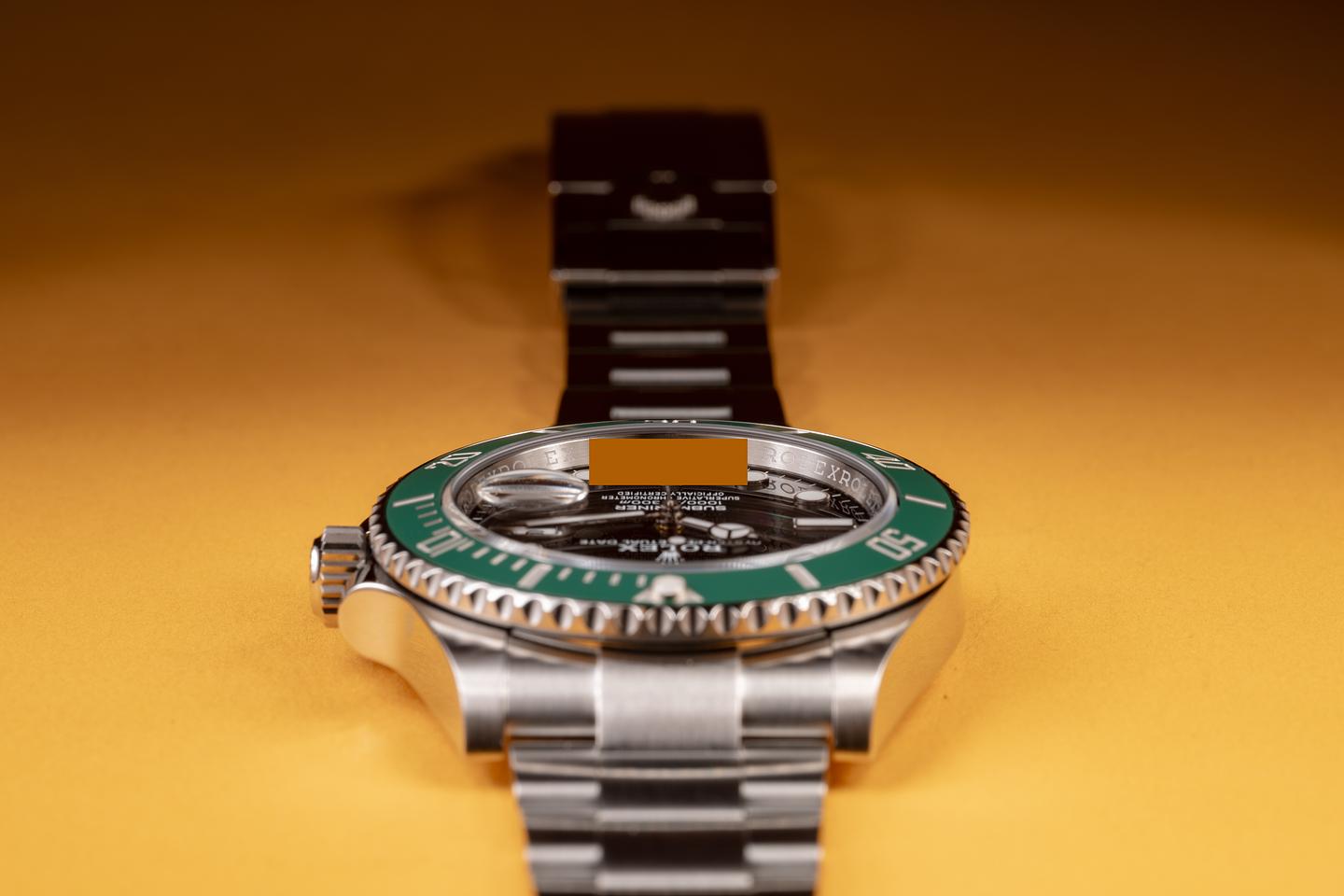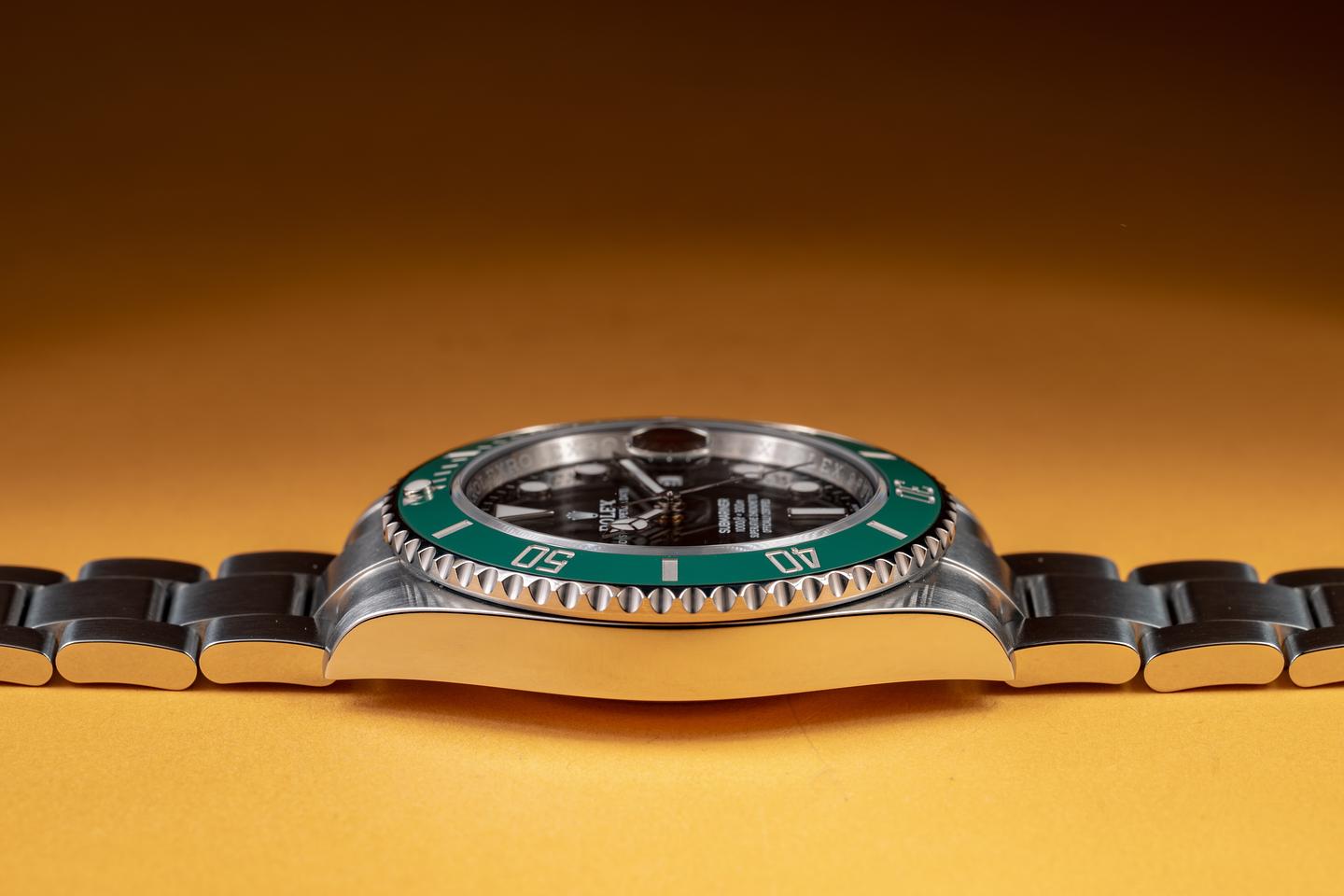 Case: The case is excellent, showing only very light wear from use. The green ceramic bezel is also in excellent condition, showing no visible wear.