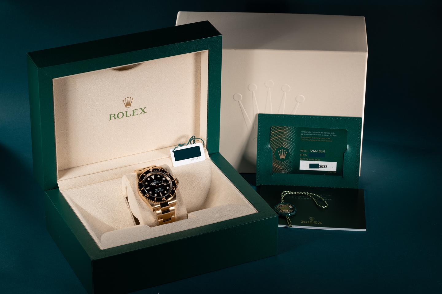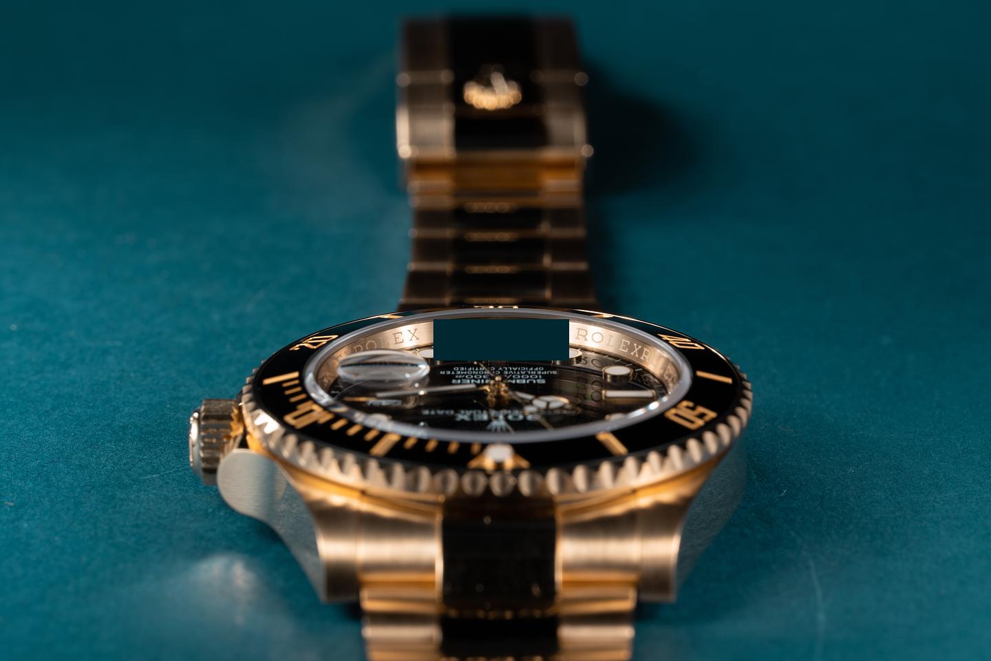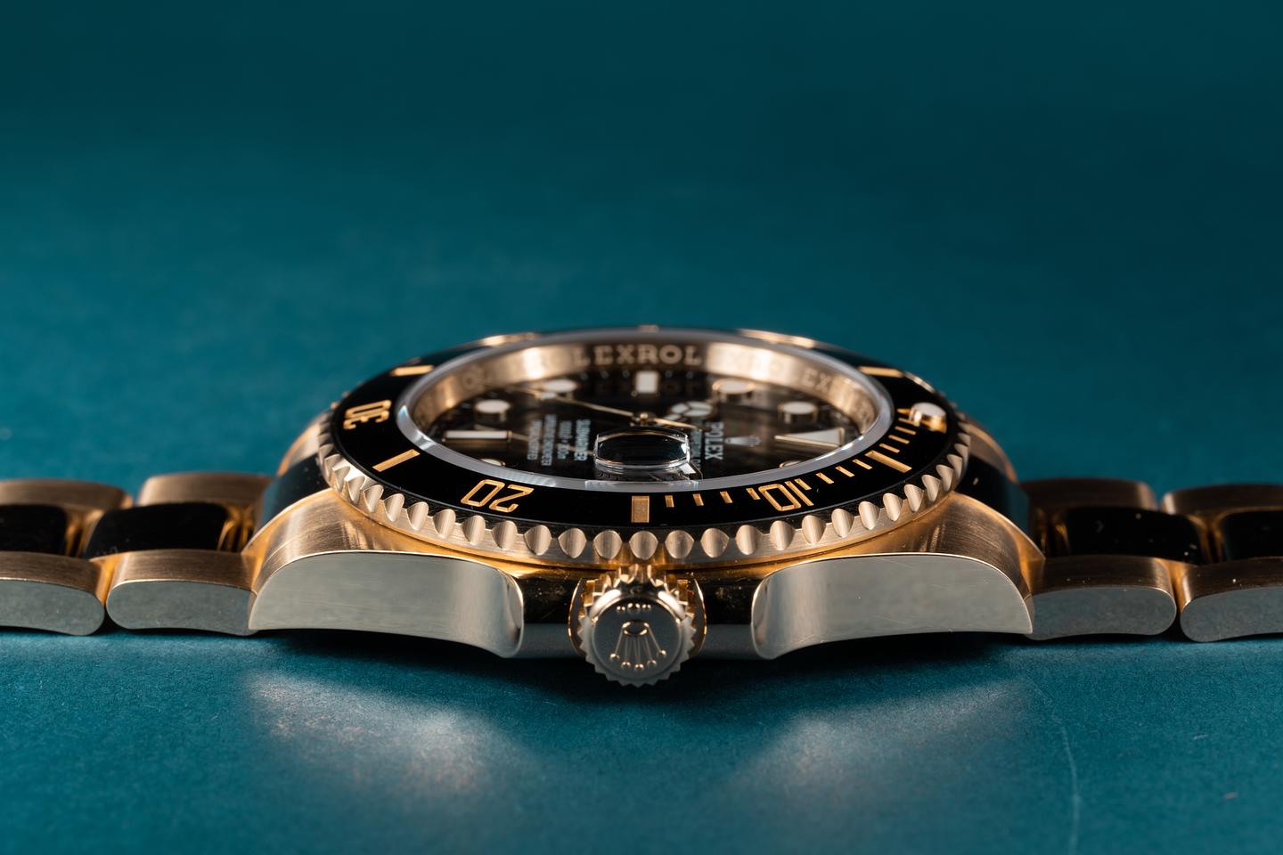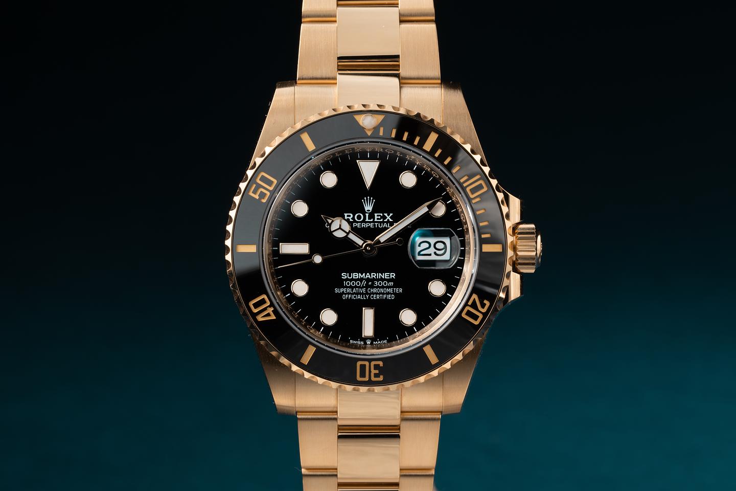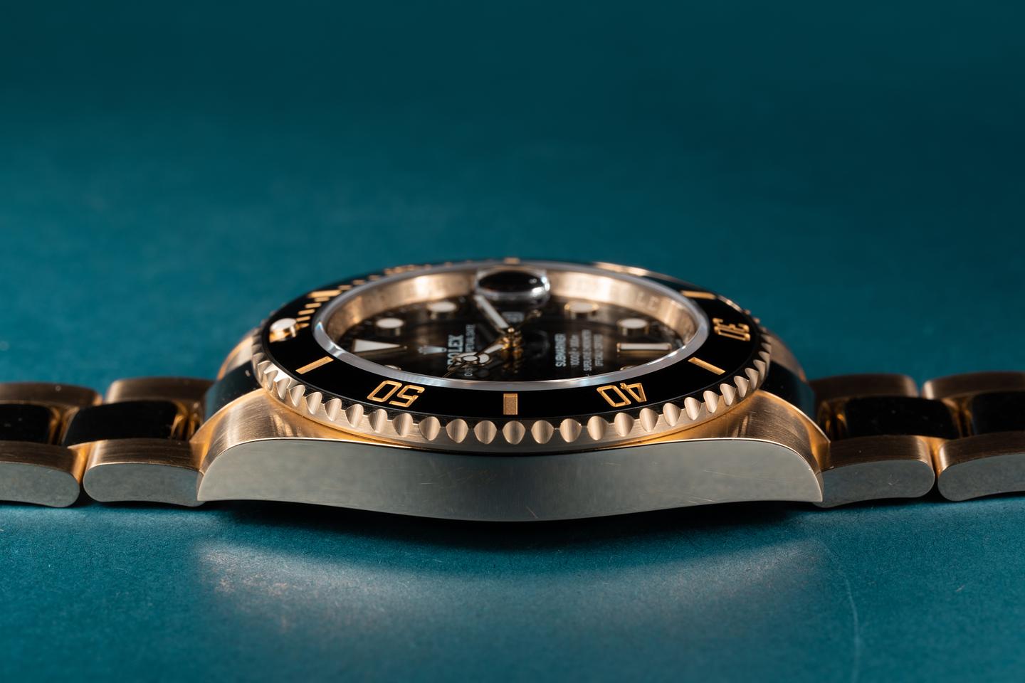 Case: The sharp 18k yellow gold case is excellent showing only extremely light wear from use. The black bezel insert is also in excellent condition showing no visible wear.
