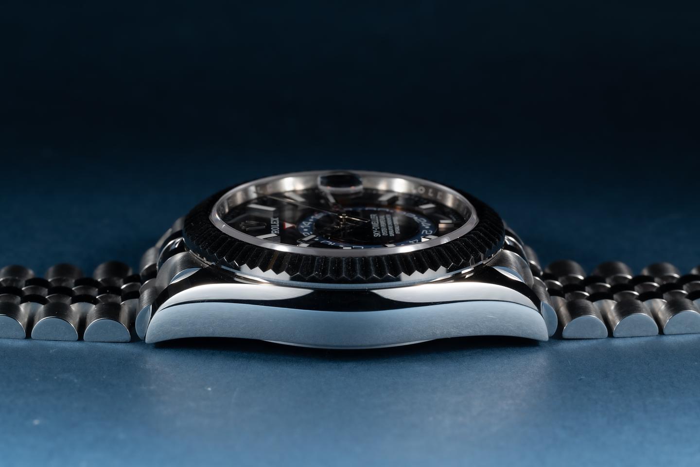 Case: The thick and even case is excellent showing only light wear from use. The sharp 18k white gold fluted bezel is also in excellent condition showing only light wear rom use.