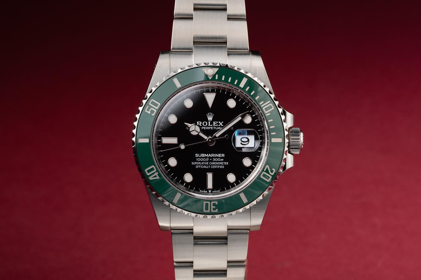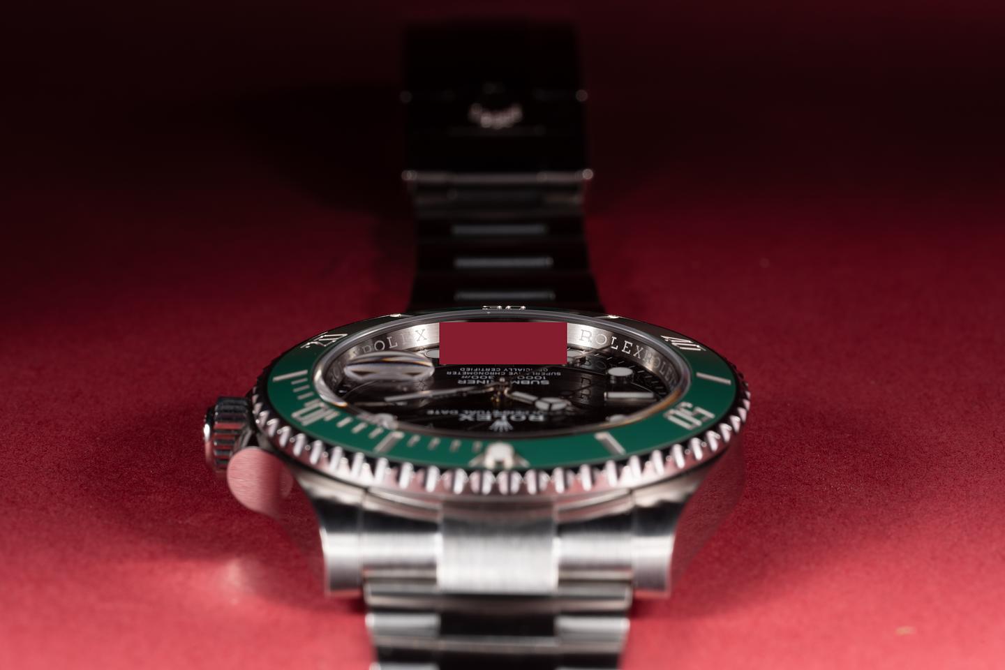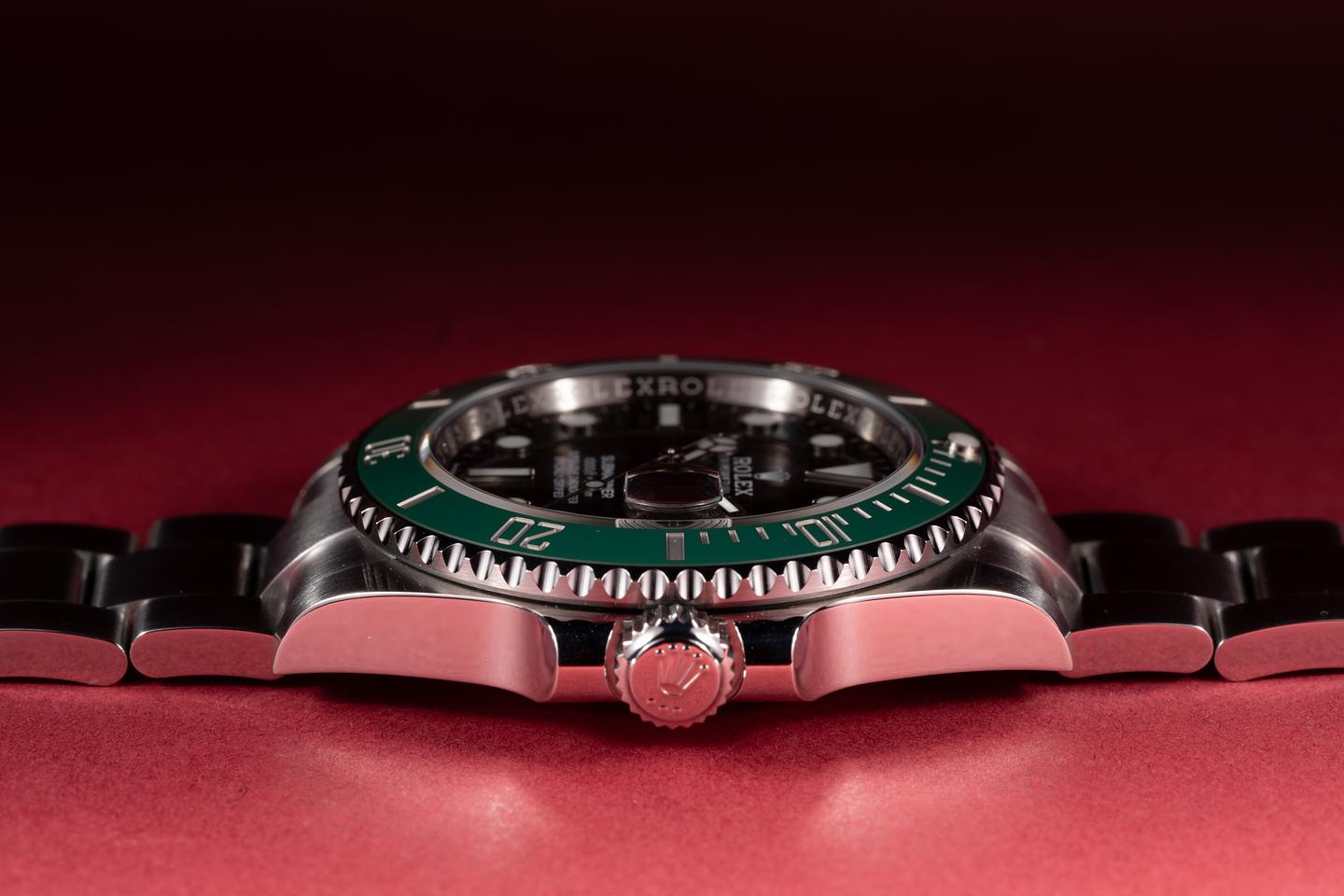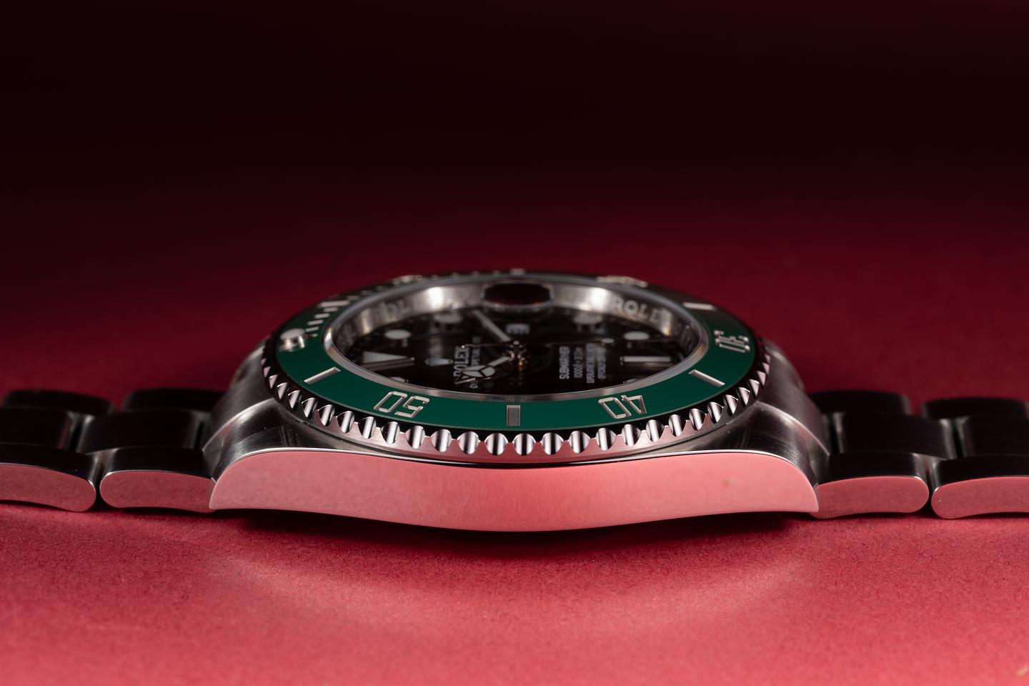 Case: The thick, sharp, and even case is excellent showing only very light wear from use. The green ceramic bezel is also in excellent condition showing no visible wear.