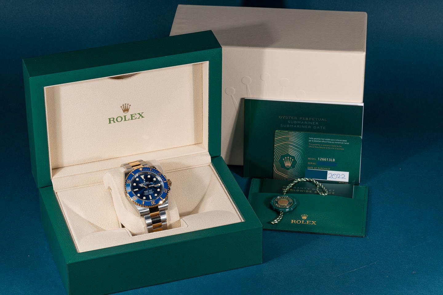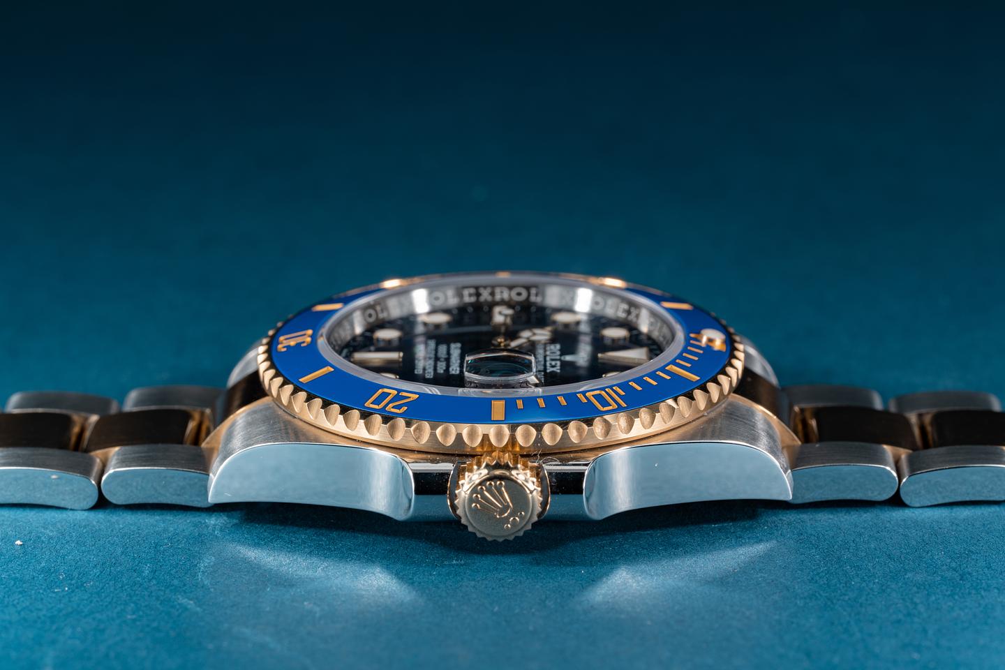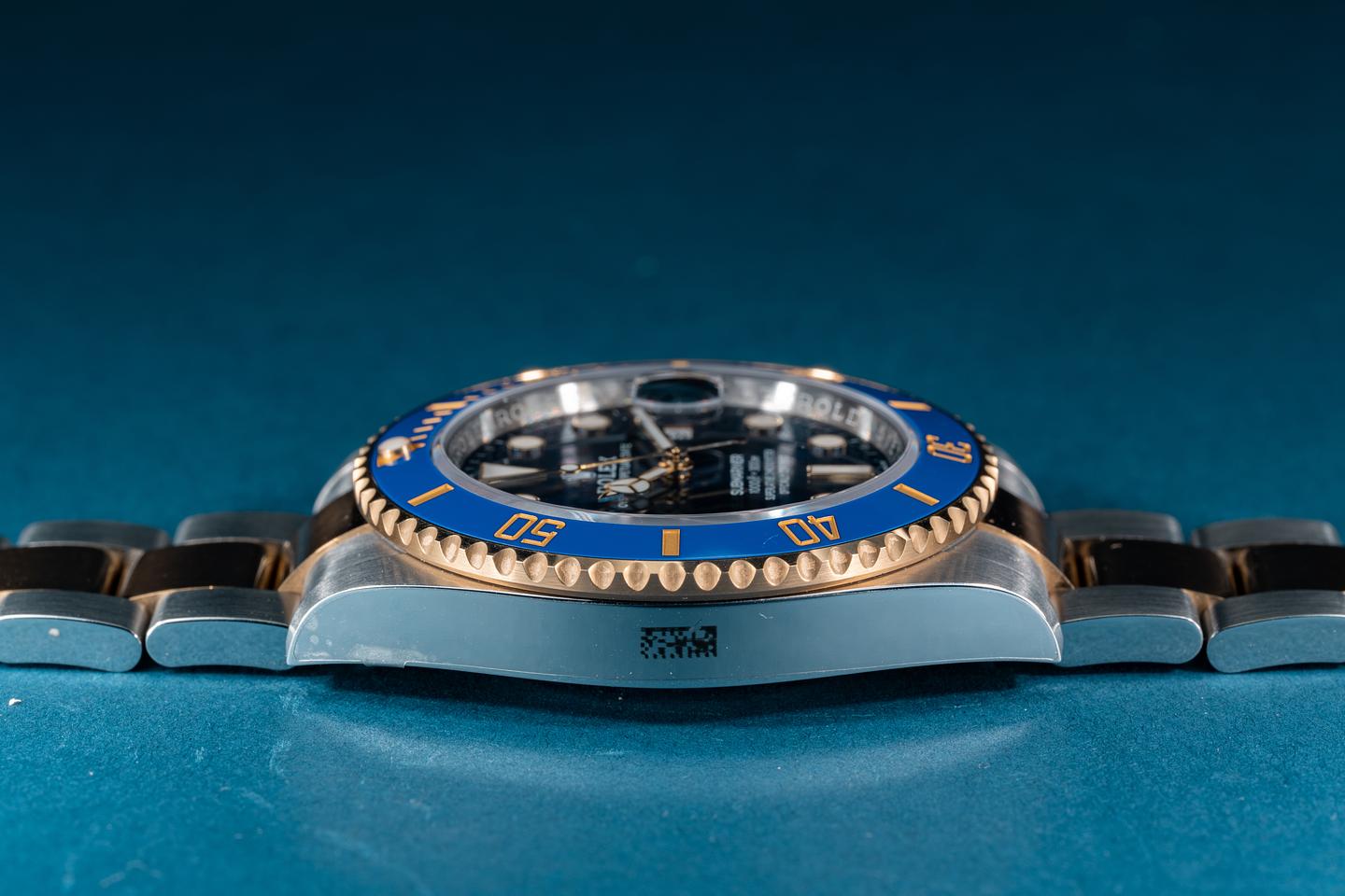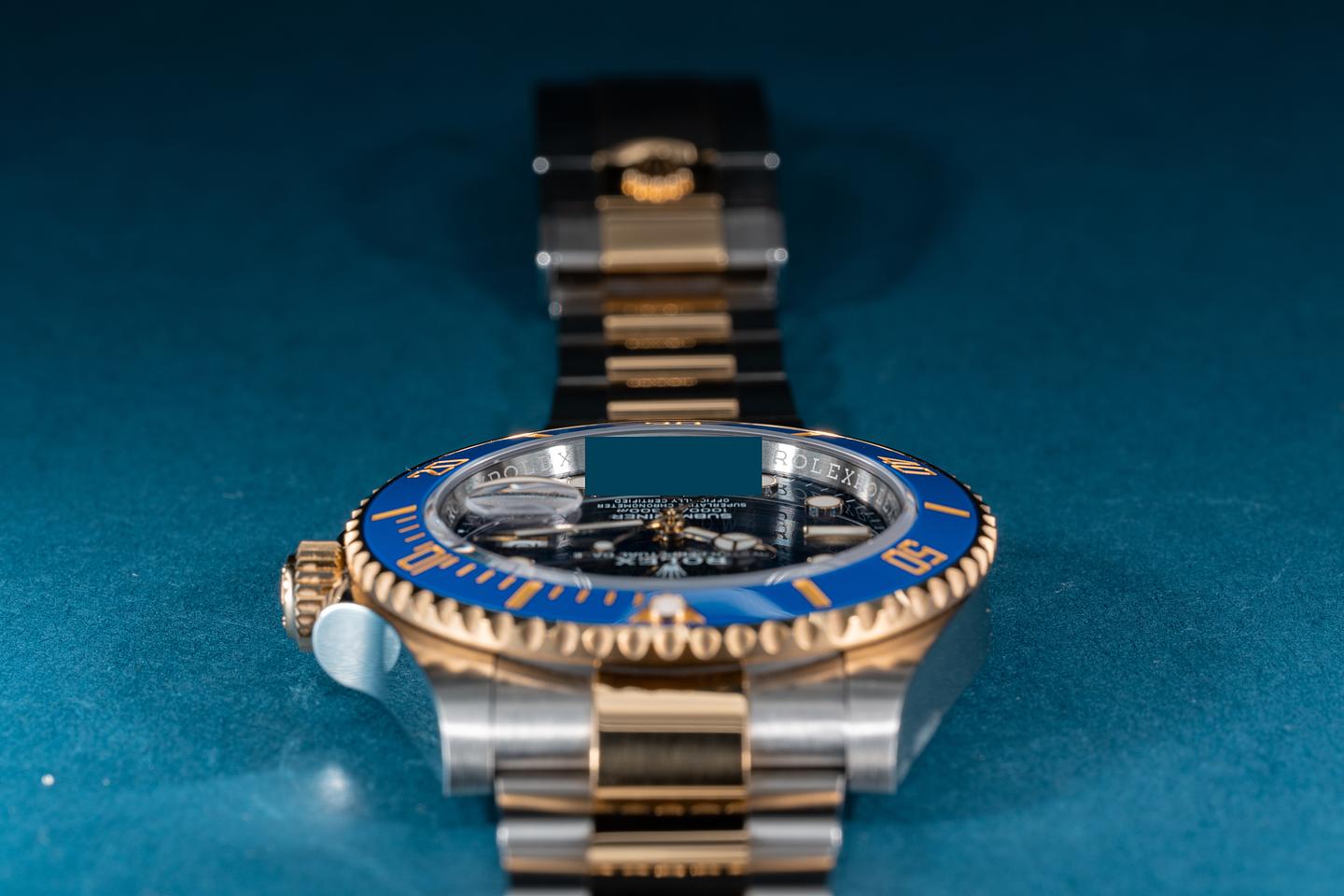 Case: The case is near mint showing only extremely light shop wear. There factory protective sticker is still in place on the left side of the case. The blue cerachrome bezel is mint showing no visible wear.