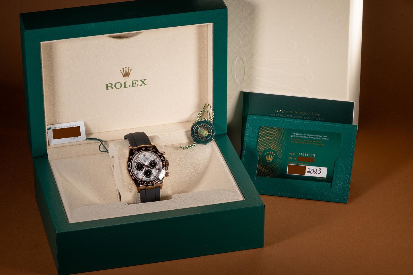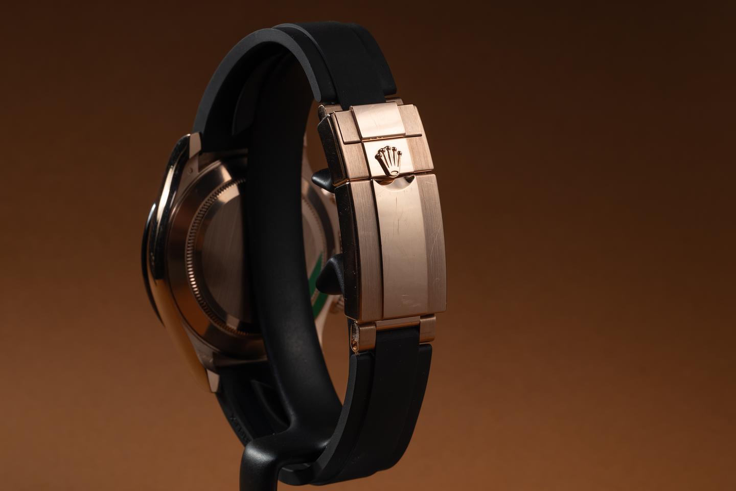 Bracelet: The Rolex Oysterflex strap is excellent, showing only very light wear from use. The 18K rose gold clasp is also in excellent condition, showing only light wear from use.