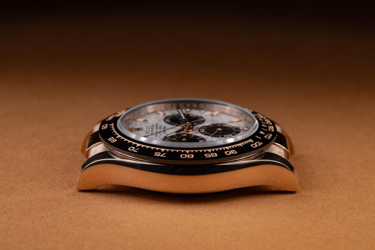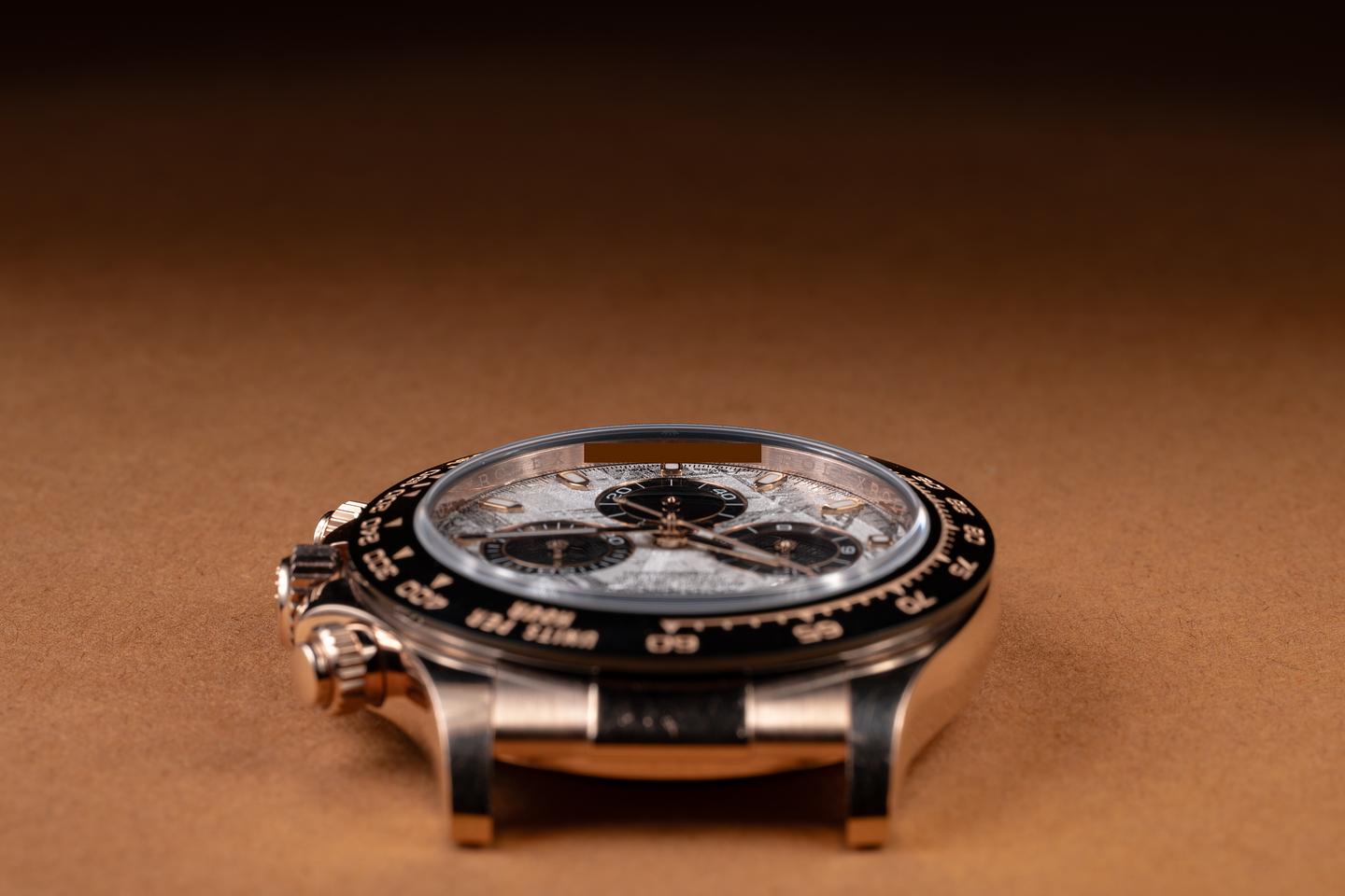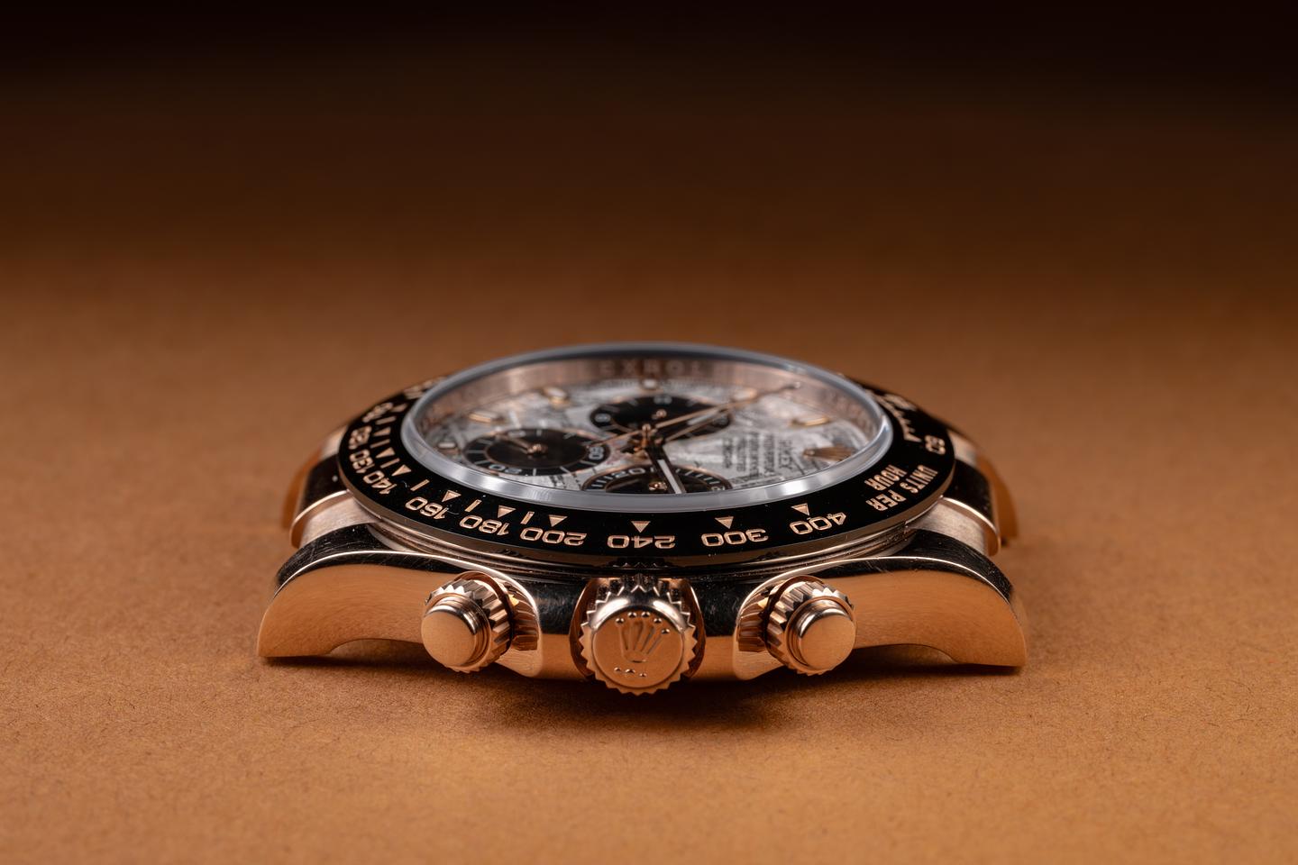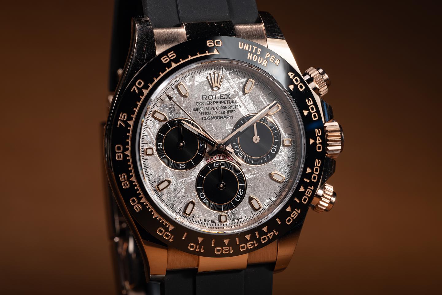 Notes Roughly 4 billion years ago, a meteoroid that was most likely formed as part of an exploding star or possibly in the molten core of a doomed asteroid began its millennia-long journey towards Earth. Three billion four hundred million years later, that meteoroid hits earth's atmosphere over what we now call Namibia, breaking into small pieces as it fell to the surface. Six hundred million years after that event (give or take a few years), Rolex purchased some of the pieces from this ancient space-faring traveler and crafted them into some of the rarest and most certainly the oldest dials in existence.