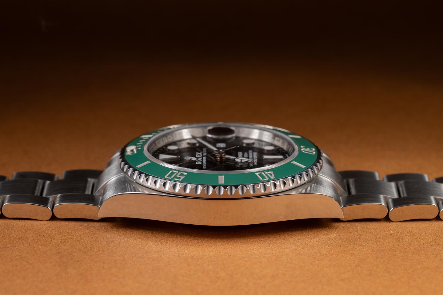 Case: The thick, sharp, and even case is excellent, showing only very light wear from use. The green bezel is also in excellent condition, showing no visible wear.