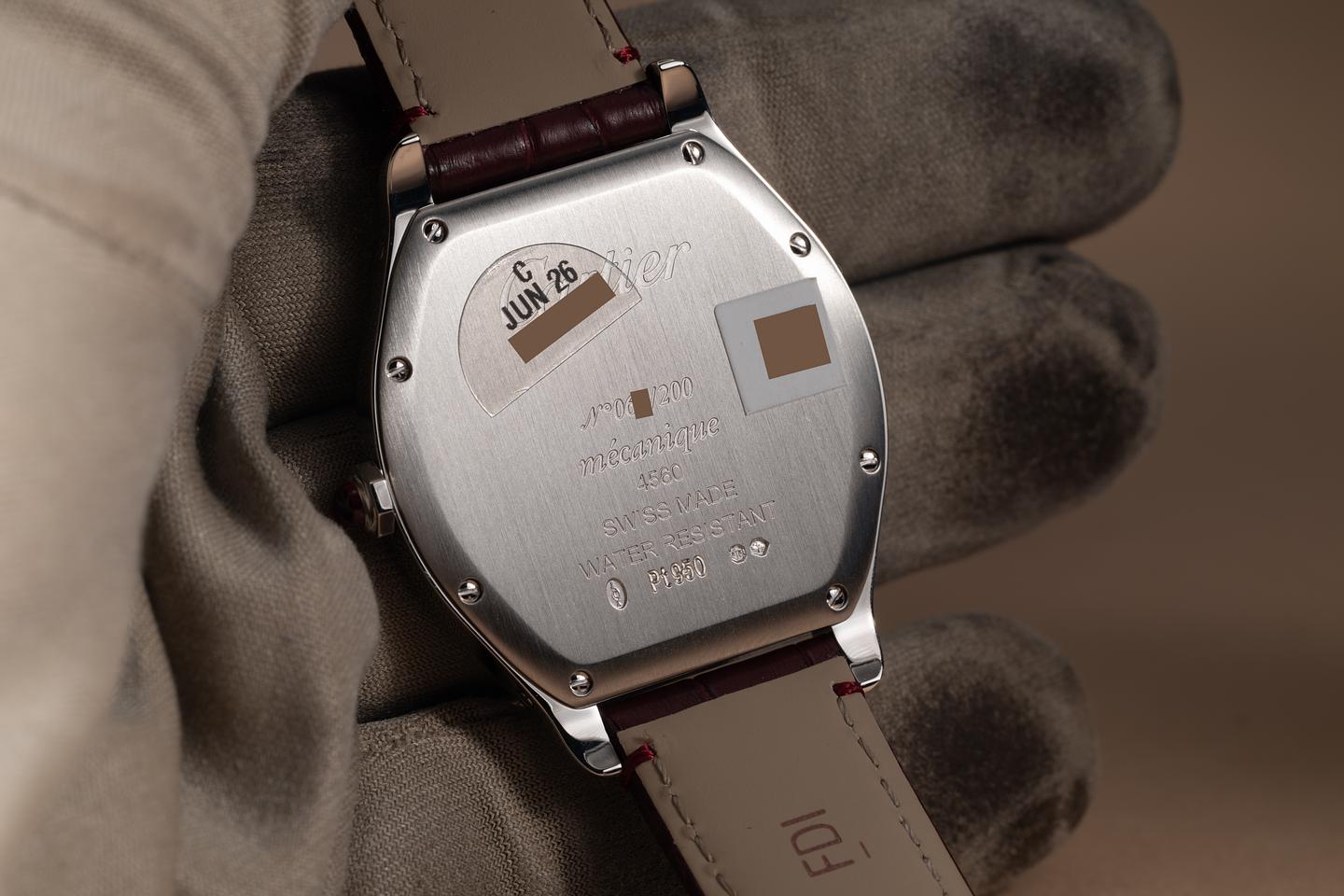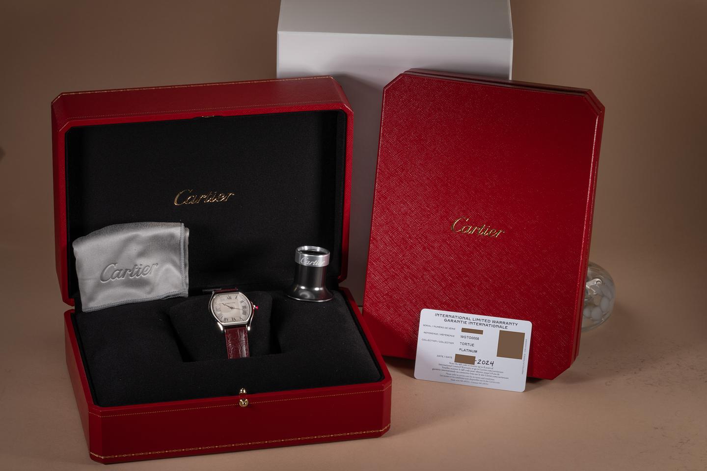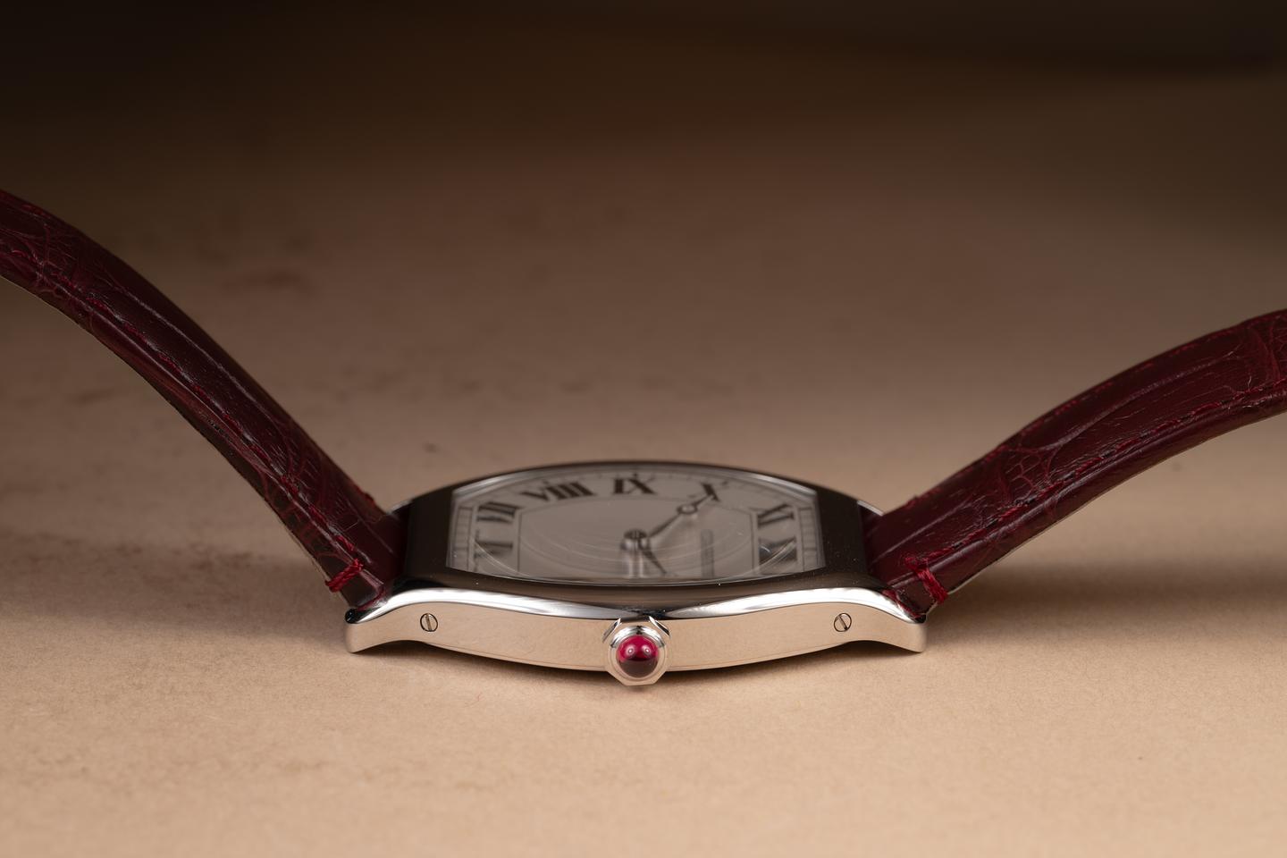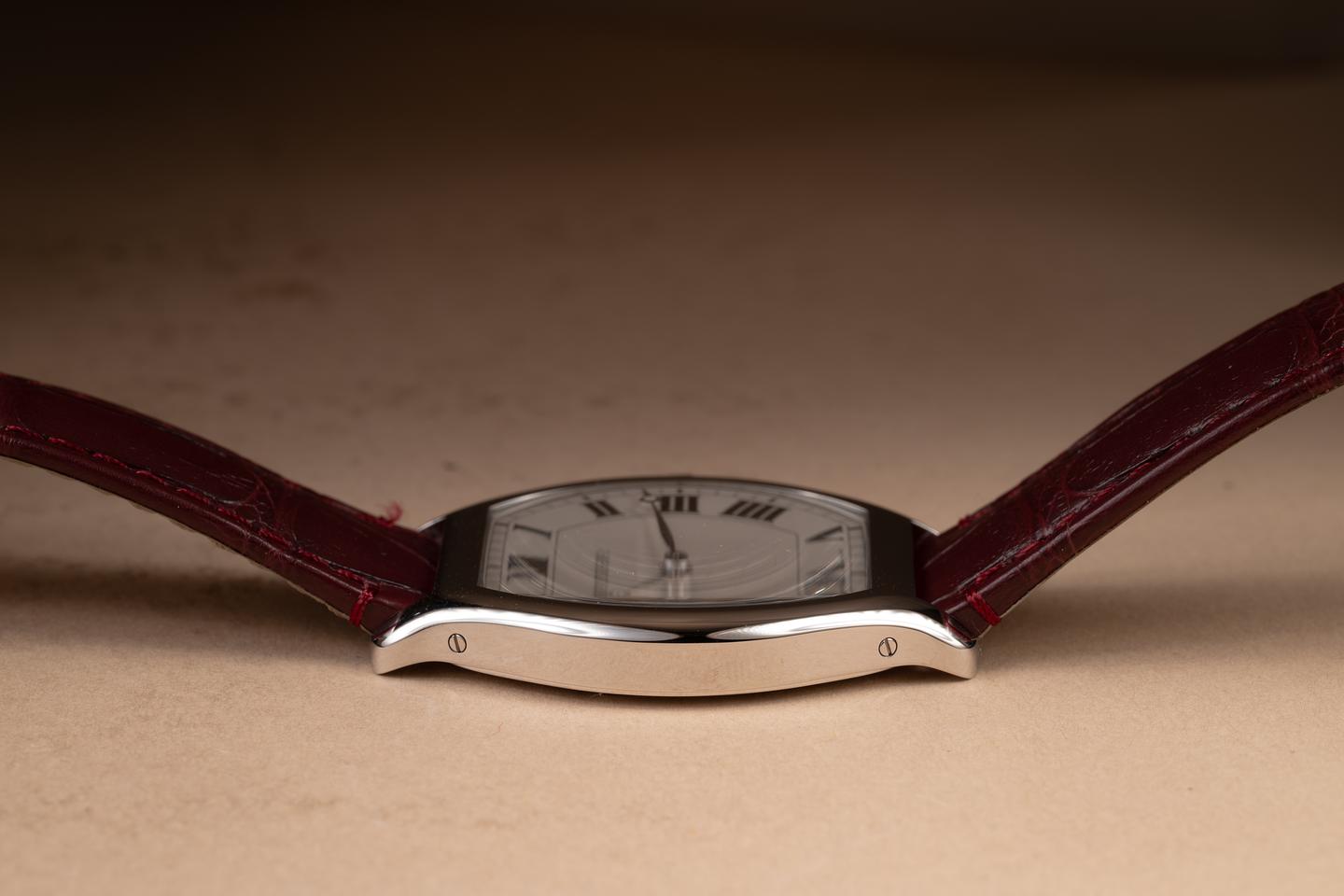 Case: The 33mm platinum case is in mint unworn condition with the factory sticker still in place. The crown is set with a ruby cabochon.
