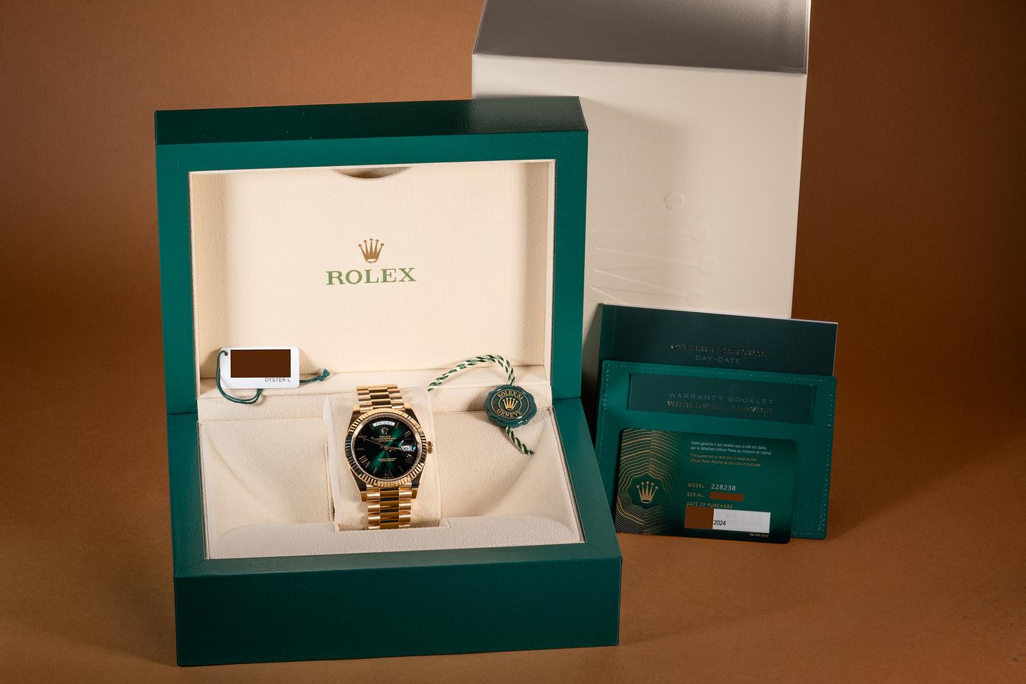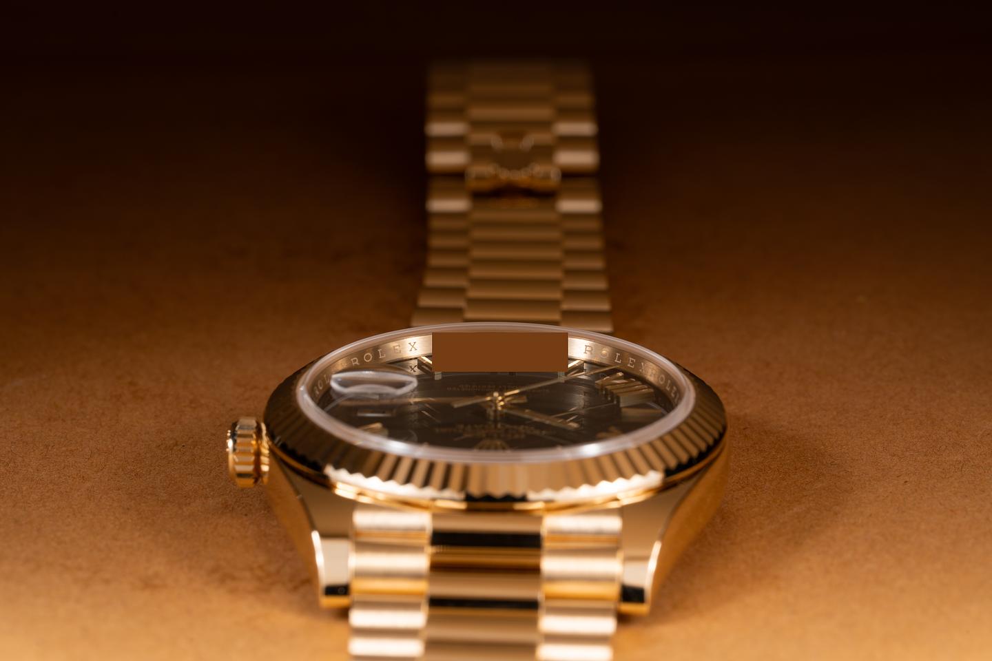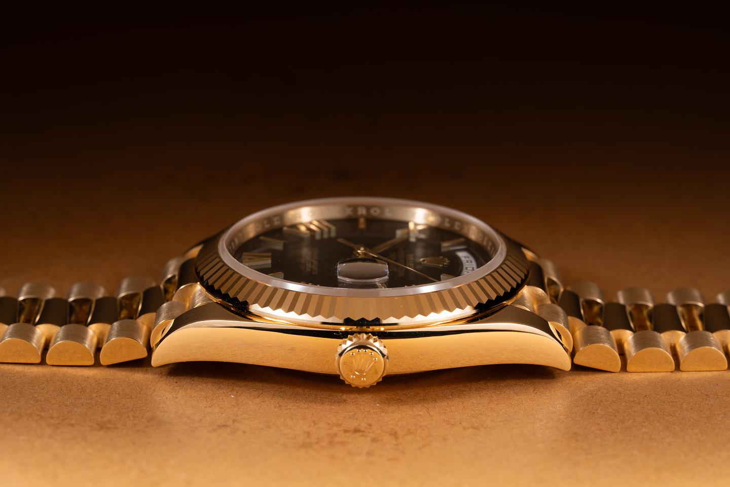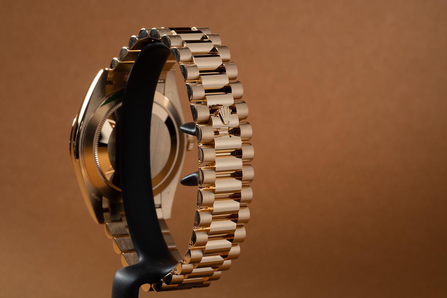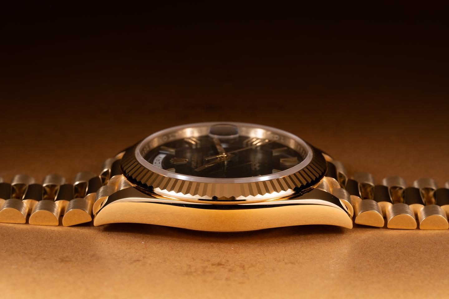 Case: The 40mm 18K yellow gold case is excellent showing only very light wear from use. The sharp 18K yellow gold fluted bezel is also in excellent condition showing only extremely light wear.